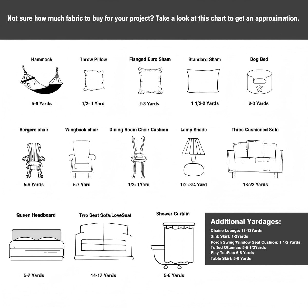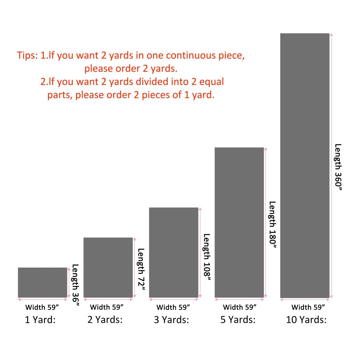 One piece of fabric: 1 Yard Fabric Length 36" Width 59". Every 1 quantity equals to 1 yard. Each qty is cut in separate pieces as a continuous 1 yard of fabric each.
