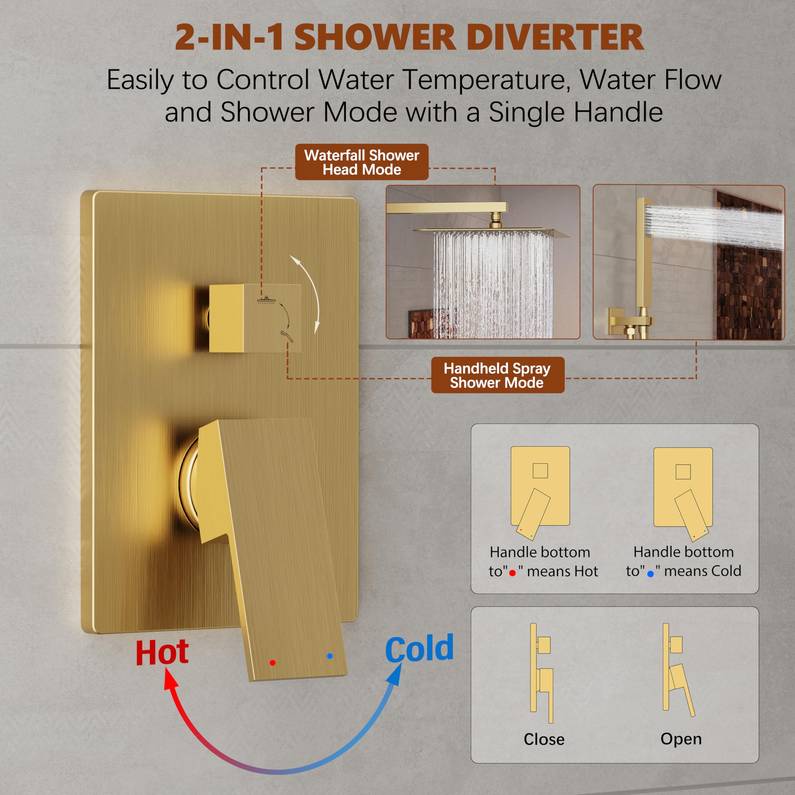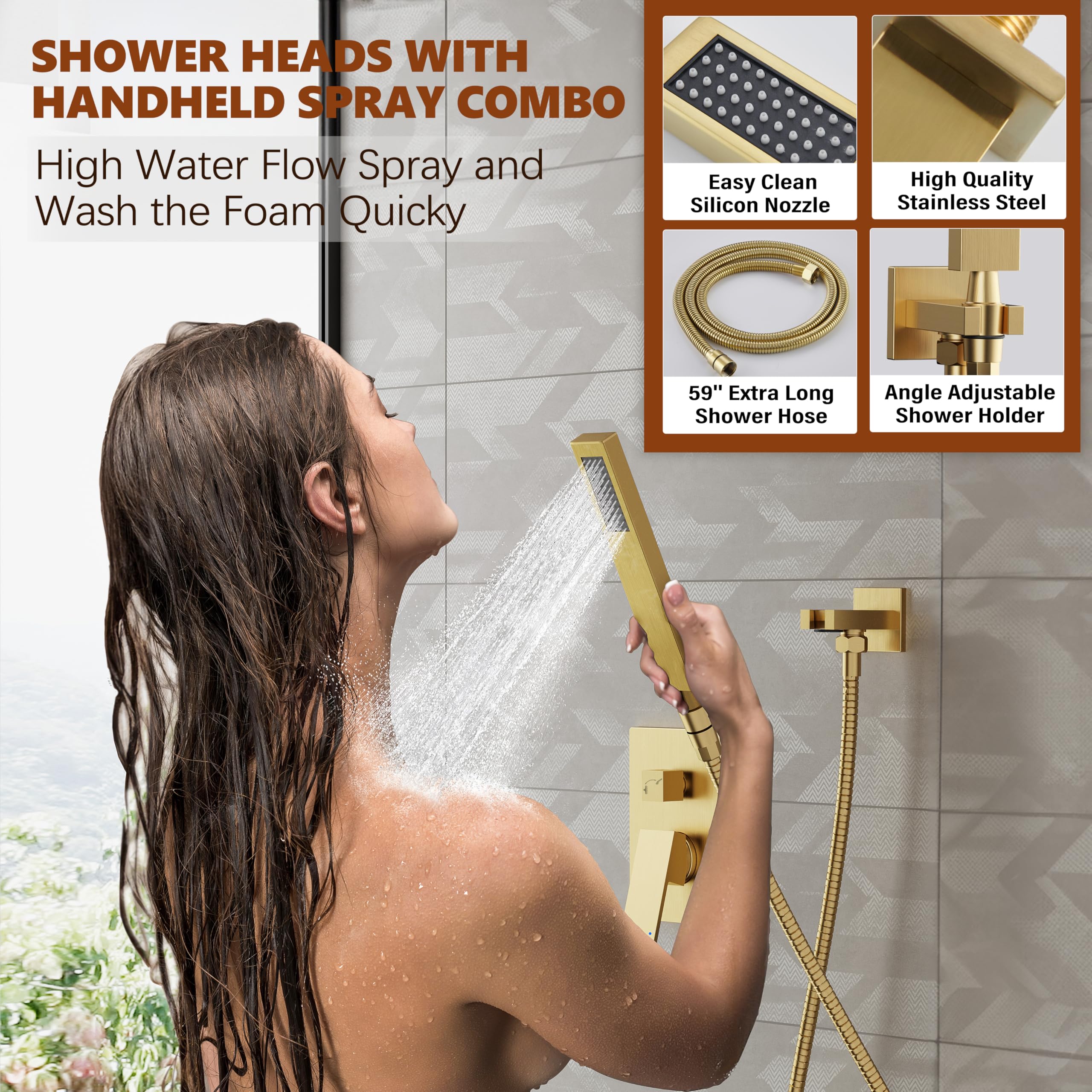 Shower Head with Handheld Combo: Our wall mounted shower faucets sets complete includes gold shower head, hand held shower head with long hose, shower valve, shower trim, shower arm, shower holder and 2-in-1 diverter.