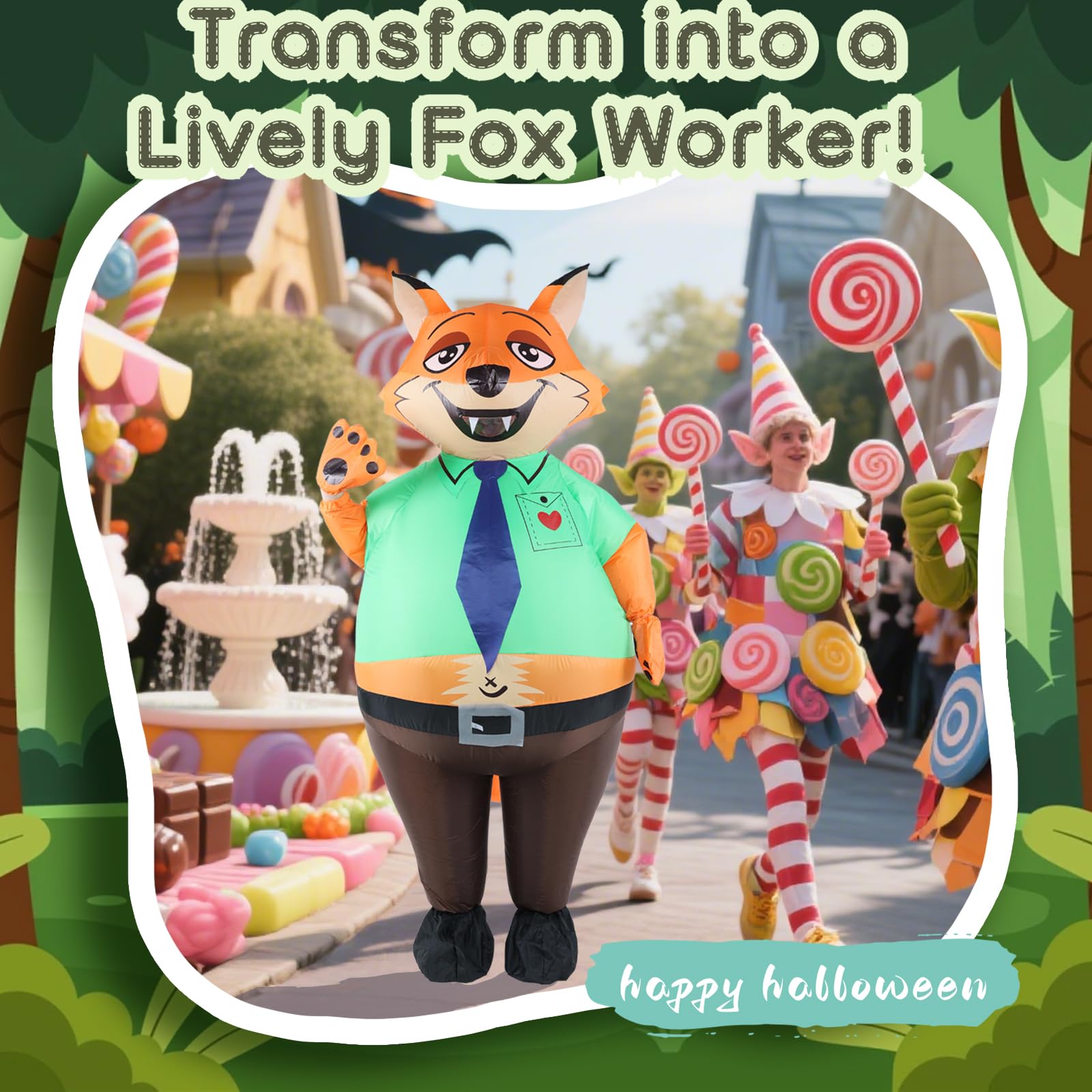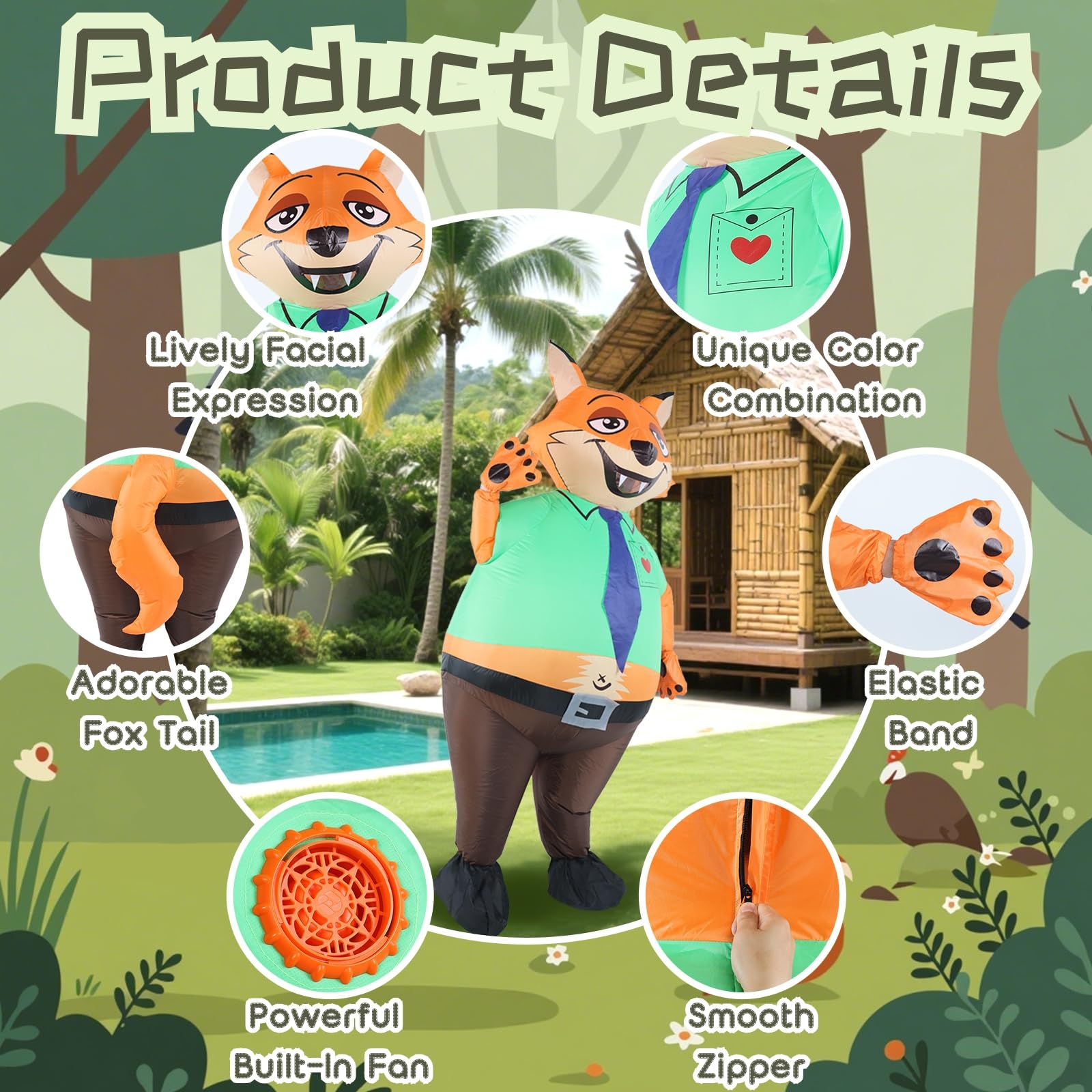 Inflatable Fox Costume: Step into this eye-catching inflatable fox costume and become a cheerful, clever fox with a bright orange body and a friendly smile! With a wagging tail, green shirt, brown pants, and a dapper necktie, this fun, whimsical look is one you wonβt forget! The vivid colors and lifelike design bring the magical charm of a storybook fox to life. Get ready to steal the show as the smartest, most stylish fox aroundβbrimming with fun, charm, and personality