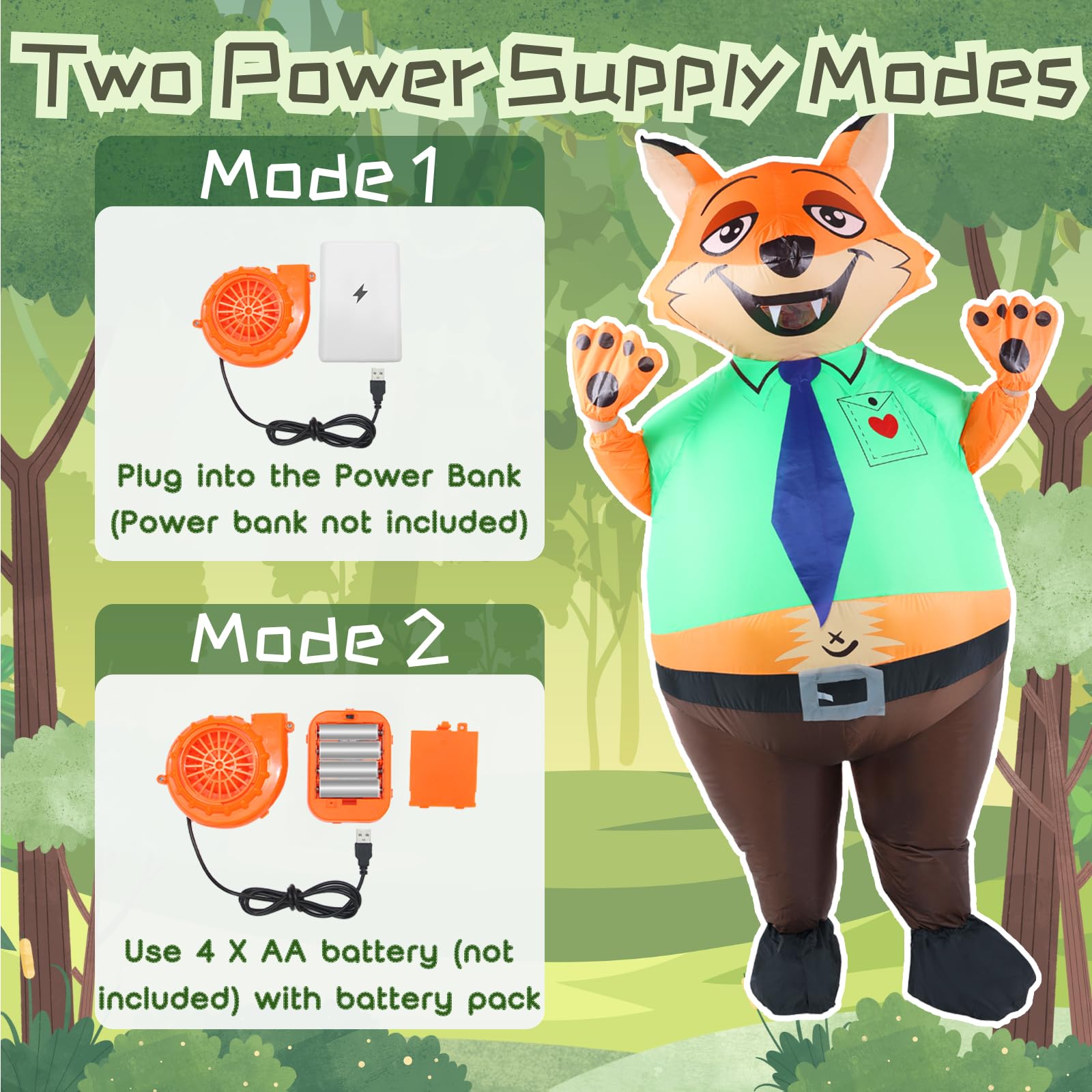 Complete Set: This inflatable fox costume comes with everything you need to get startedβ1 inflatable suit, 1 pair of gloves, 1 fan, and 1 battery pack. Power it up with 4 AA batteries or a portable power bank for quick and easy inflation. (Please note: batteries and power bank are not included.) For your safety, do not place the battery pack in your pocket, as it may overheat and cause burns. Enjoy the fun with peace of mind and all the essential pieces included