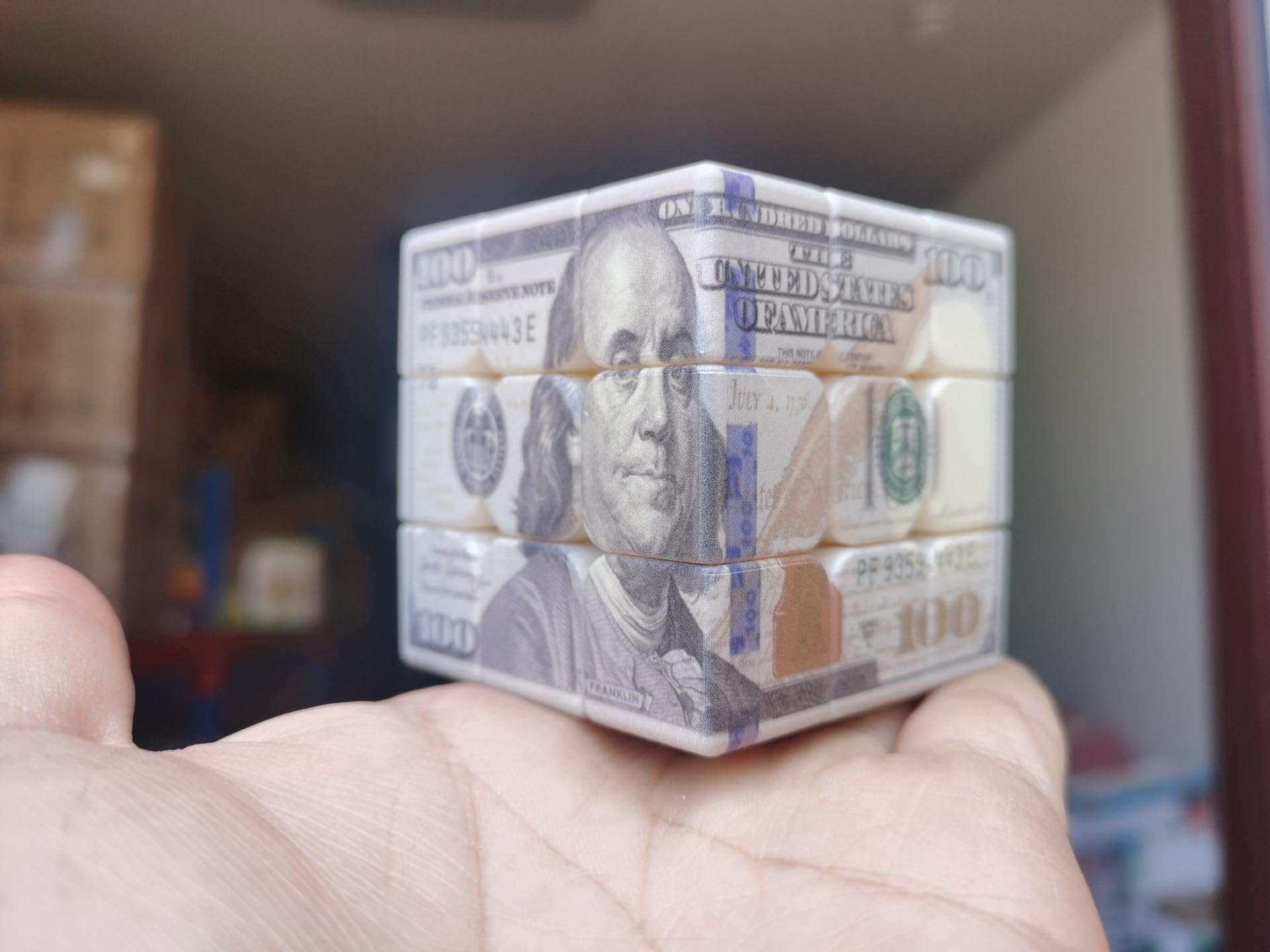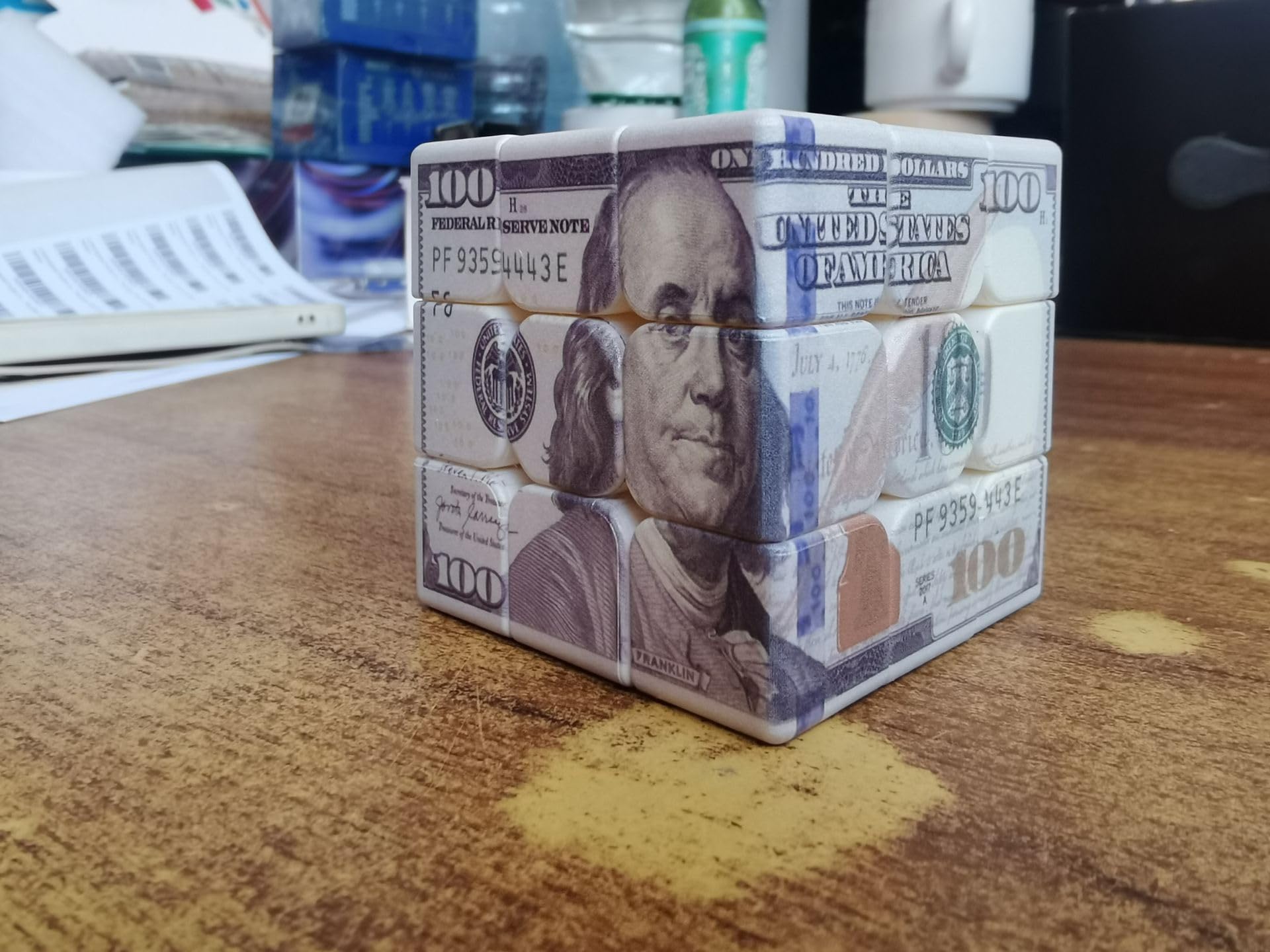 The Dollar Cube is a 3x3 with the image of a US dollar bill printed on adjacent faces. There are three total dollars printed on the puzzle.