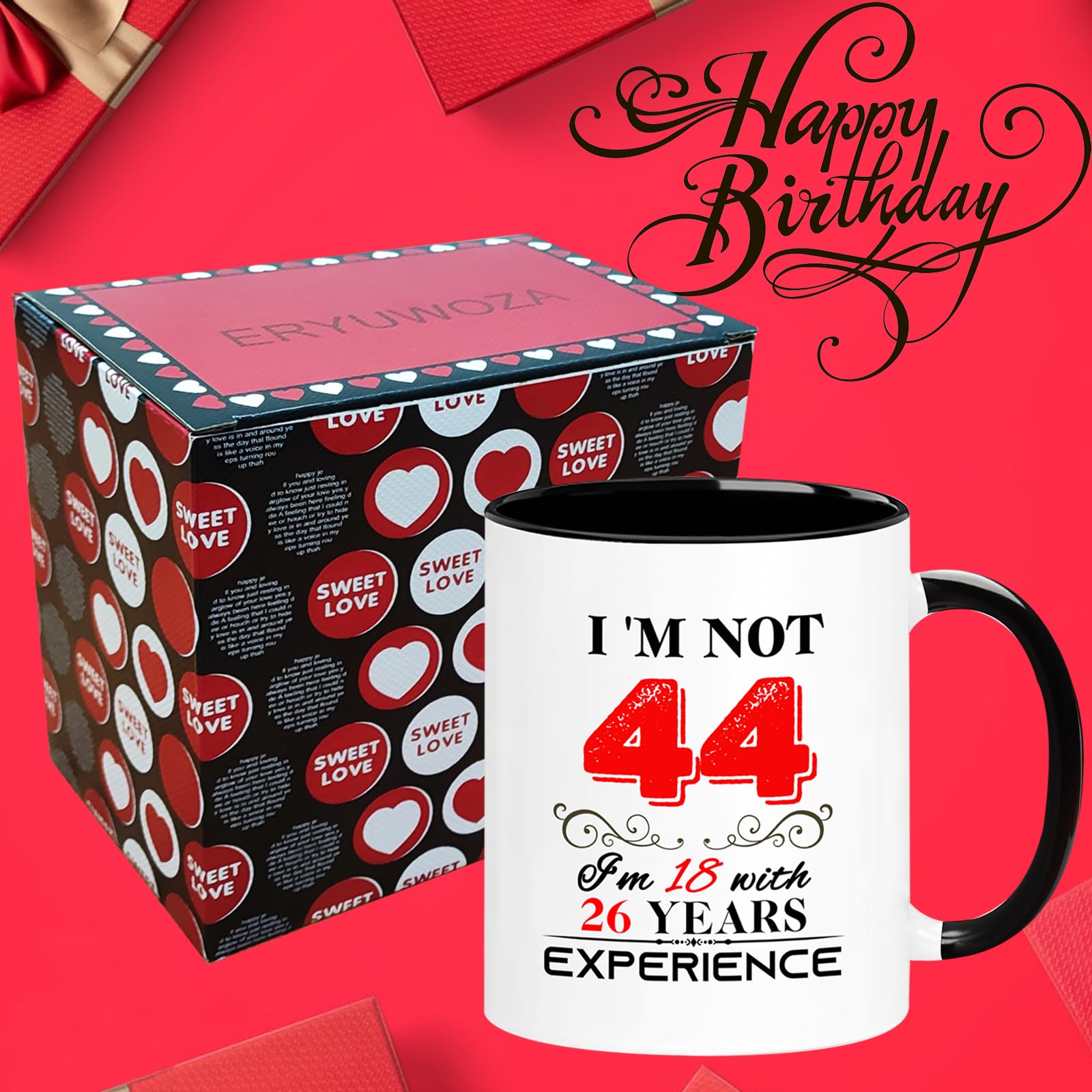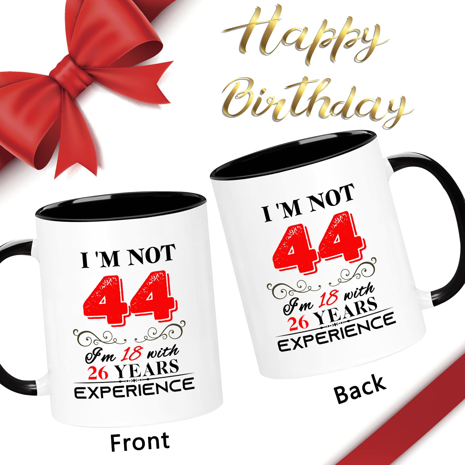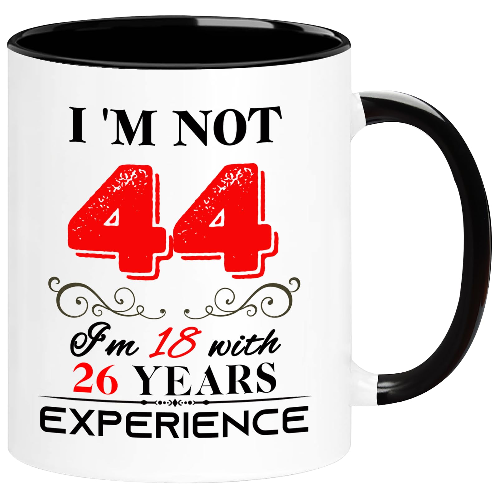 【Birthday Gift】: This funny "I'm not 44, I'm 18 with 26 years experience" Mug is the perfect birthday gift for a 44 year women men! Give it to your mom, dad, papa, mama, brother, sister, husband, wife, aunt, uncle, cousin, son, daughter, boyfriend, girlfriend, boss, coworkers, bestie, granddaughter, or your best friend for her he birthday.