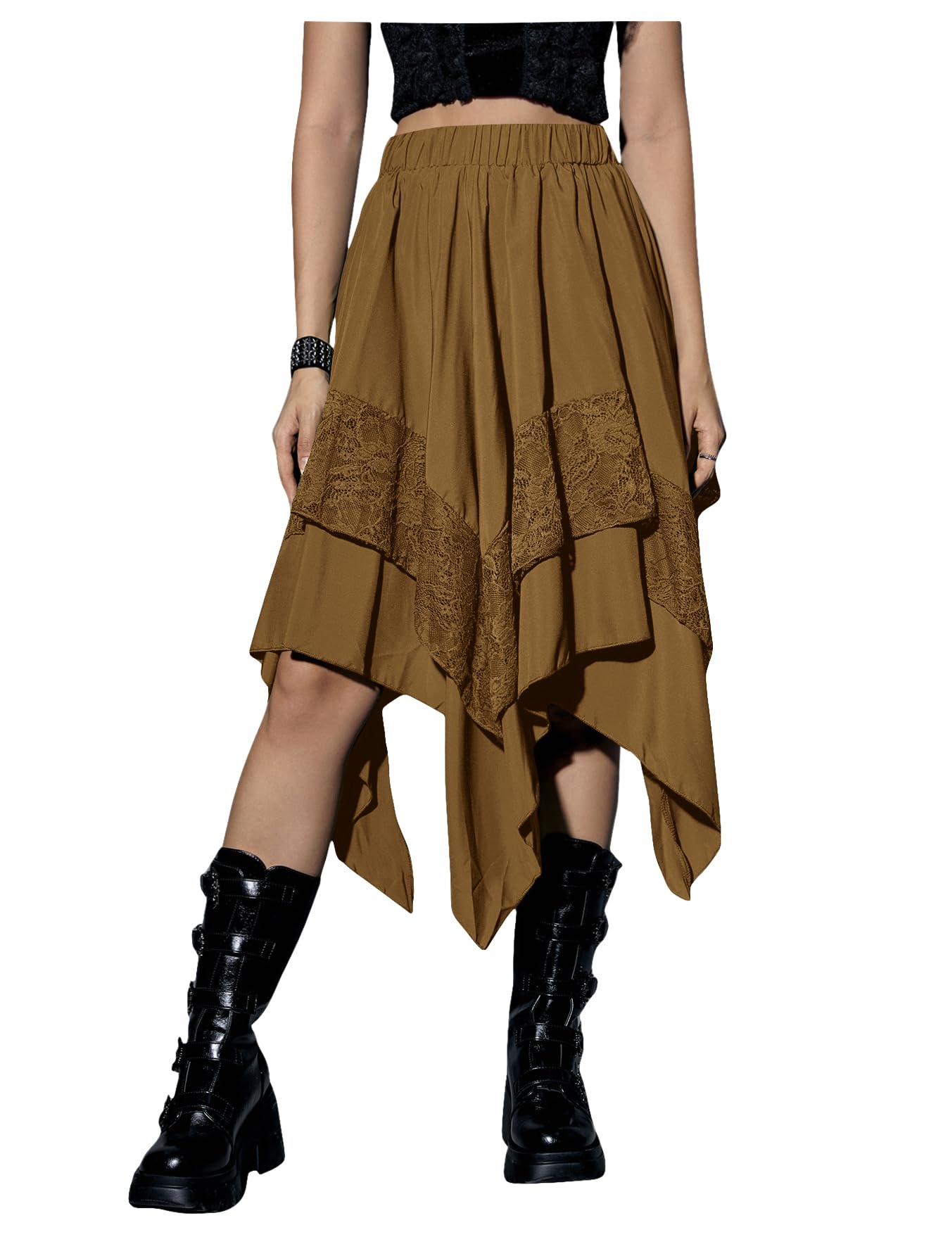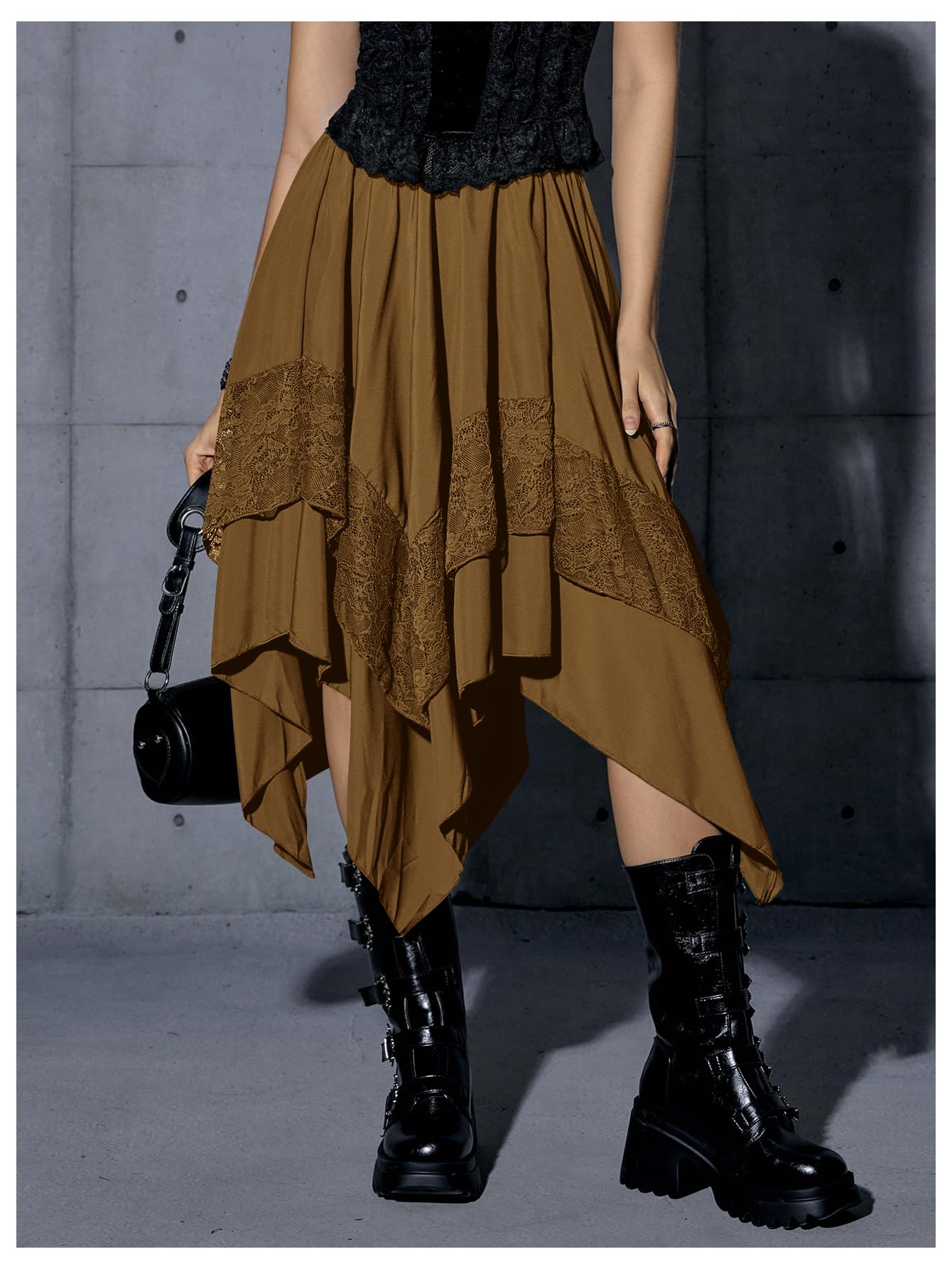 Elastic Waist, Lace Trim, Asymmetrical High Low Hem, A Line, Flowy, Gothic Steampunk Skirt, Casual Midi Skirt