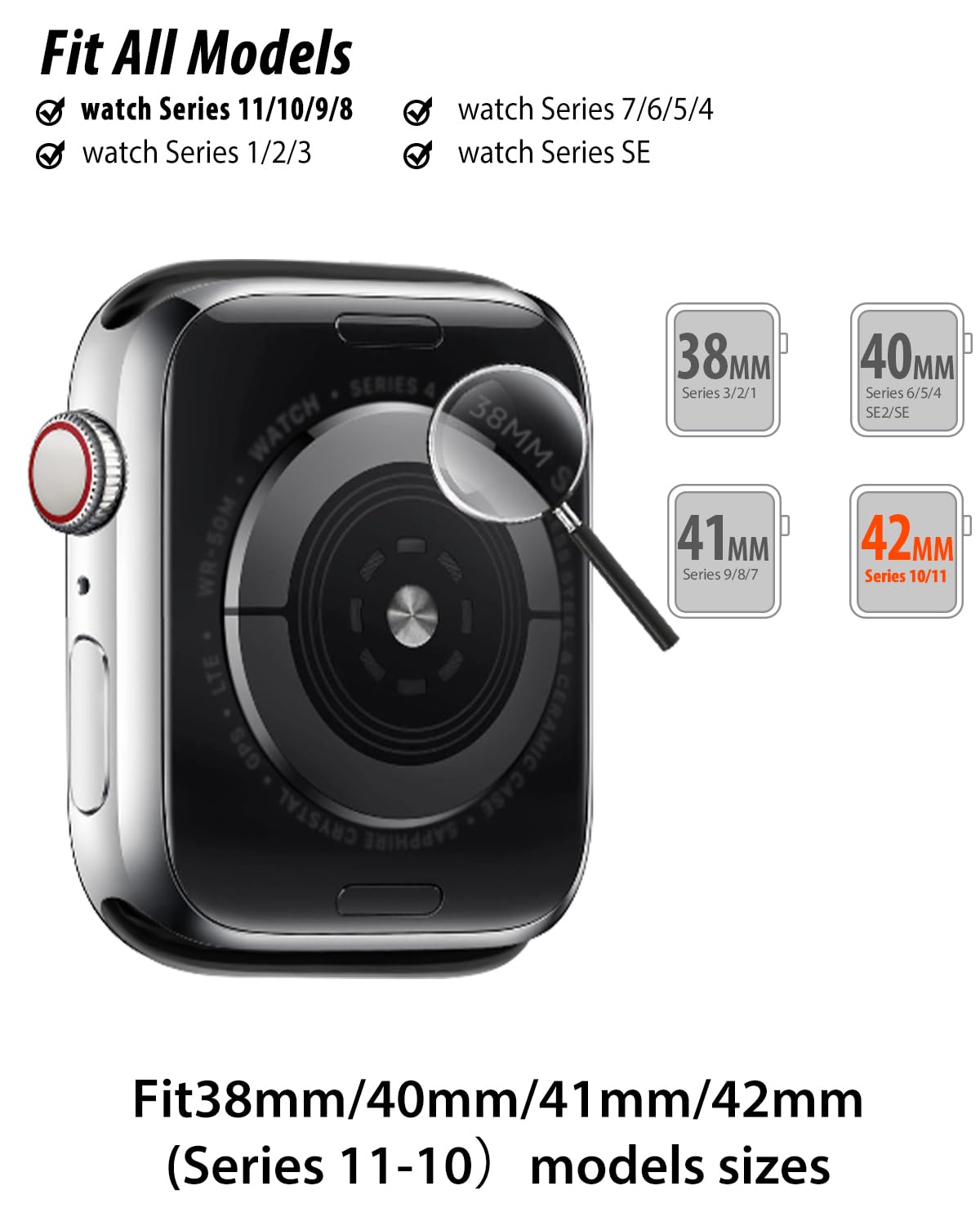 Description Sunnywoo Nylon Sport Bands Compatible Models: 49mm 46mm 45mm 41mm Bands Compatible with New Apple Watch Series 10/(2024), Series 9/Ultra2(2023), Series 8/Ultra (2022) ,Series 7(2021) 44mm 40mm Bands Compatible with Apple Watch SE & Series 6 (2020) 44mm 40mm Bands Compatible with Apple Watch Series 5 (2019) & Series 4 (2018) 42mm 38mm Bands Compatible with Apple Watch Series 3 (2017) & Series 2 (2016) & Series 1 (2015) Two Wrist Size (Flexsible adjustment): 38mm/40mm/41mm/42mm(series 10) Size fits for 5.5" - 7.6" (140mm - 195mm) wrist 42mm(series 1 2 3)/44mm/45mm/49mm Size fits for 6.3" - 8.6" (160mm - 220mm) wrist. Features: Multi-color,nylon,comfortable,lightweight,breathable