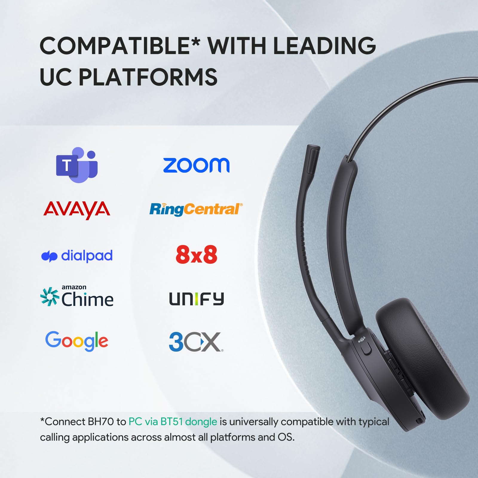 Brilliant Audio Quality ▶ The BH70 also has excellent voice reception capabilities, any factors that may lead to increased distortion or blur are avoided. Whether you're in a busy office environment or on-the-go, the BH70 ensures that your calls are clear and professional. On the other hand, when it comes to music mode, BH70 headphones use dynamic EQ adapts to different genres of music to deliver an immersive audio experience with rich bass, detailed midrange tones, and crisp highs.