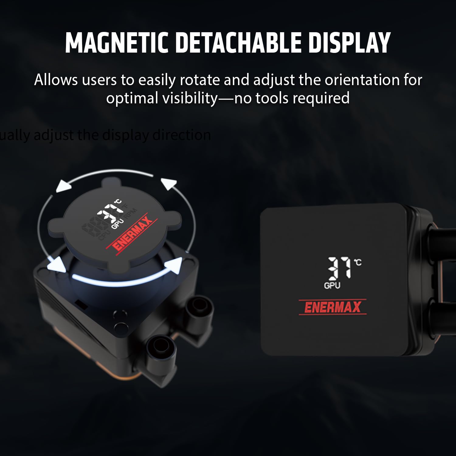 Magnetic Rotatable Real-time Status Display: Monitors CPU/GPU temperatures, fan speeds, with software control and alarm settings.