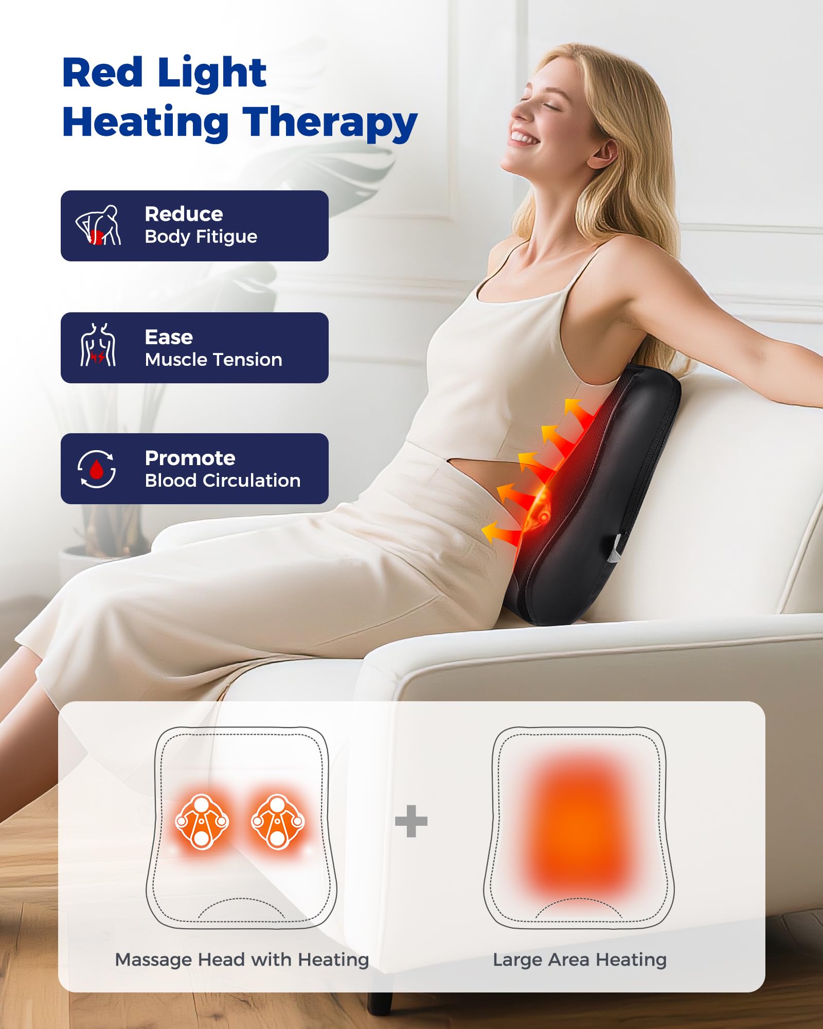 【Dual-Zone Back Massager with Heat】Larger size: 16x13 inches, 5 inches longer than ordinary massage pillows. Our back massager with heat provides the necessary warmness to ease muscle tension and stress. Heated to body temperature (113°F / 45°C) with overheat protection, this back massager with heat provides a comfortable deep tissue kneading massage tools