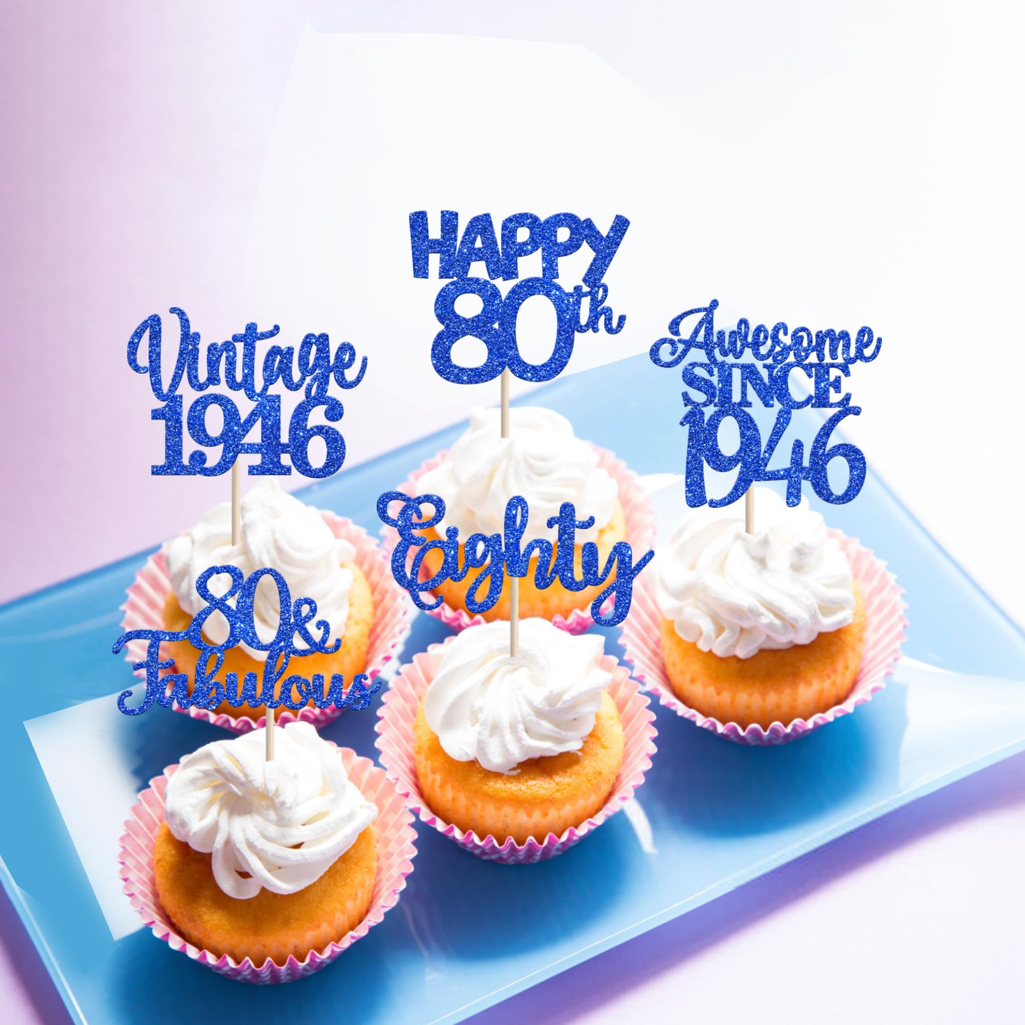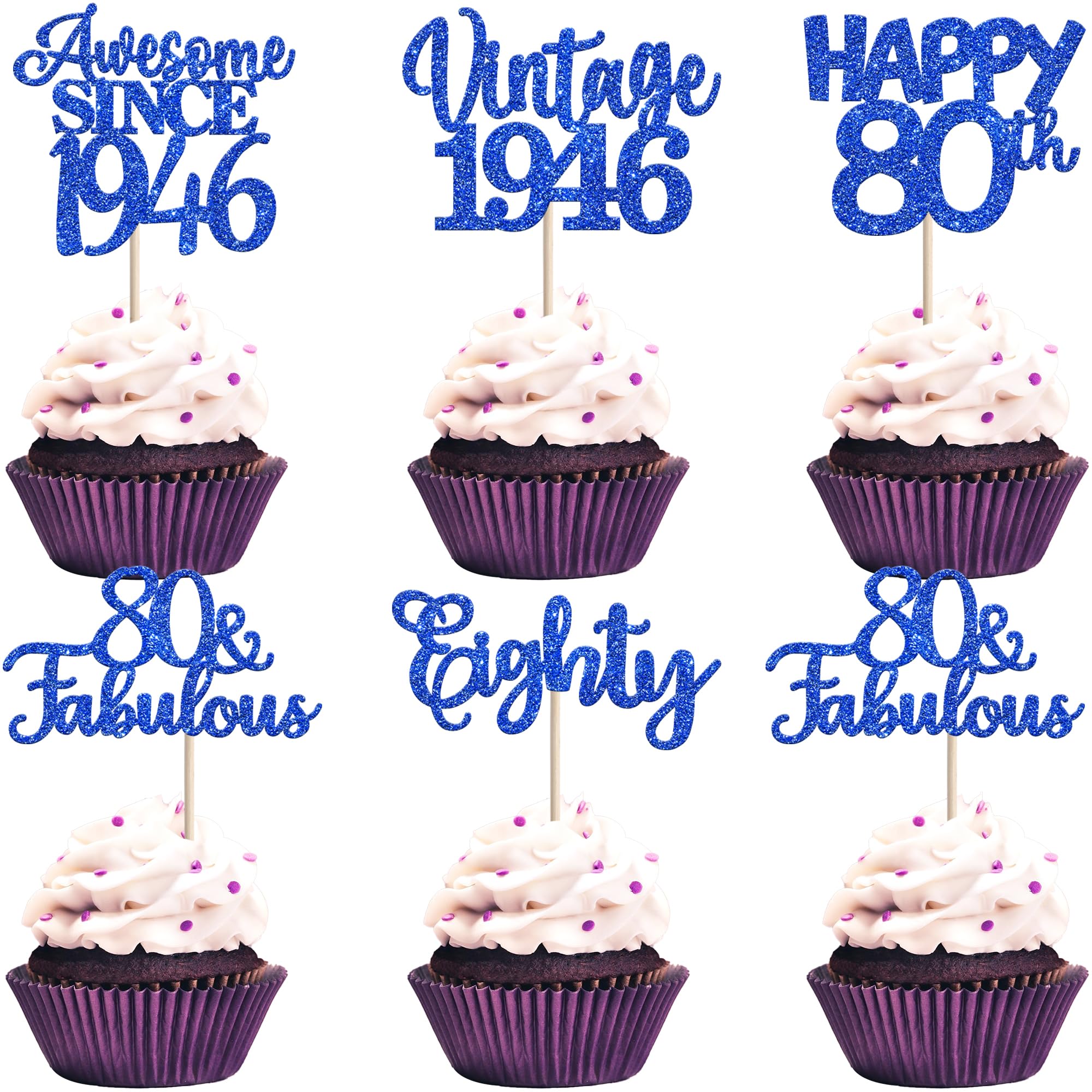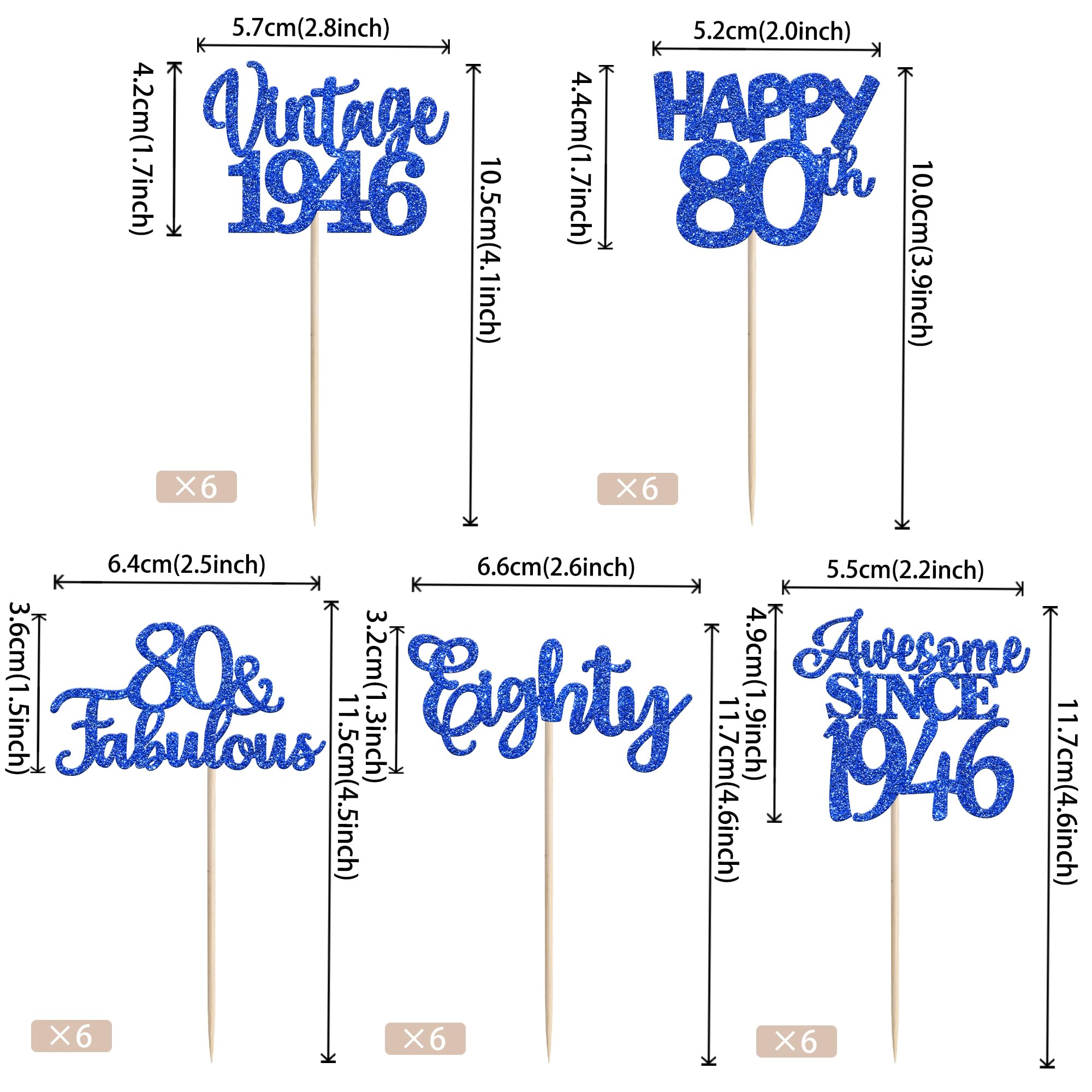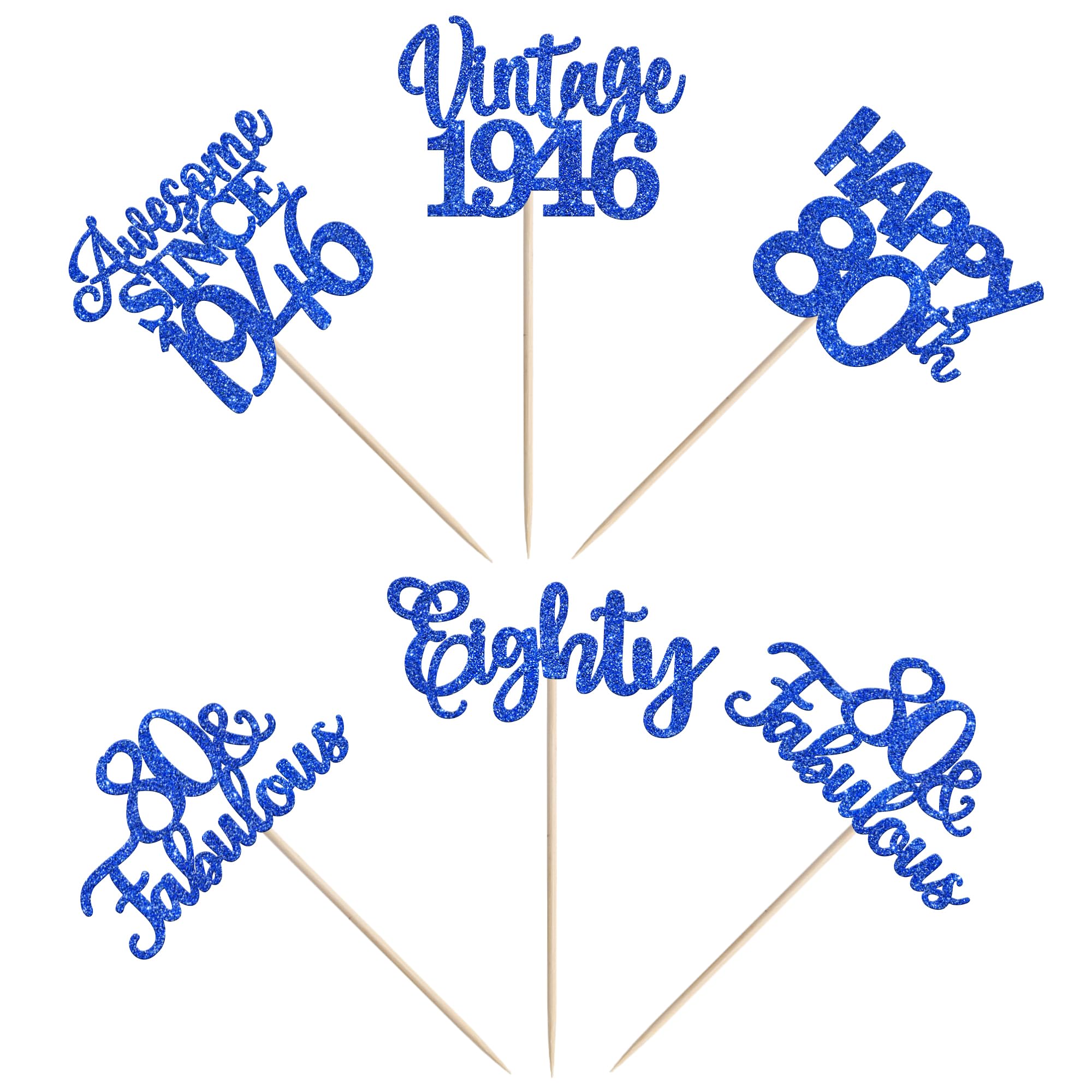 Vintage 1946 Happy 80th Birthday Party Cupcake Toppers Decoration Supplies Perfect for vintage 1946 theme party, 80th birthday theme party, 80th wedding anniversary theme party,cheers to 80 years theme party cupcake decorations supplies. Pack of 30 pcs,6 pcs of each design The size is 2.8*4.1/ 2.0*3.9/ 2.5*4.5/ 2.6*4.6/ 2.2*4.6 inch ( with stick ) Made of high quality paper card stock,thick and thick and sturdy. These vintage 1946 cupcake toppers are single glitter, the back is white, and they are intended for decoration only, please do not put them in oven or microwave. If the item you received has any defects, please contact us immediately. we will deal with it within 24 hours.
