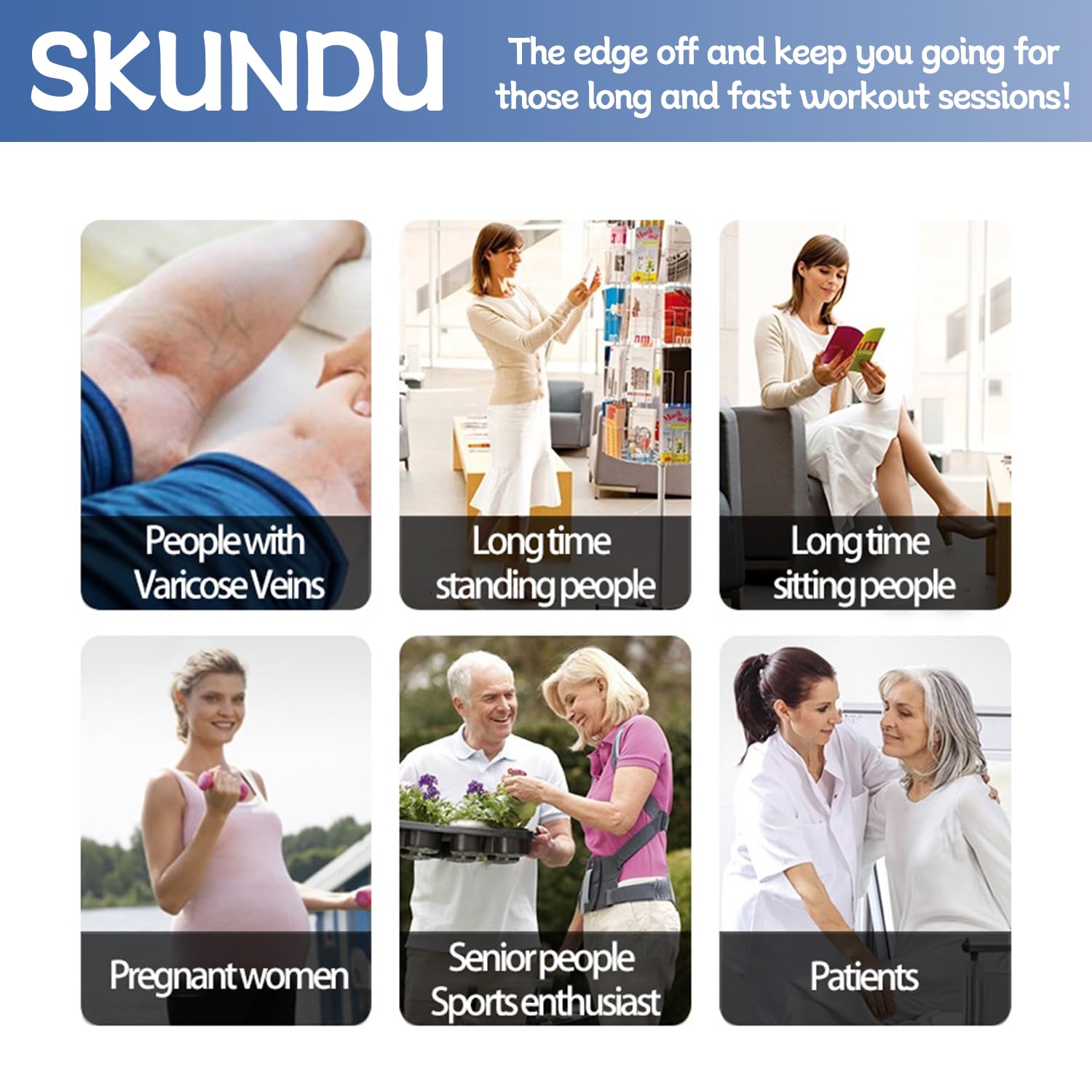 Description EVERY DAY USE:You can wear our compression socks women & men footwear as: - SKUNDU compression socks for promoting healthy feet & addressing circulation problems - Compression socks running footwear - Flight compression socks for traveling - Support hose for long car trips - Maternity compression stockings - Gym & athletic compression socks - Work compression stockings for waitresses, nurses & others who work on their feet HOW TO WEAR COMPRESSION SOCKS? 1.Please remove your rings or any jewellery on your fingers before you start putting on the stockings. You are suggested to wear rubber if you have long nails. 2.Hold the top of the stocking with one hand. Then with your other hand, reach inside the stocking and push your arm all the way in until you reach the end and can grab the toe. 3.When you have a firm grip on the toe, pull your hand back up through the stocking, turning it inside out, but leaving the tips of your fingers in the toe of the stocking. 4.Put your toes into the toe of the stocking, and gently roll and slide it back over your heel. Then use your finger tips or palms to slowly roll and slide the stocking all the way up your leg. 5.Be careful not to grab and pull at the top of the stocking, because that can cause it to rip or tear. WARM TIPS: 1. The first time you wear compression stockings, you may feel the compression socks too tight. This is normal. Suggested that the first time, put on the socks for 2-4 hours, then gradual increase, in order to enhance the adaptability of the legs and help the long-term effects.? 2. Sock's height is vary from individual differences 3. We recommend moderate exercise daily, promote blood circulation, improve muscle and vein vitality, to maintain good health.
