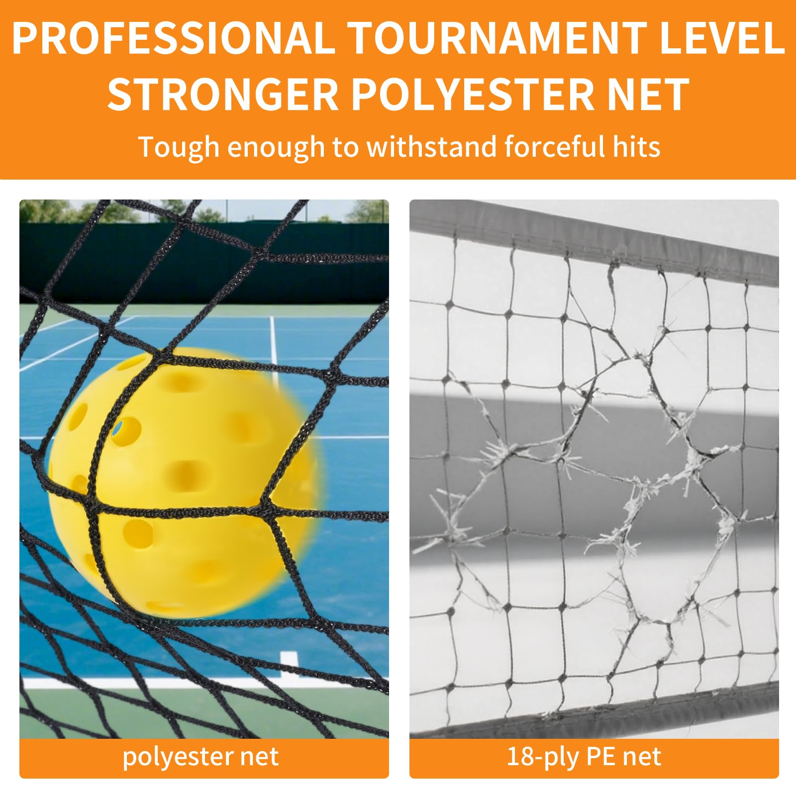 This pickle net is suitable for casual sports and training:Made with strong polyester for the net tough enough to withstand forceful hits.Pickleball net the poles are connected by a durable bungee cords,with circular brackets on the bottom frame bar to keep the net steady.