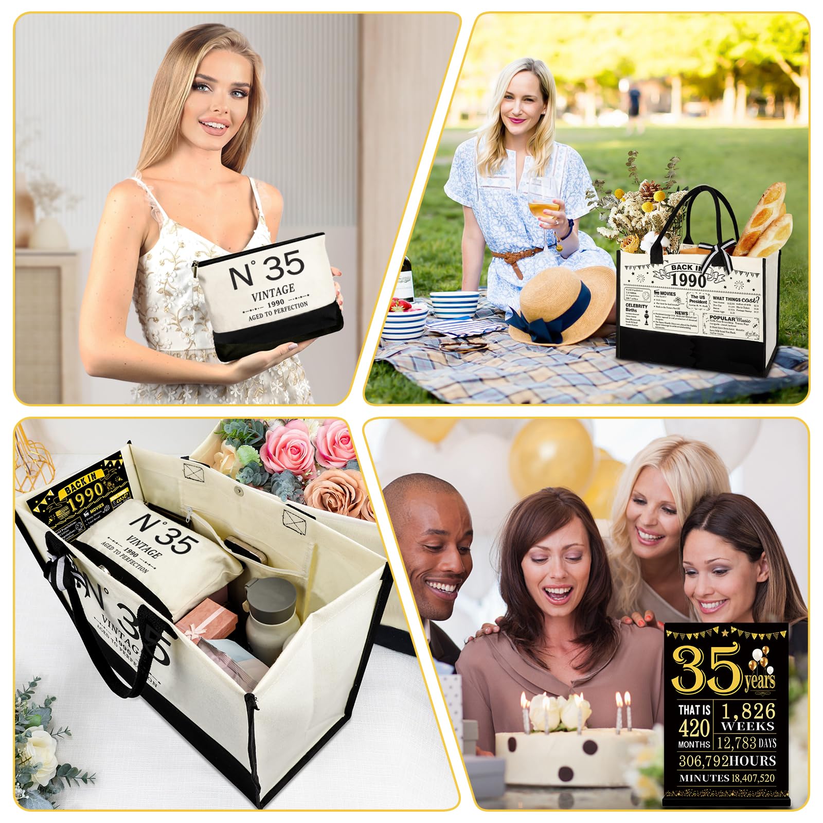 Great Gift for Her 35th Birthday: This gifts set for 35th birthday women contains: 1 X 1990 beach bag, 1 X makeup bag, 1 X back in 1990 poster, 1 X greeting card. Unique canvas tote bag gifts set will be a adorable gift for women's 35th birthday. This birthday 35 gifts themed idea makes the perfect choice for putting a smile on her face on their special day.