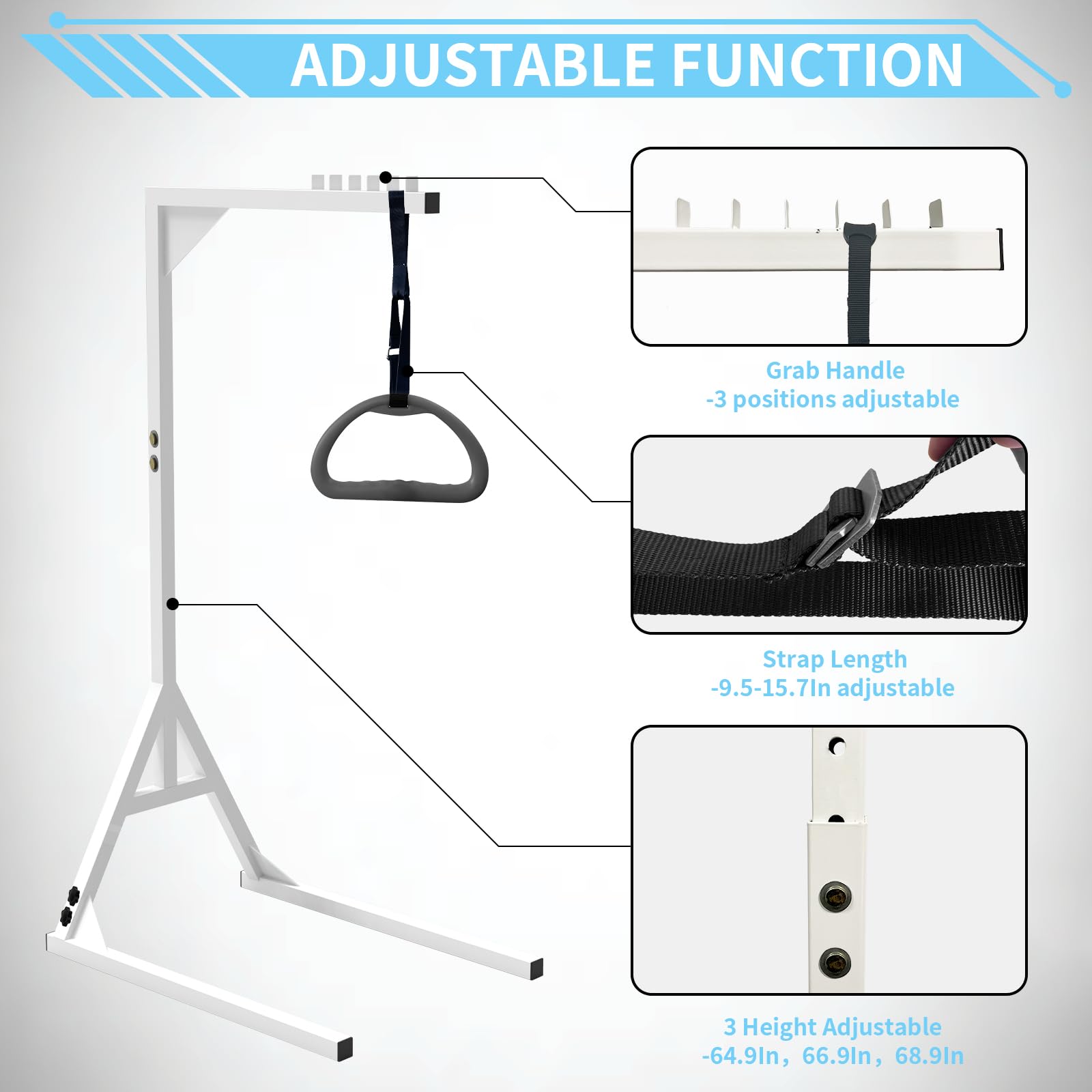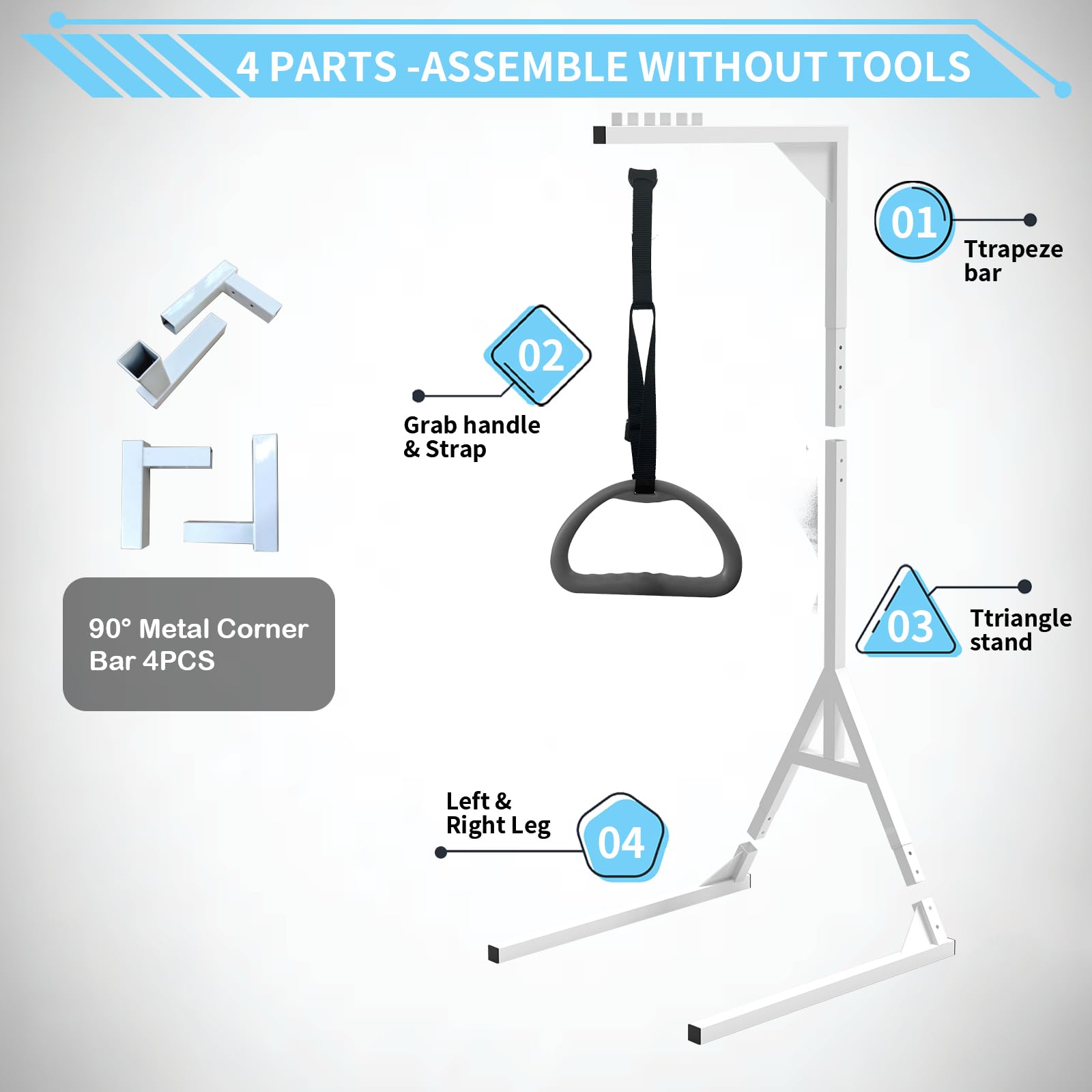 Simple Design: Floor stand trapeze bar have 4 components-trapeze bar*1, triangle stand*1, handle*1, strap*1, legs*2. Bed trapeze may be assembled in less than 10 minutes with no tools. Easy to install and works like a dream! White color also coordinates with the color your house.