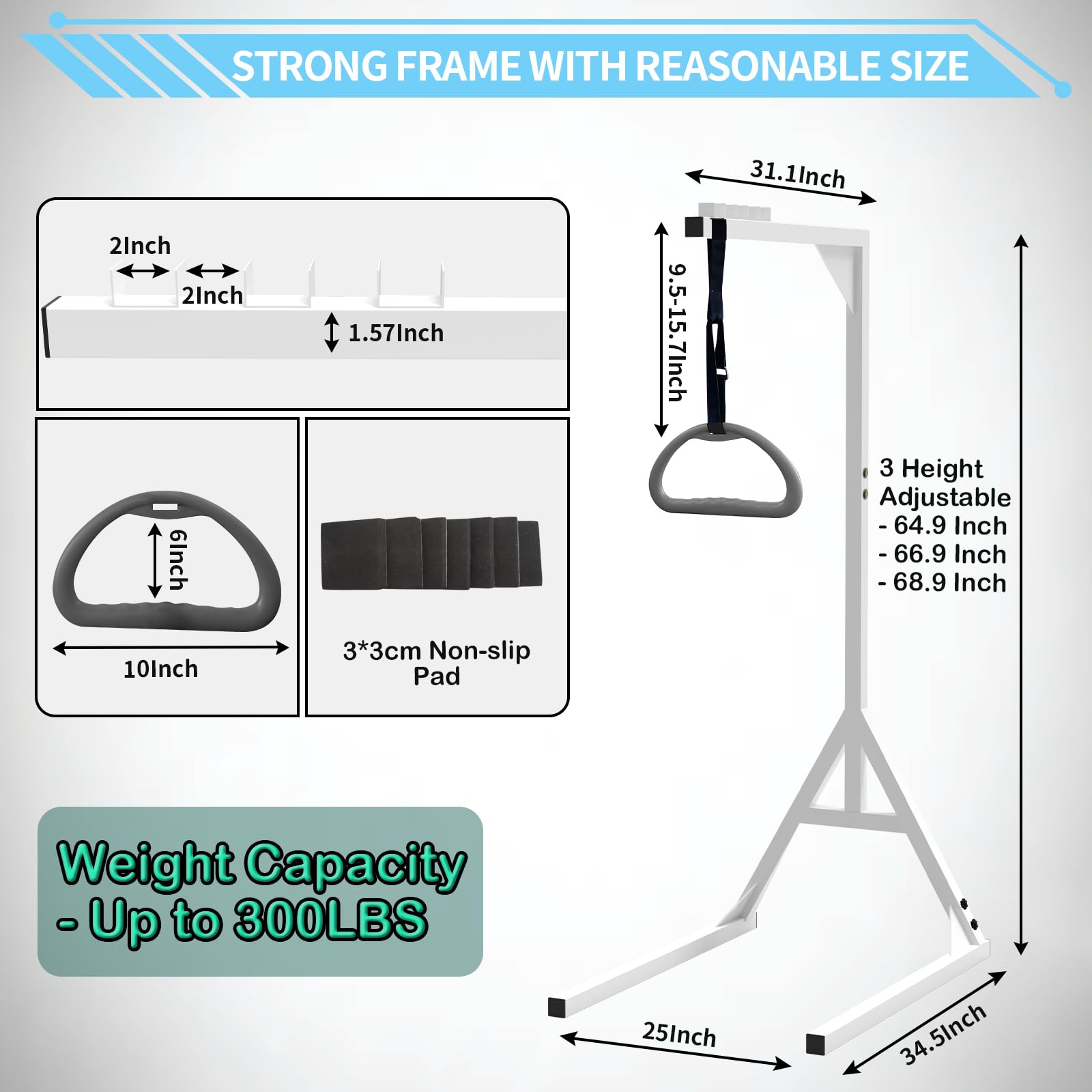 Strong Frame: The trapeze bar for bed mobility is well built with 1.57Inch square tube and total size H63In x L25.6In x W32.7In. Bed pull up bar is sturdy enough when used to pull straight up and well constructed and fits perfectly at the head of hospital bed. Up to 300-lb capacity model.