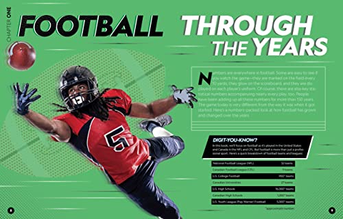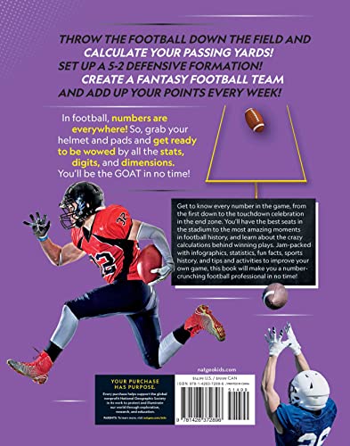 Do you know how to calculate the pass completion percentage of Kansas City Chiefs Super Bowl-winning quarterback Patrick Mahomes? What was the highest scoring game in football history? Become a football fanatic and learn all about the numbers and math behind this popular sport. With every throw, tackle, and kick, numbers are being calculated on the football field. Get ready to learn all the ways digits and math factor into the game, from the countless statistics used to measure an individual player’s performance to the numbers used in defensive formations. Read about the greatest players from football history and get fascinating facts, like the price of a Super Bowl commercial. Discover which NFL team defenses have allowed the fewest points and check out cool graphics that show the angles in different pass patterns. Jam-packed with sports trivia, awesome photos, and fun activities at the end of every chapter, this number-focused look at the game is a definite touchdown. Are you a math maniac or sports superfan―or both? Check out these other books in the It’s a Numbers Game! series: •It’s a Numbers Game! Basketball •It’s a Numbers Game! Soccer •It’s a Numbers Game! Baseball