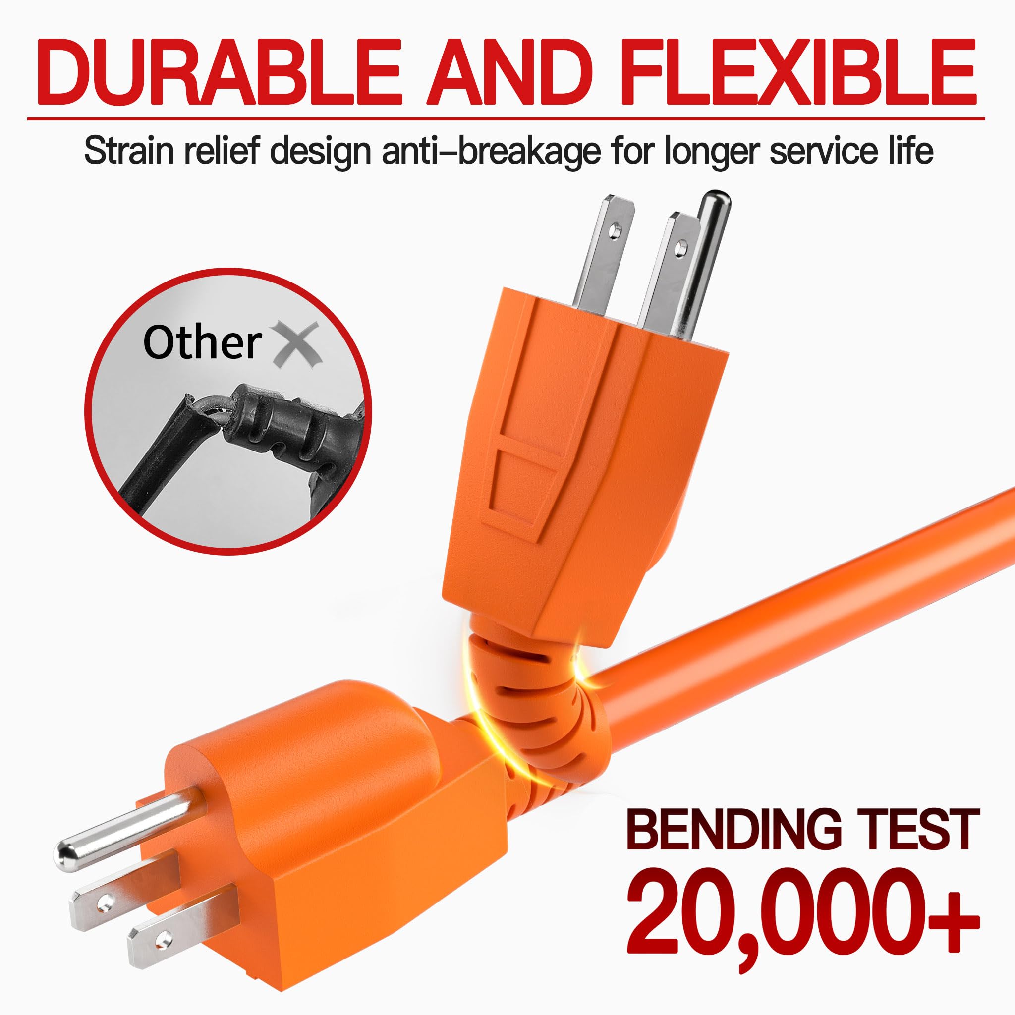 Durable Construction: Orange outdoor extension cord are made of 3 strands of pure copper core with thicker insulation in the middle and IP65 vinyl outer jacket; The pins of the extension cord 50 ft male plug are made of special material that will not rust or corrode; The vinyl outer jacket is flame retardant, IP65 waterproof, -58°F cold and corrosion resistant