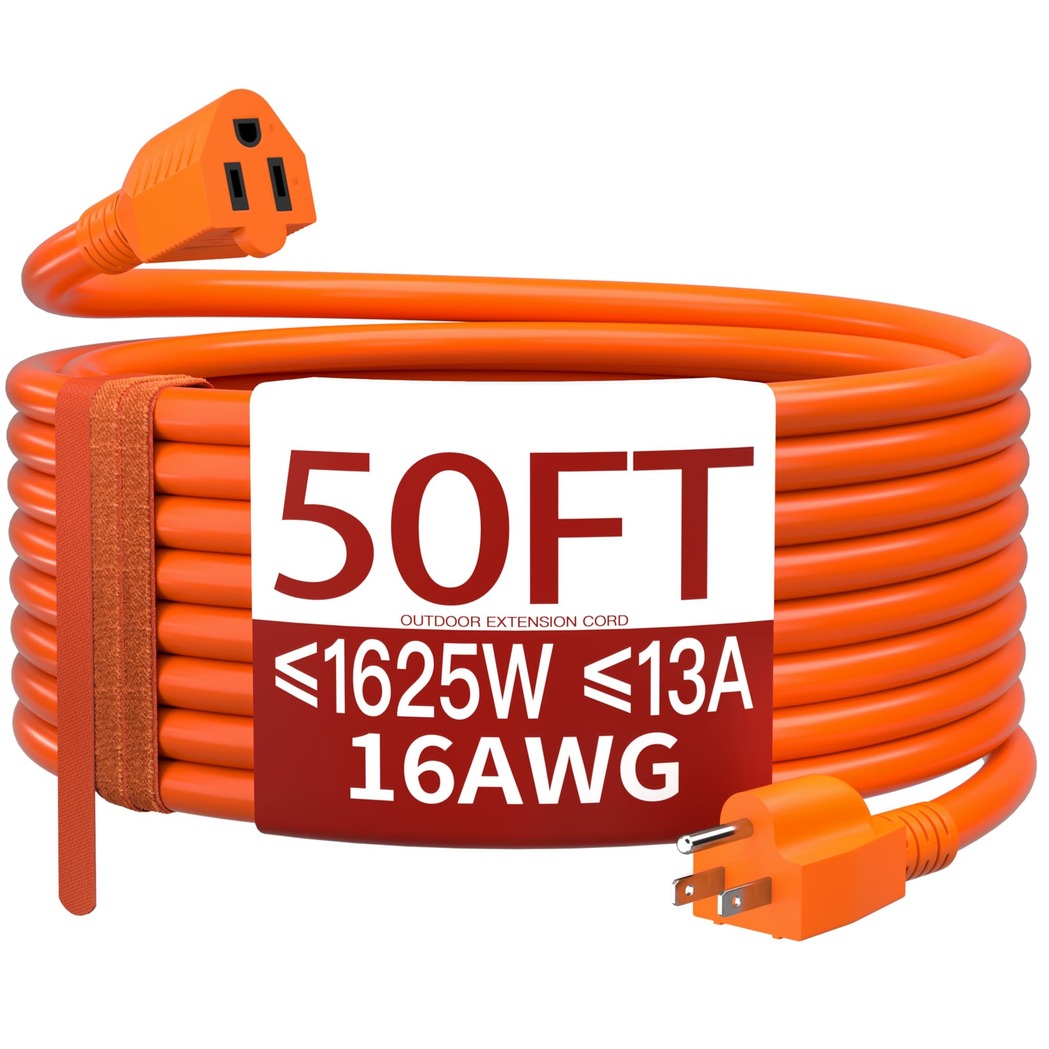 ETL Listed and Trusted: 50 ft extension cord rated 13 Amps, 1625 Watts and 125 VAC; Male NEMA 5-15P and female NEMA 5-15R; It is ETL/cETL Listed; Ensuring its compliance with strict safety standards; Each outdoor extension cord passes a 2500V high voltage test before leaving the factory to ensure safety; Reliability and efficiency outdoor extension cord waterproof are capable of meeting most electrical needs