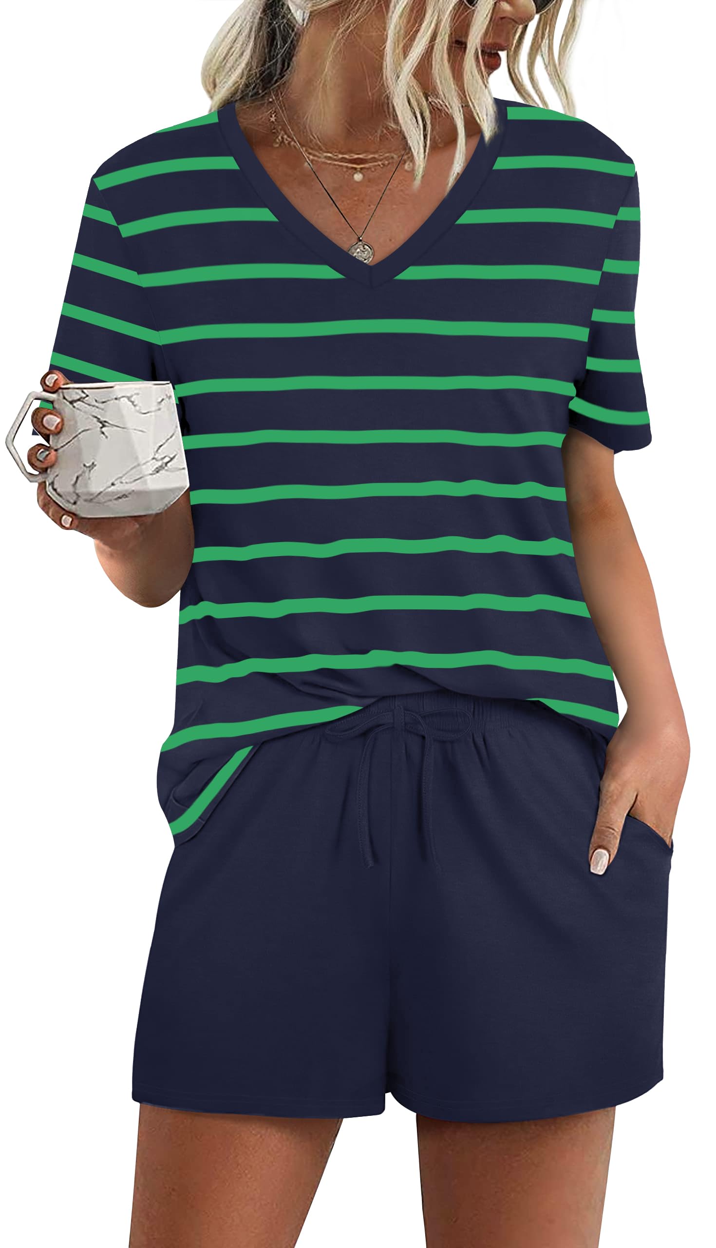 FEATURE --- The package including 1 x short sleeve t-shirt and 1 x short. The top has classic v neckline. The short has elastic drawstring and side pockets. The cute top is perfectly complemented by shorts. Casual and sexy in daily life.