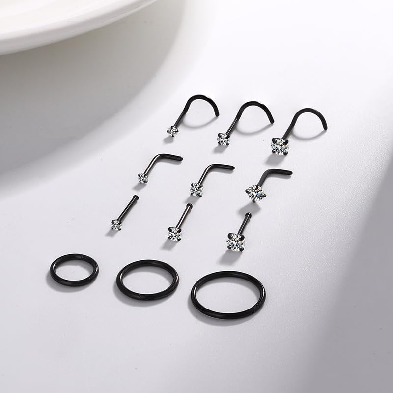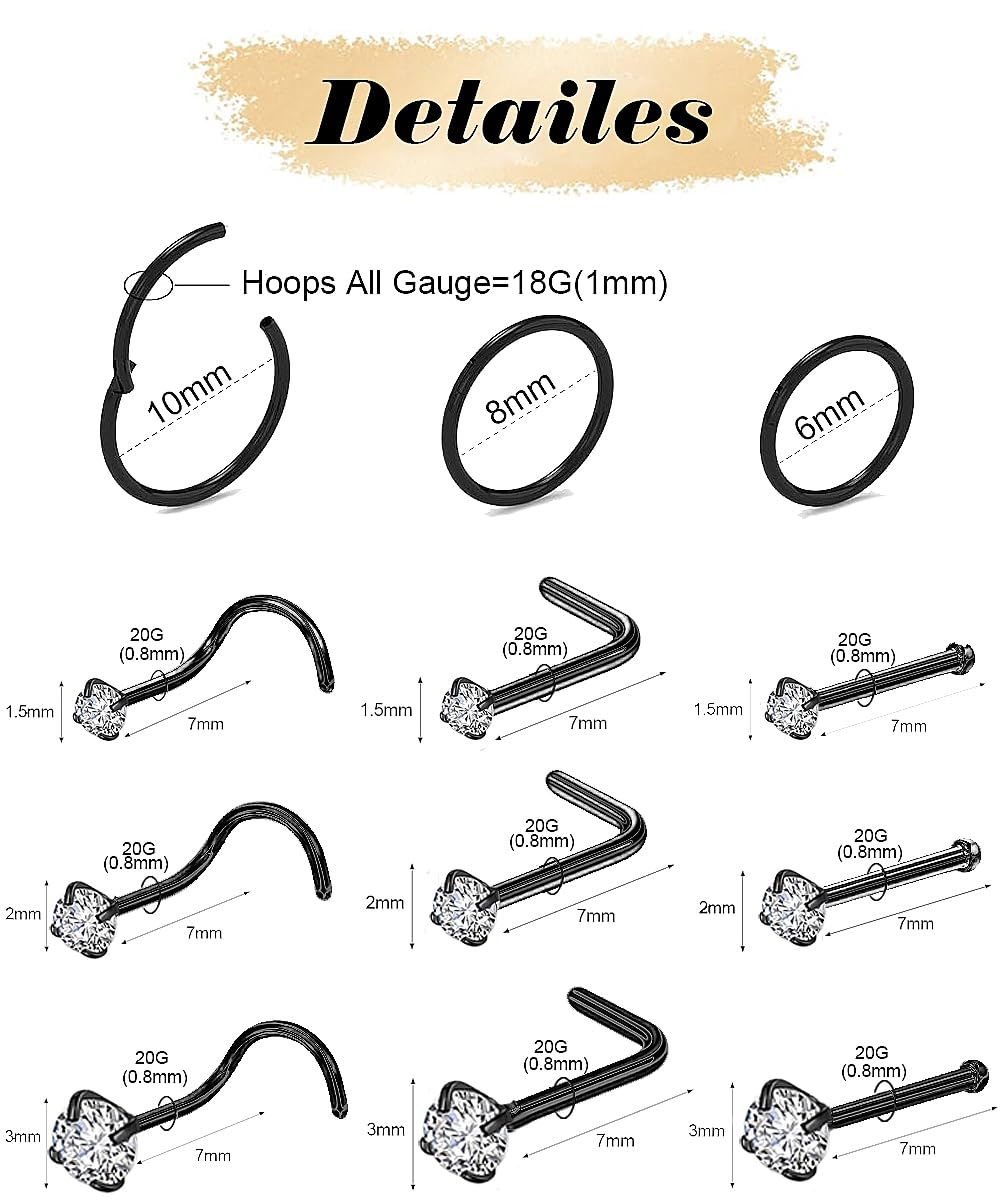 ⭐【12-Piece Set with Multiple Styles】Includes 9 nose studs (L-shape, straight, corkscrew) and 3 hinged hoops. CZ sizes: 1.5mm / 2mm / 3mm. Hoops in 6mm, 8mm, 10mm (18G). Studs: 20G, bar length 6.5mm. Great variety for daily mix and match.