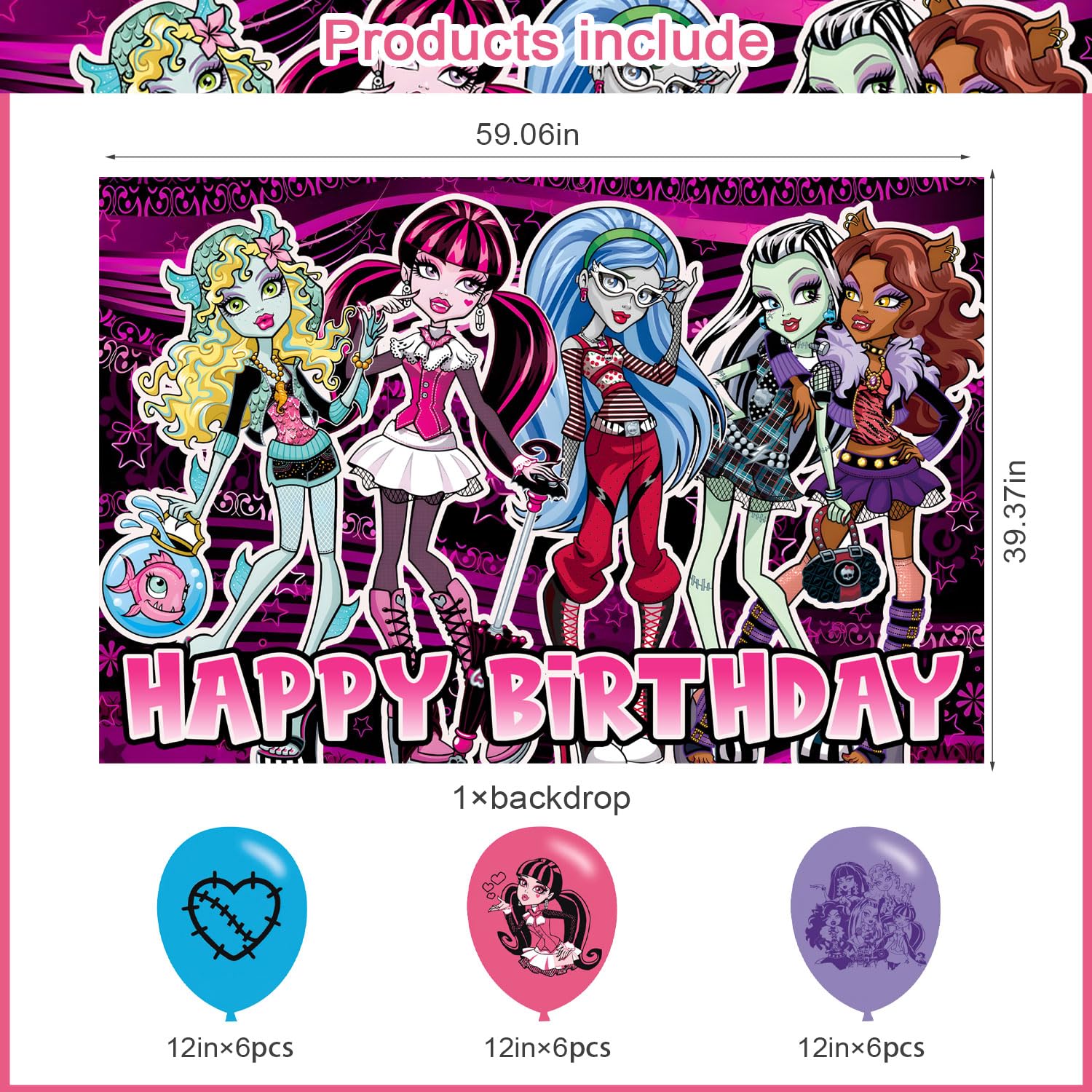 Size : Include Backdrop for birthday party 3x5ft,59x39.3inches in horizontal,18 Pcs Monster Girl party Ballons.
