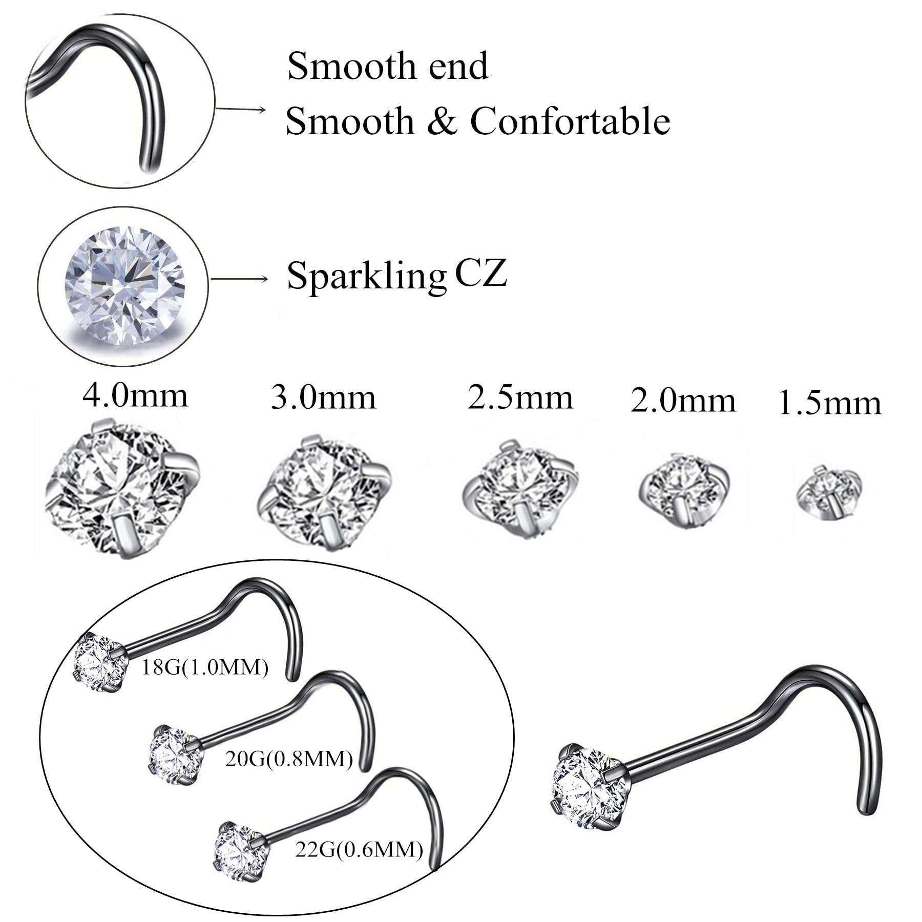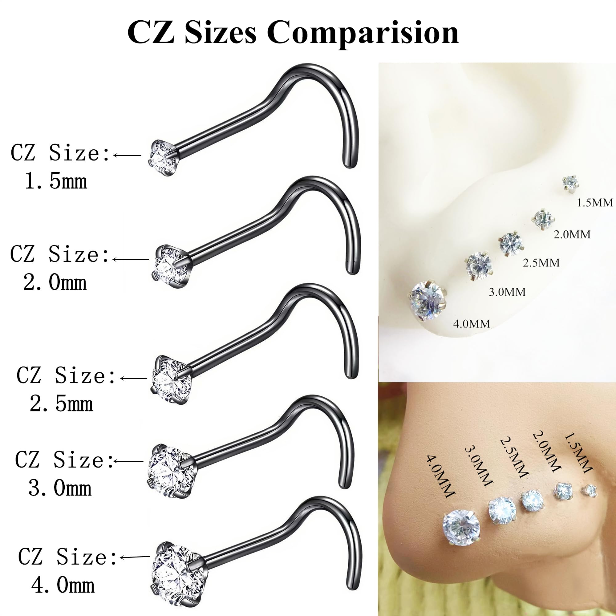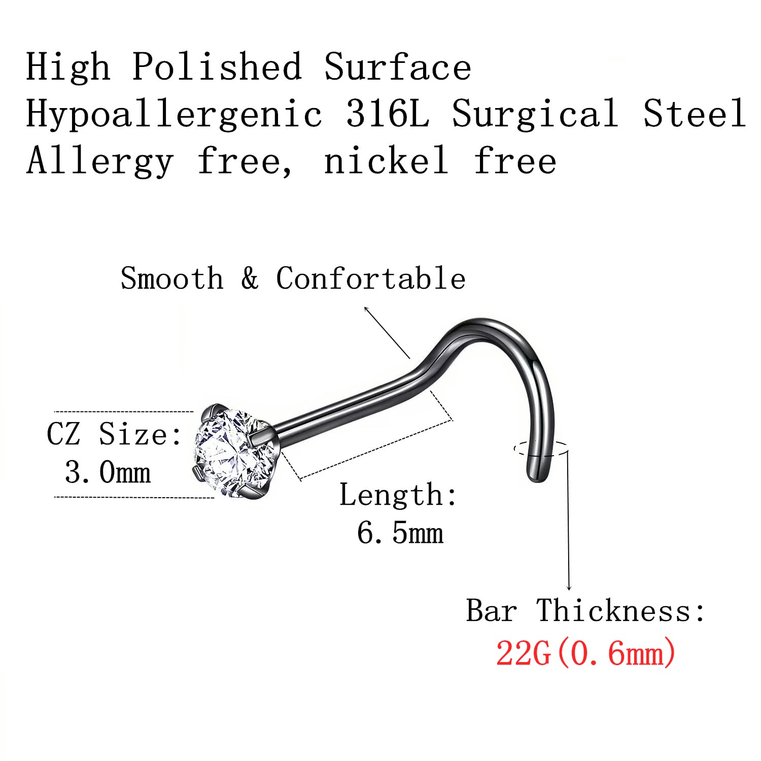 Quantity: 6pcs 3.0mm CZ screw nose rings. This screw nose ring size: Bar thickness: 22 gauge (0.6mm), Pin Length:6.5mm, Prong set cubic zirconia: 3.0mm, These stones a very bright and prong set by hand for accuracy.