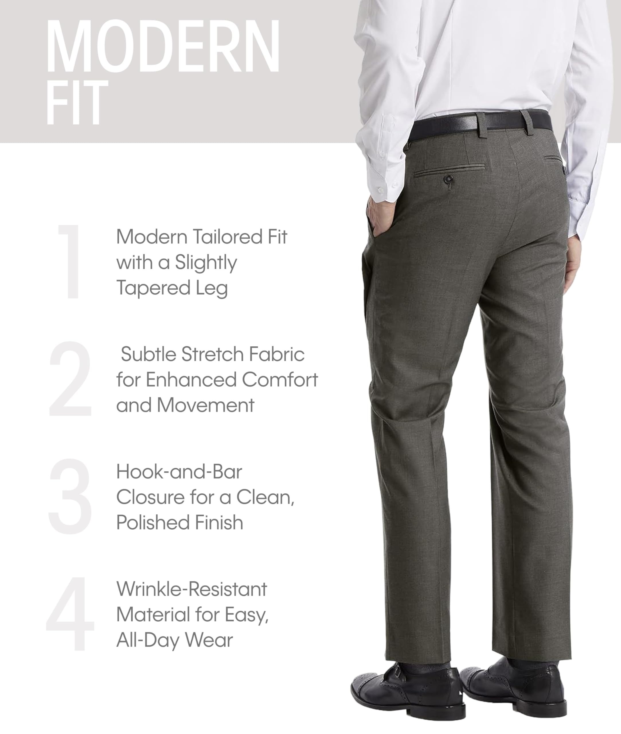 Modern Fit with Tailored Style: Features a modern fit with a gentle taper to the ankle for a sleek, contemporary look that pairs effortlessly with a button-down shirt and blazer.
