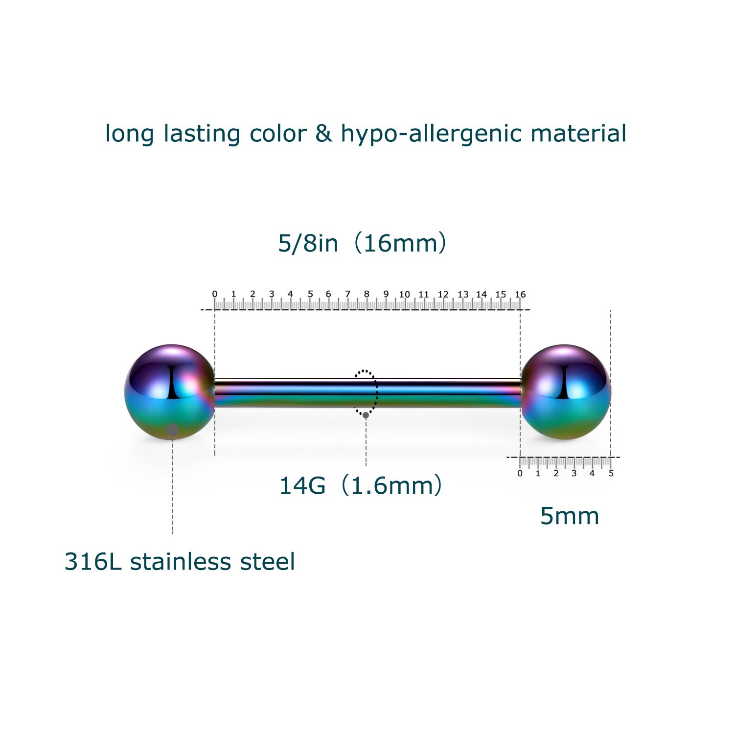 Piercing Type: Comfortable smooth surface,serve as Nipple Rings,Tongue Rings,Belly Bar Ring,Cartilage Piercings Earrings etc,4 kinds of bar length-1/2"(12mm),9/16"(14mm),5/8"(16mm),3/4"(18mm)