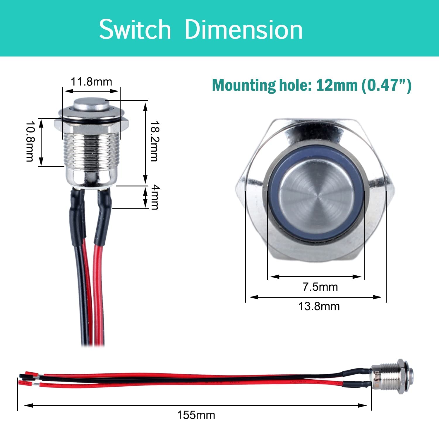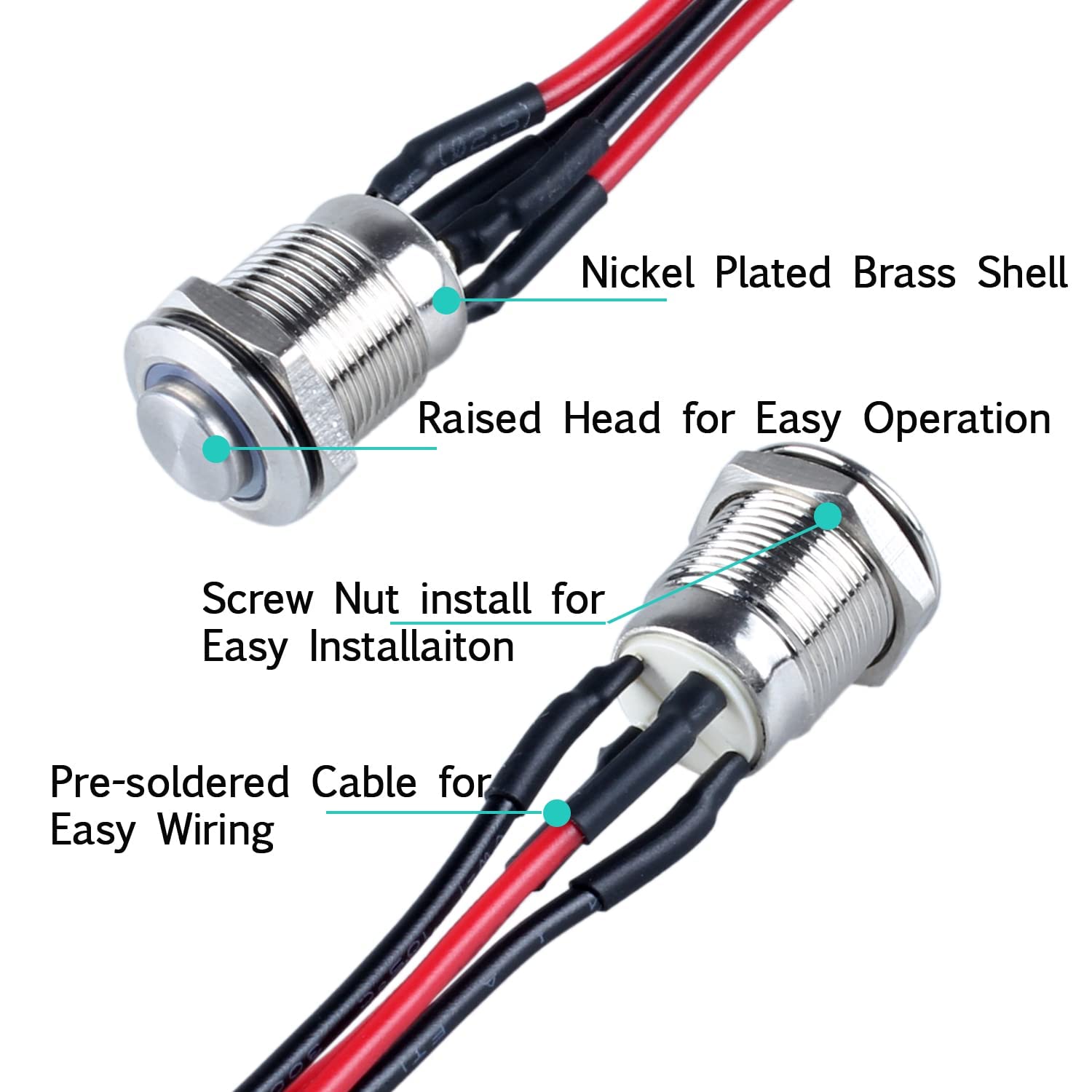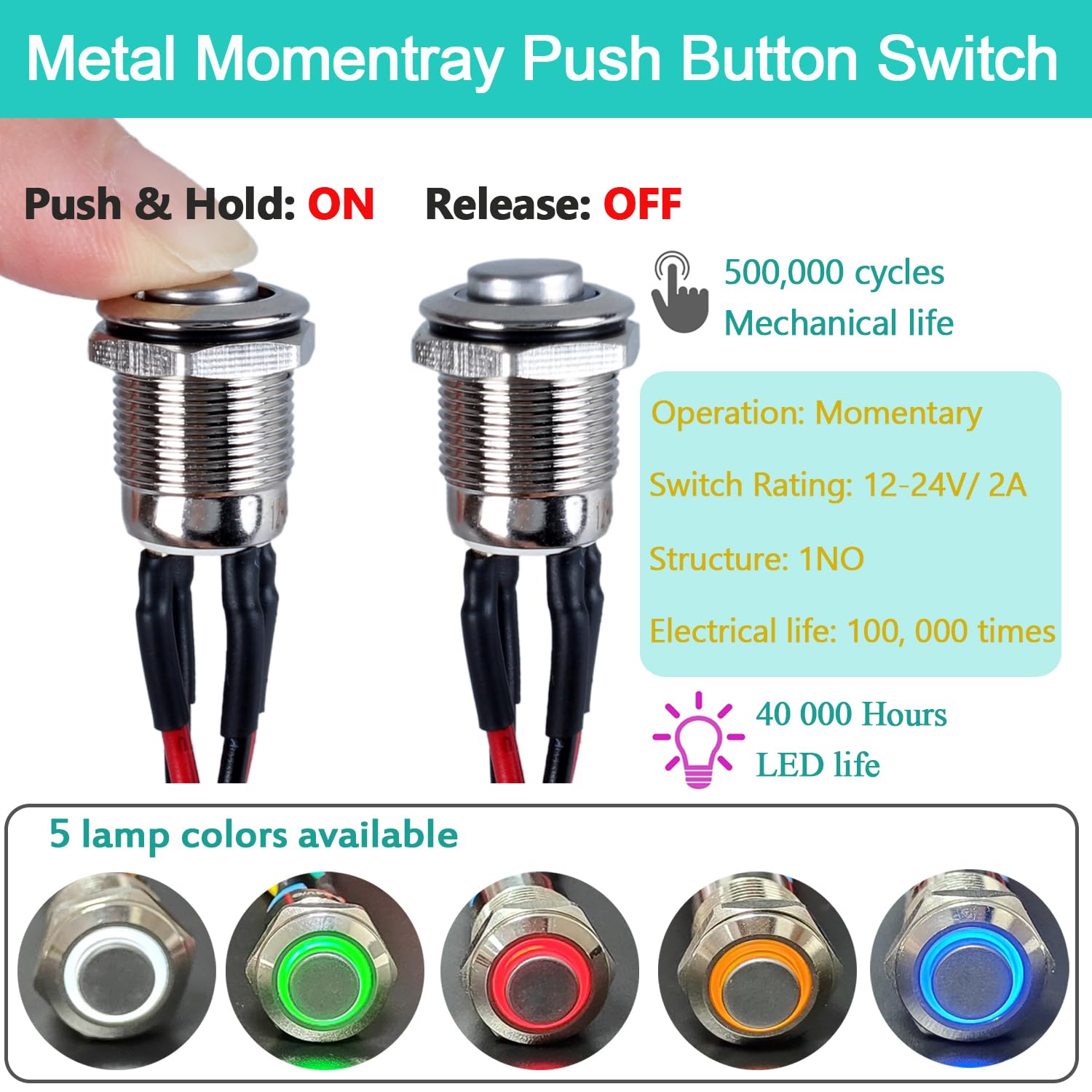 Momentary: Press the button and hold-ON, Release-OFF; High Round Raised Cap for easy operation; Electrical life: 100, 000 times, Mechanical life: 500,000 cycles