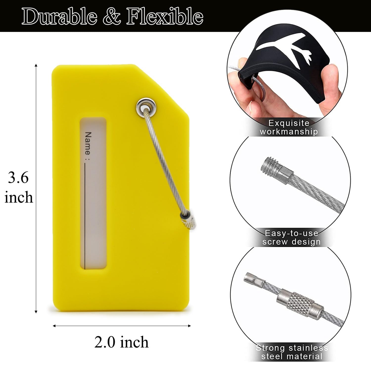 【Flexible & Durable】Our luggage tags Made of quality durable Silicone ability to bend without breaking. The reinformed metal hoop will ensure that your bag tags will be attached to your belongs all the time.