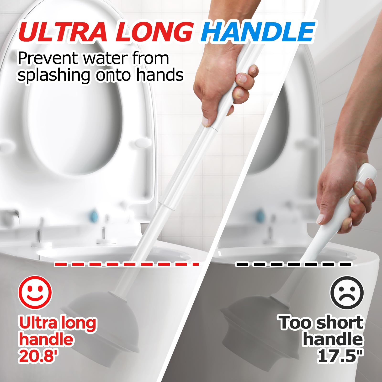 Extended handle -Heavy Duty Toilet Plunger: Compared to ordinary handles, our upgraded extended handle provides a better user experience and prevents stains from splashing onto the hands. A professional powerful suction cup that can solve various blockage problems. Comfortable handles provide greater support during use.