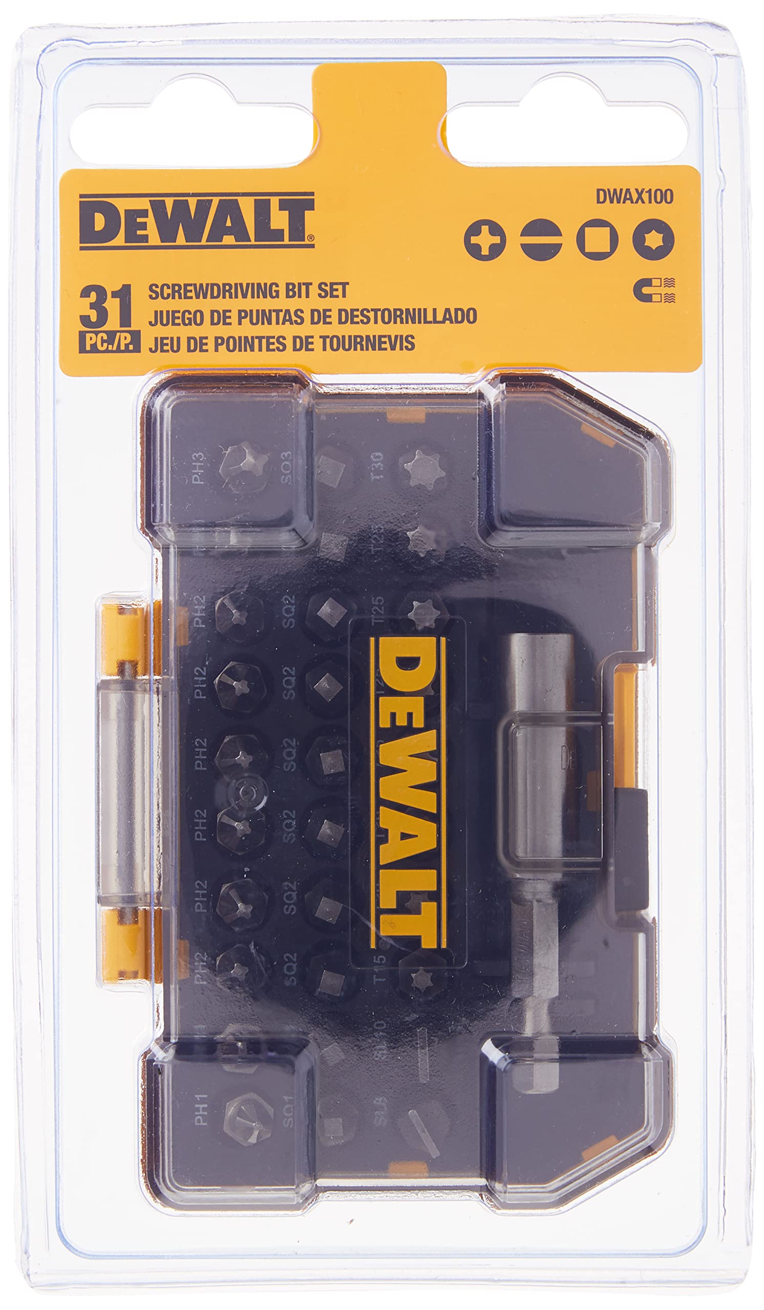 DEWALT DWAX100 31pc Screwdriving Set consists of (31) S2 modified steel bits for increased durability. The extra small Tough Case is perfect for portable and organized storage of this set. The magnet bit tip holder accepts 1-Inch scewdriving bits. Set contains: Ten (10) 1-Inch Phillips Bits: (2)PH1, (6)PH2, (2)PH3, Ten (10) 1-Inch Square Bits:(2)SQ, (6)SQ2, (2)SQ3, Five (5) 1-Inch SL Bits: SL6, (3)SL8, SL10, and Five (5) Star Bits: T15, (2)T20, (2)T25, along with a Magnetic Bit tip Holder. Magnet Bit Tip Holders Holds 1-Inch Bit Tips.