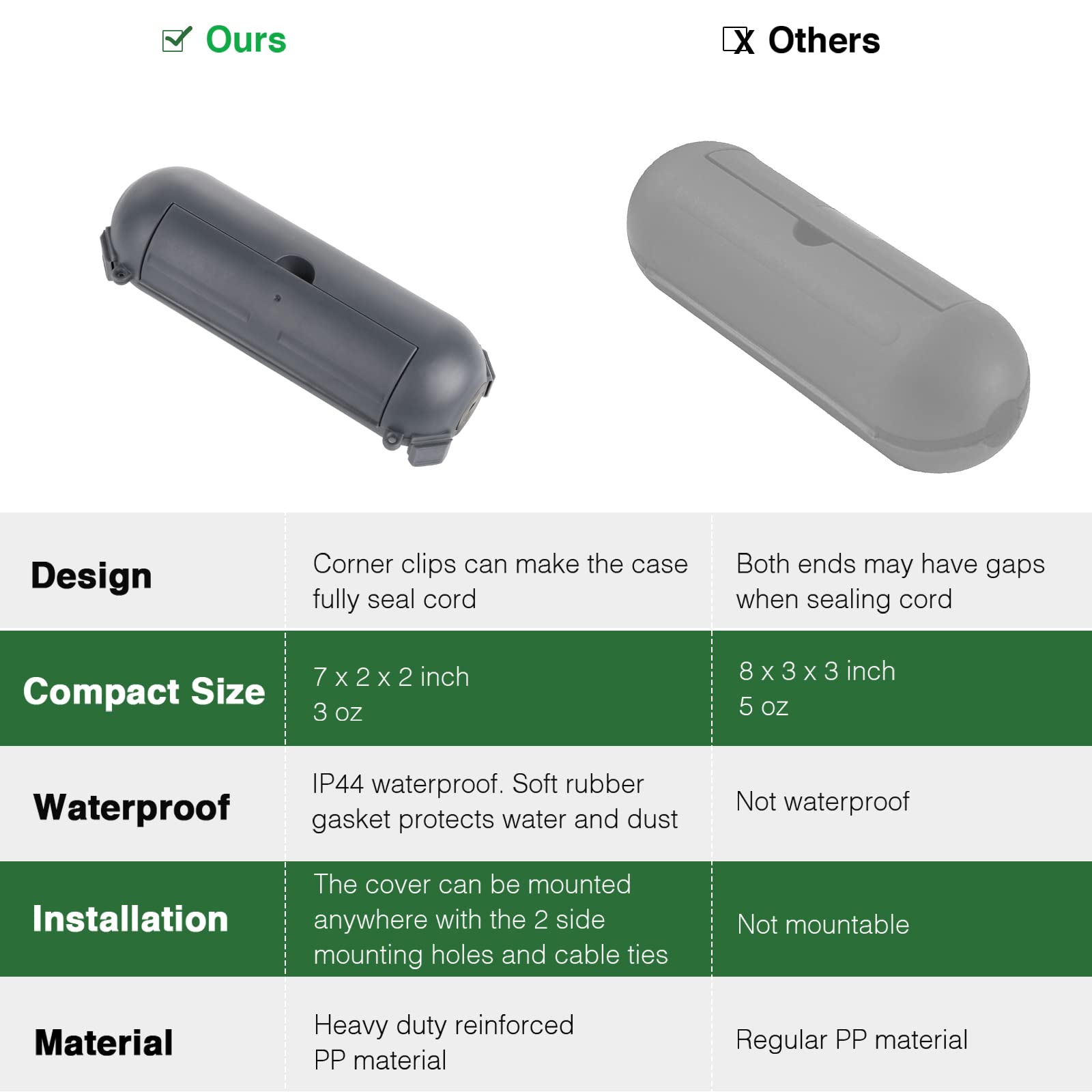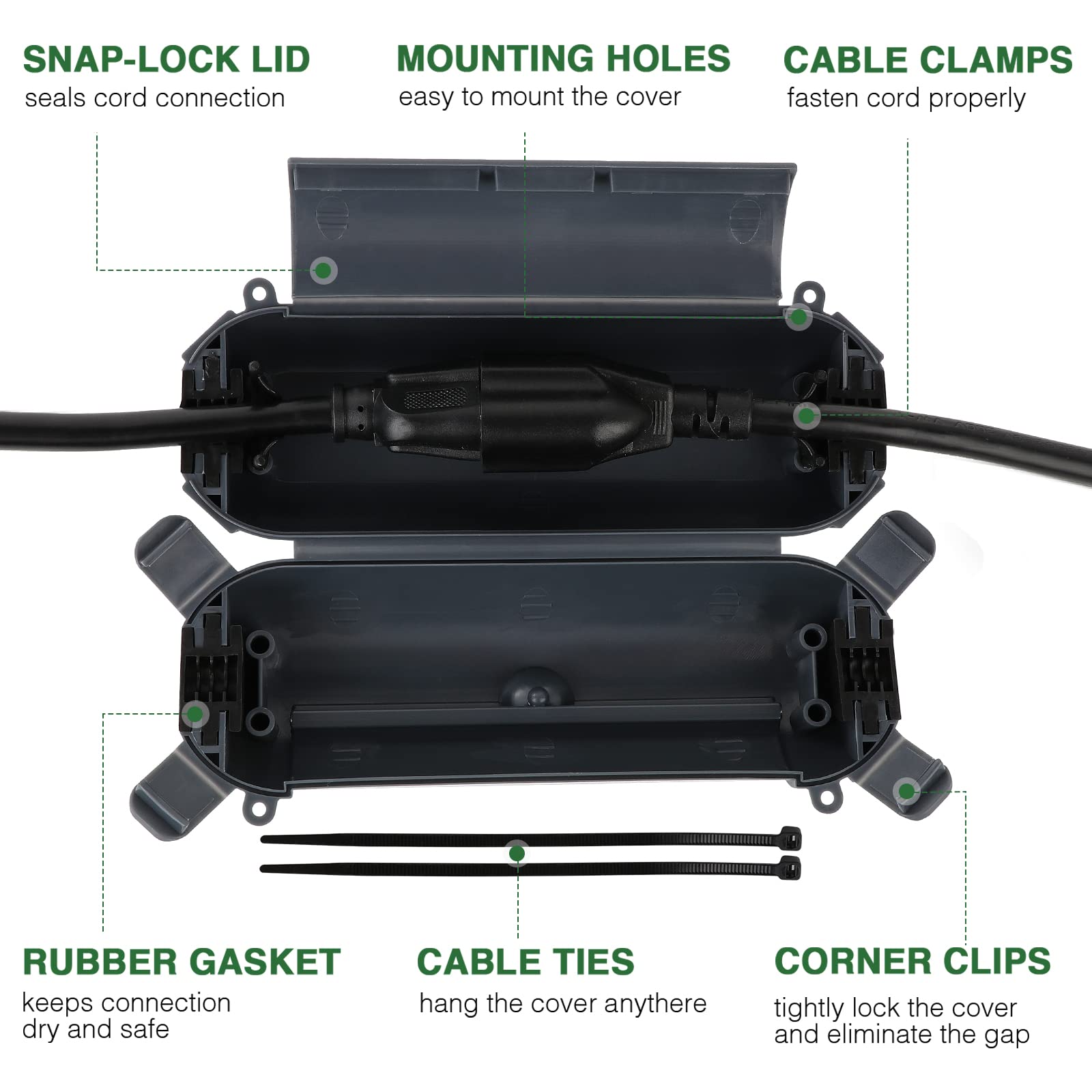 With the 4 corner clips, snap-lock lid, and rubber gaskets, this outdoor extension cord cover box is IP44 waterproof. Perfect to seal 14/16/18 gauge cord, braided cable and flat wire.