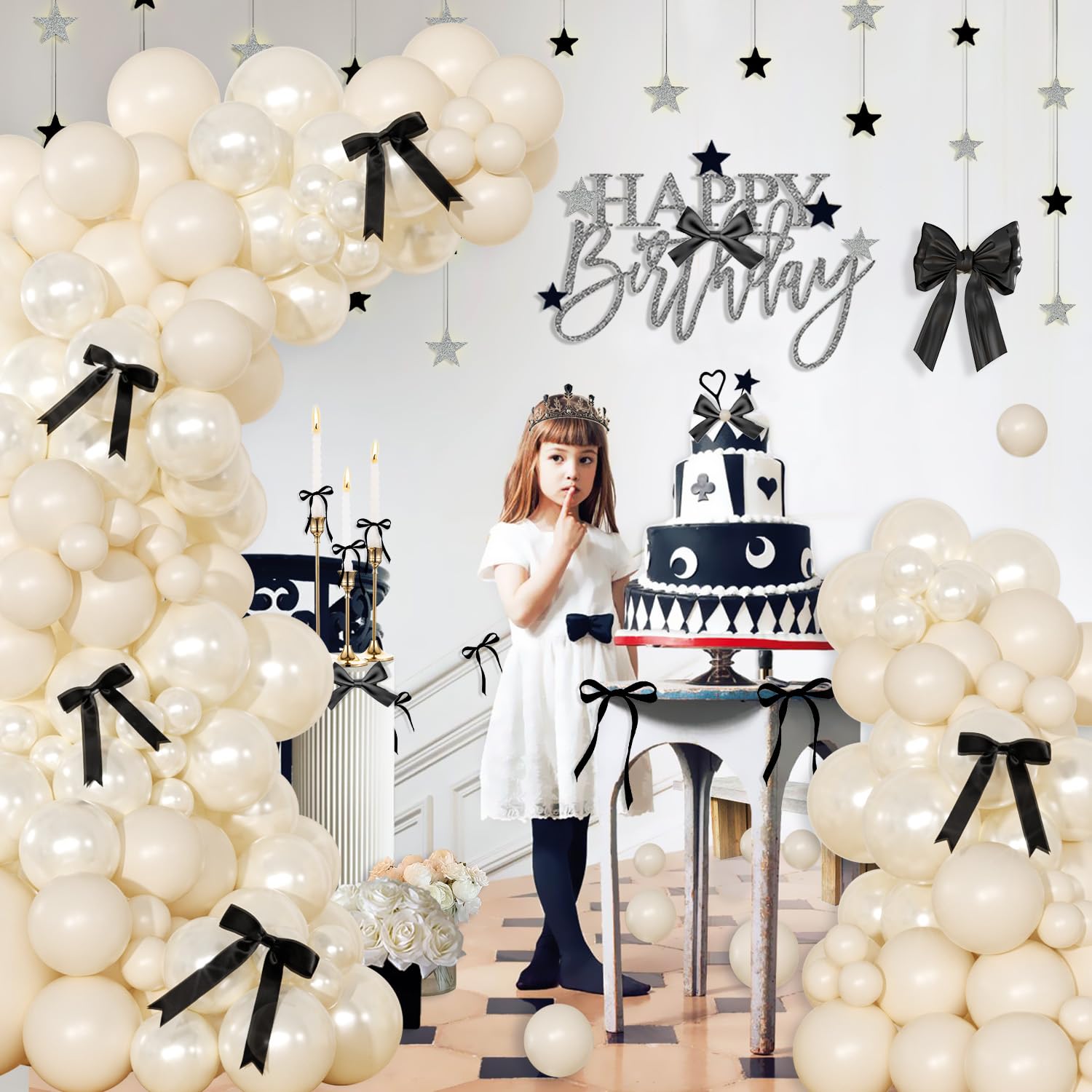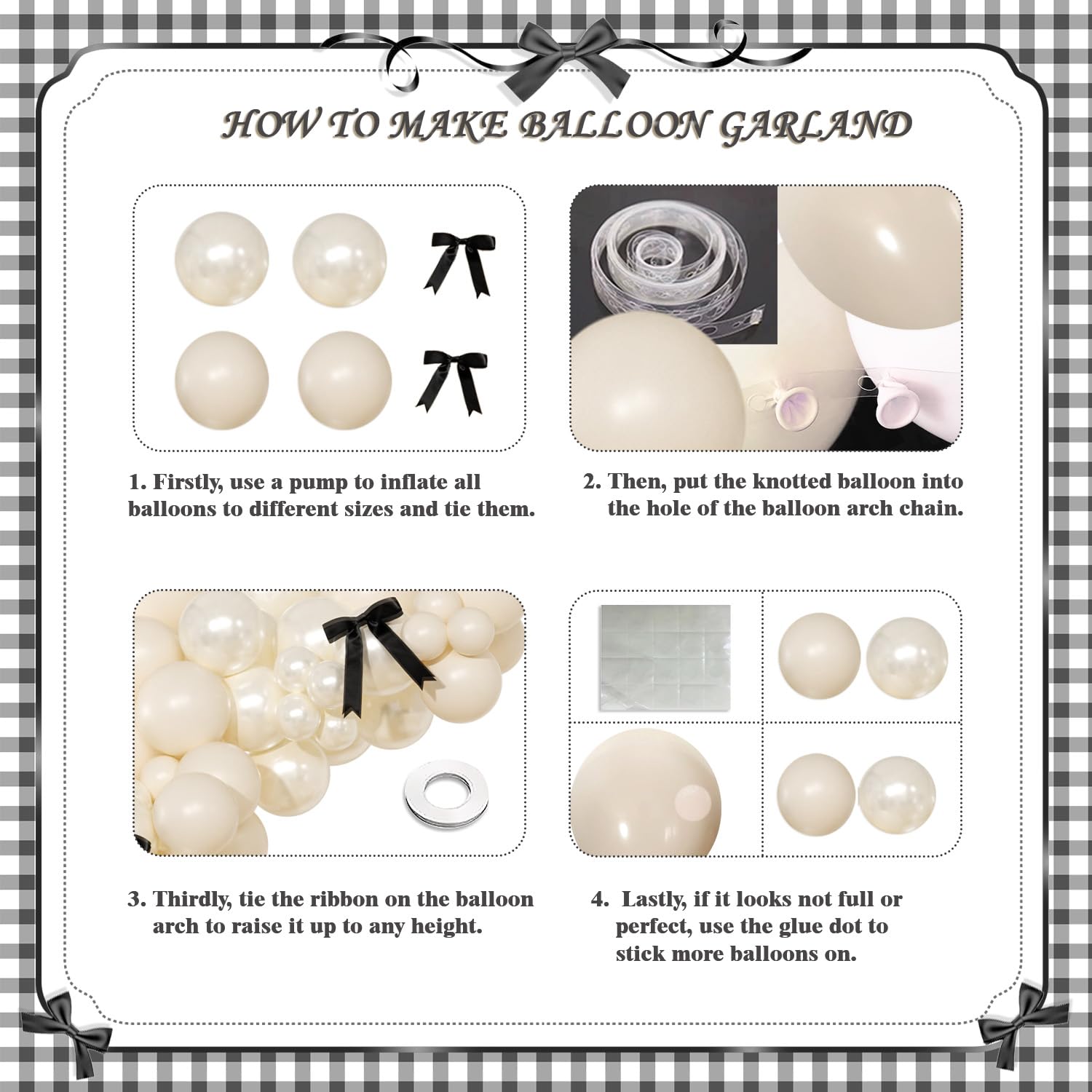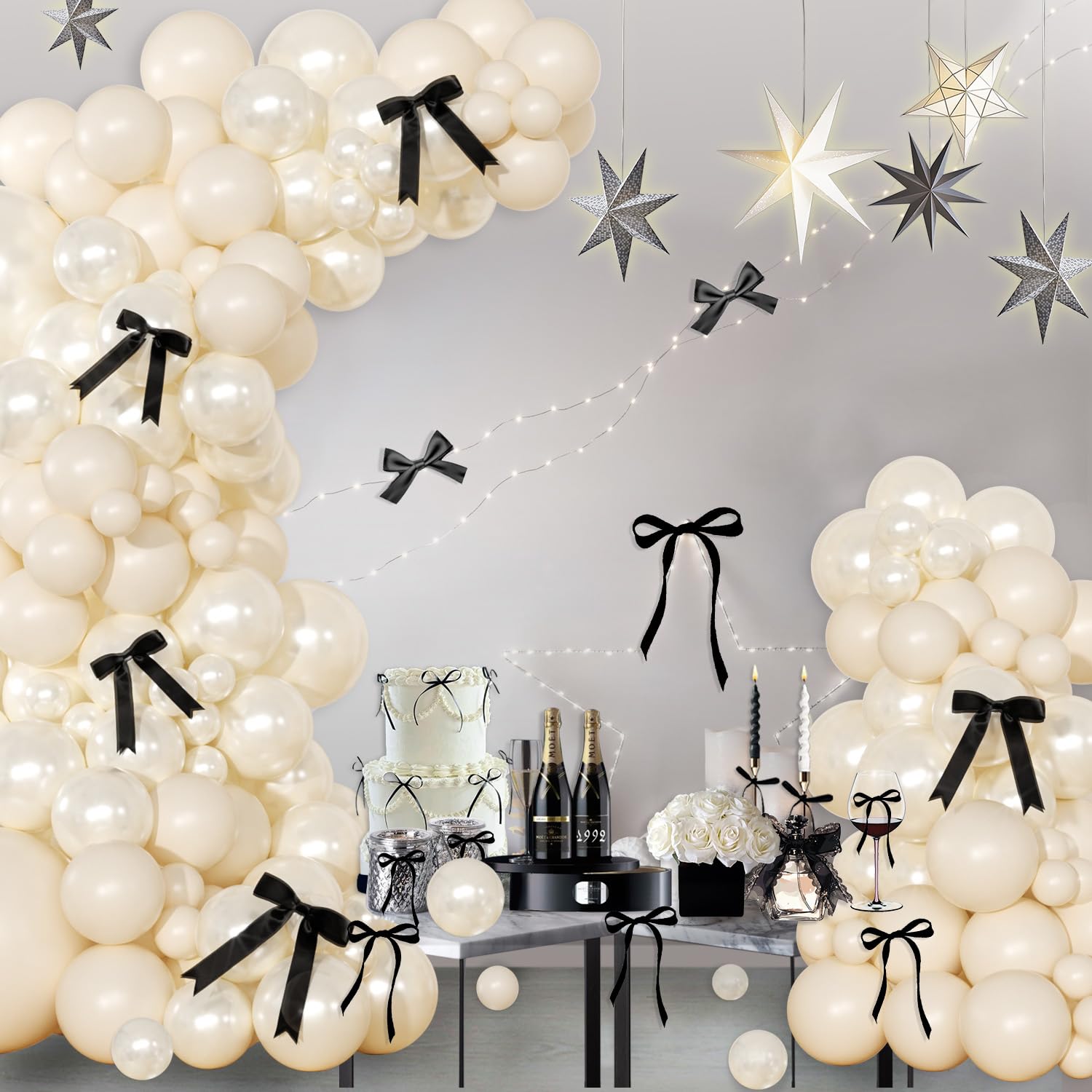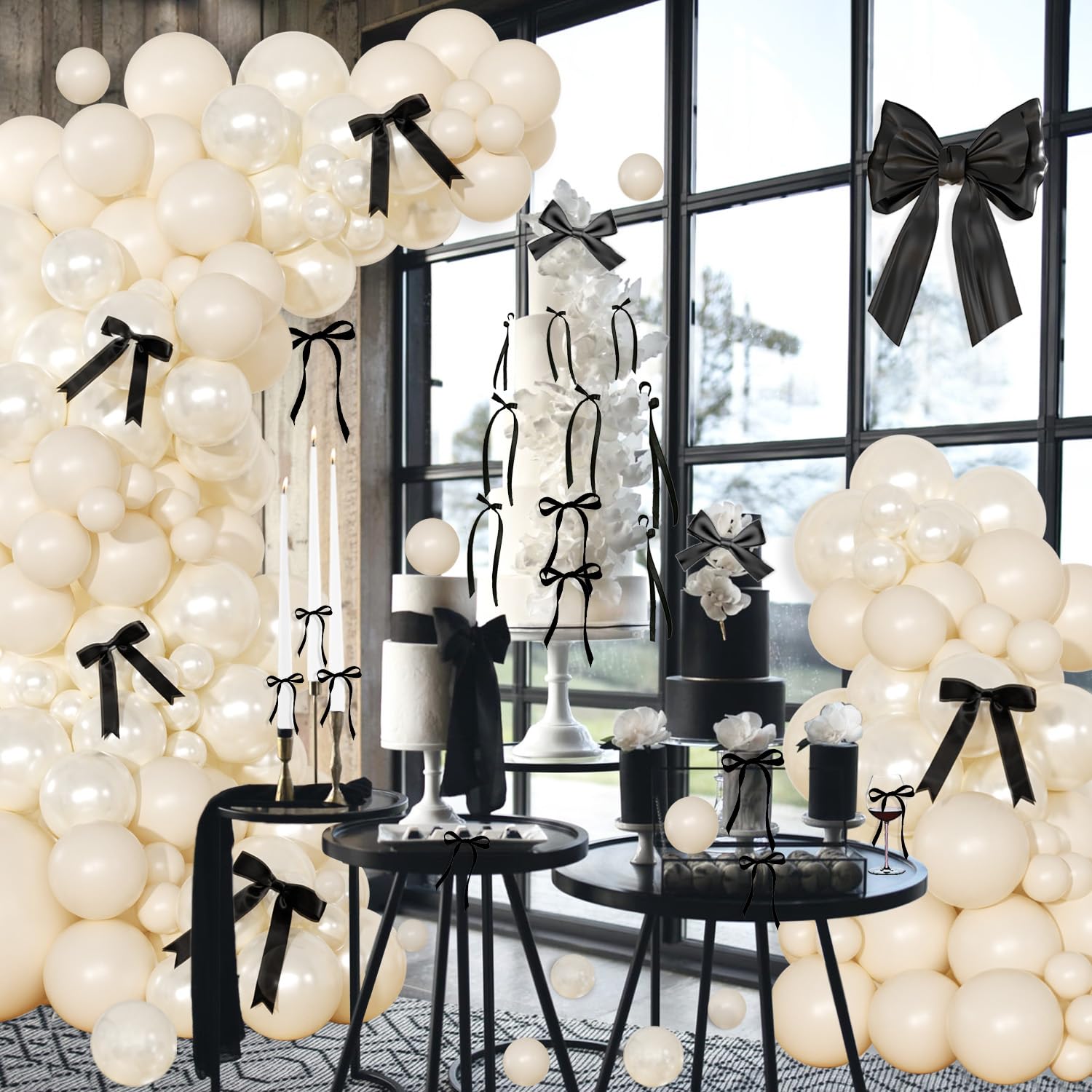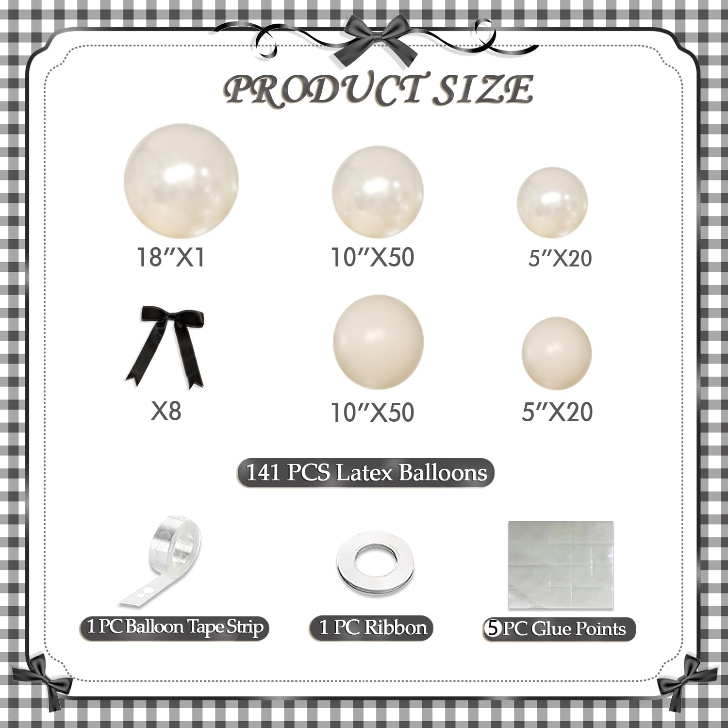 Package Include:pearl white balloon-5"*20/10”*50/18“*1; white balloon-5"*20/10"*50; white bows-8pcs