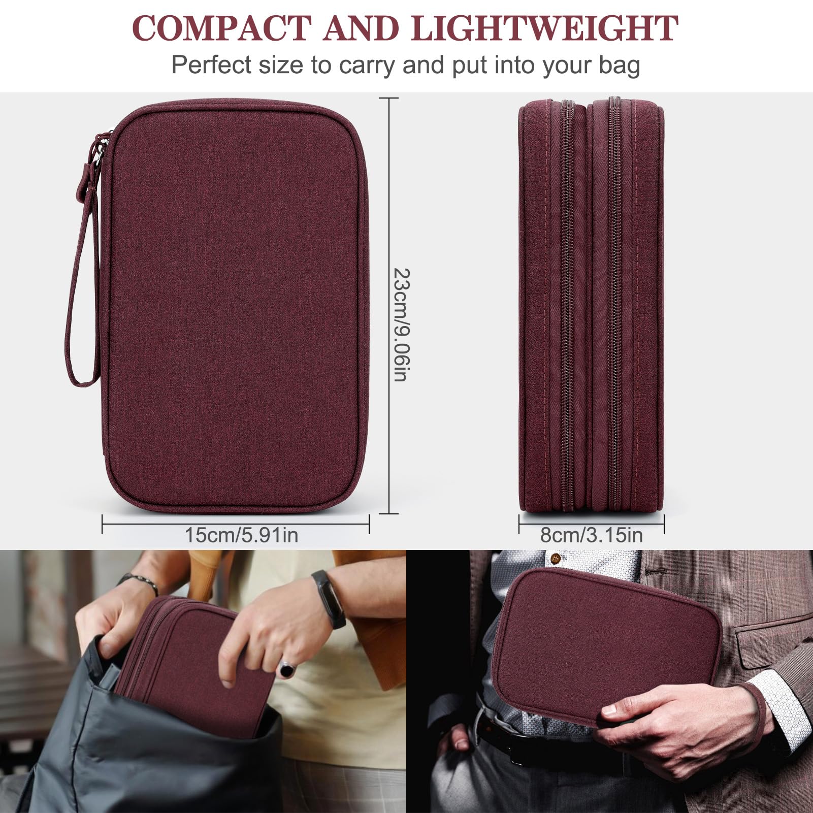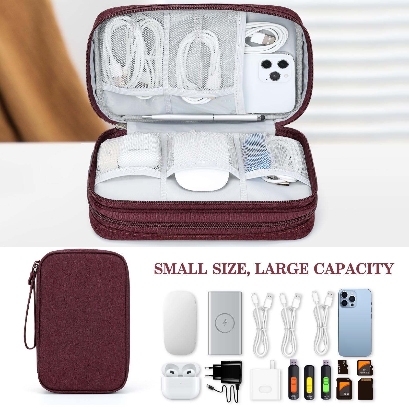Double Layers Design: The electronics storage bag has 2 layers interior compartment with enough space to take in your cords, cables, USB drive, cellphone, charger, mouse, flash drive, and other accessories.