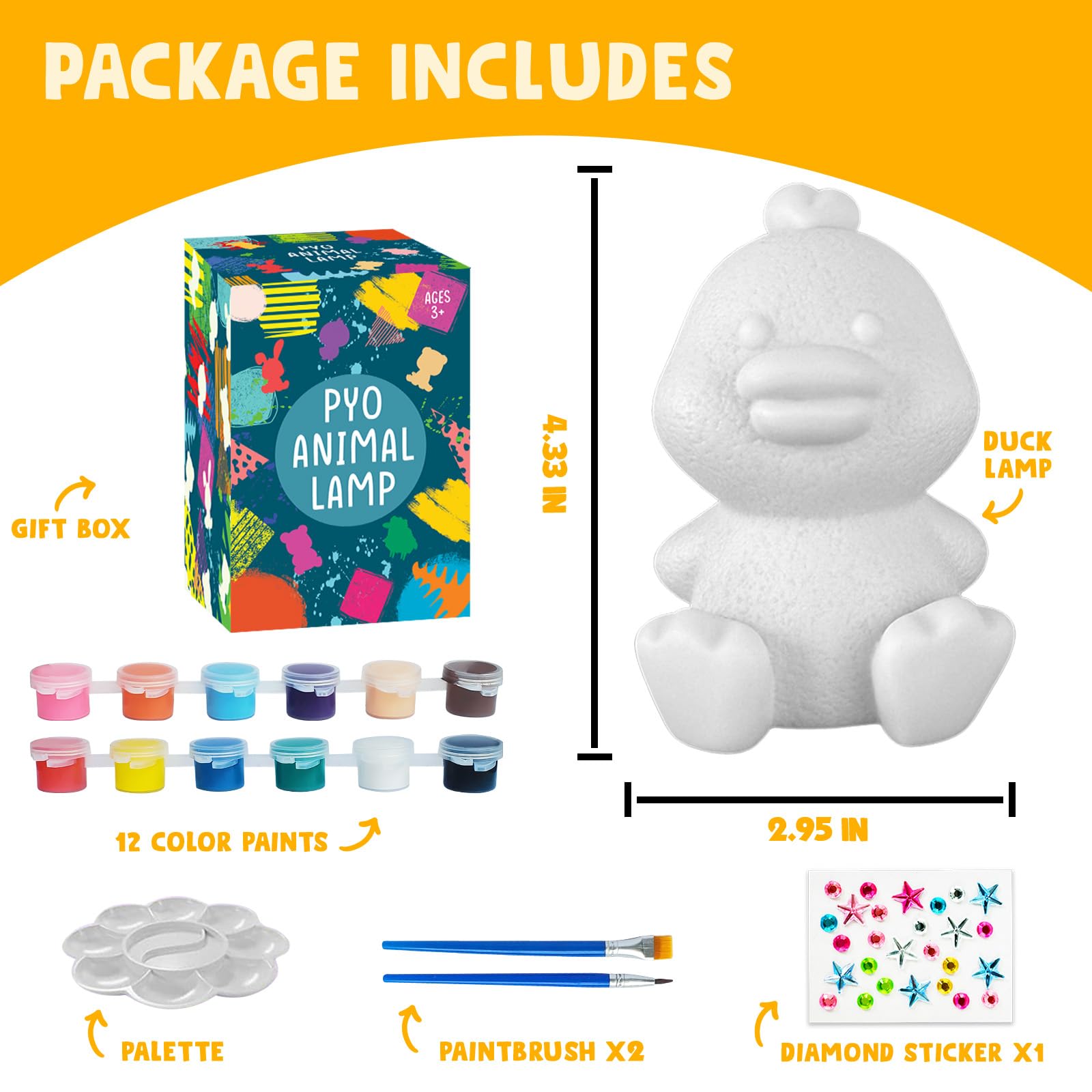 【Complete Craft Kit for Endless Fun】Dive into the world of creativity with our Paint Your Own Duck Lamp kit! This set includes 1 duck lamp, 12 paint colors, 2 brushes, a palette and sticker. This kit promises hours of fun and creativity for arts and crafts enthusiasts aged 4-12.