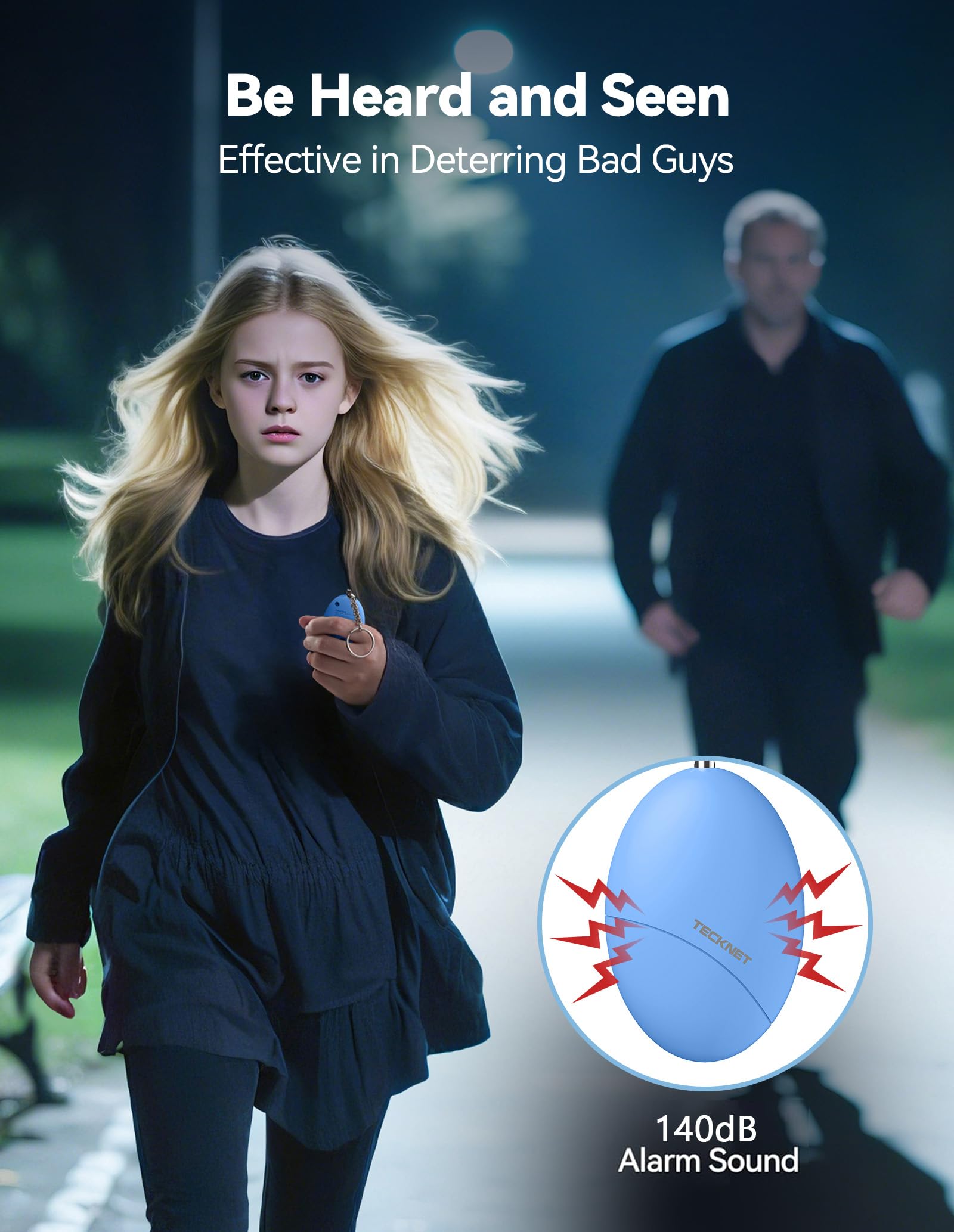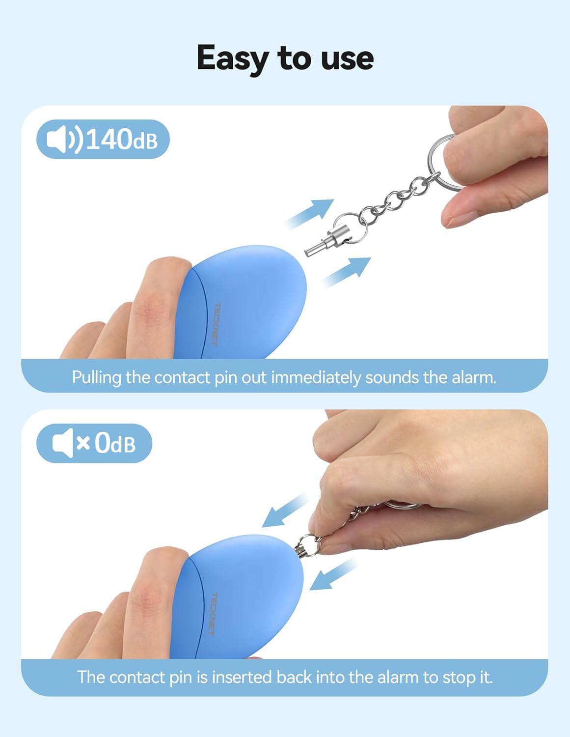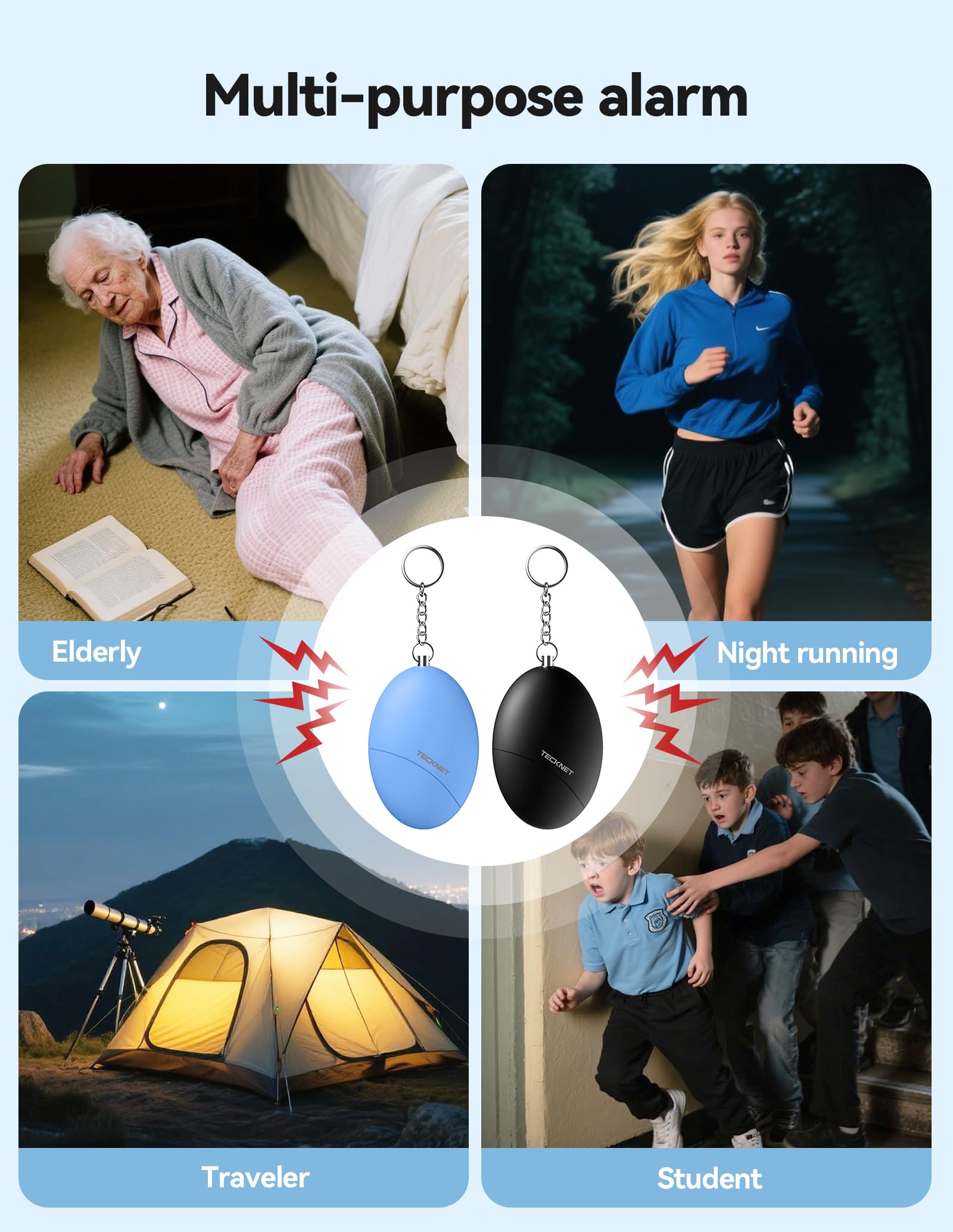 IP44 Waterproof Personal Alarm: Our personal safety alarm is made of high quality ABS material, which is resistant to drop, pressure and high temperature, and has a waterproof rating of IP44. Whether you are running late at night, hiking in the rain or snow, or going out for a camping trip, always have the TECKNET personal safety alarm by your side.