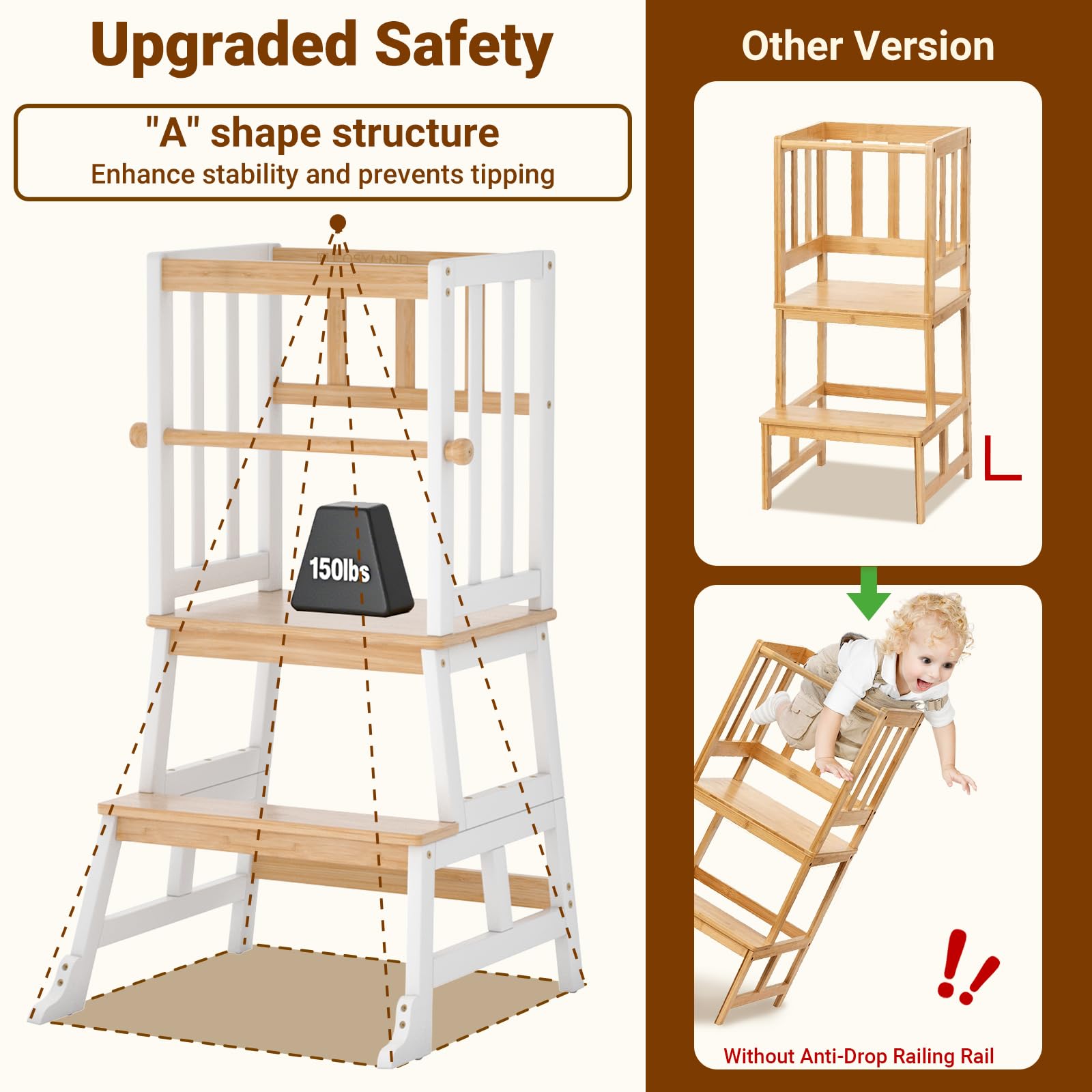 "A" structure is more stable: Designed and tested to exceed child safety standards. “A” Shape structure reduces risk of toppling. Non-slip feet. The four-sided railings provide support with an additional removable anti-fall bar as needed.