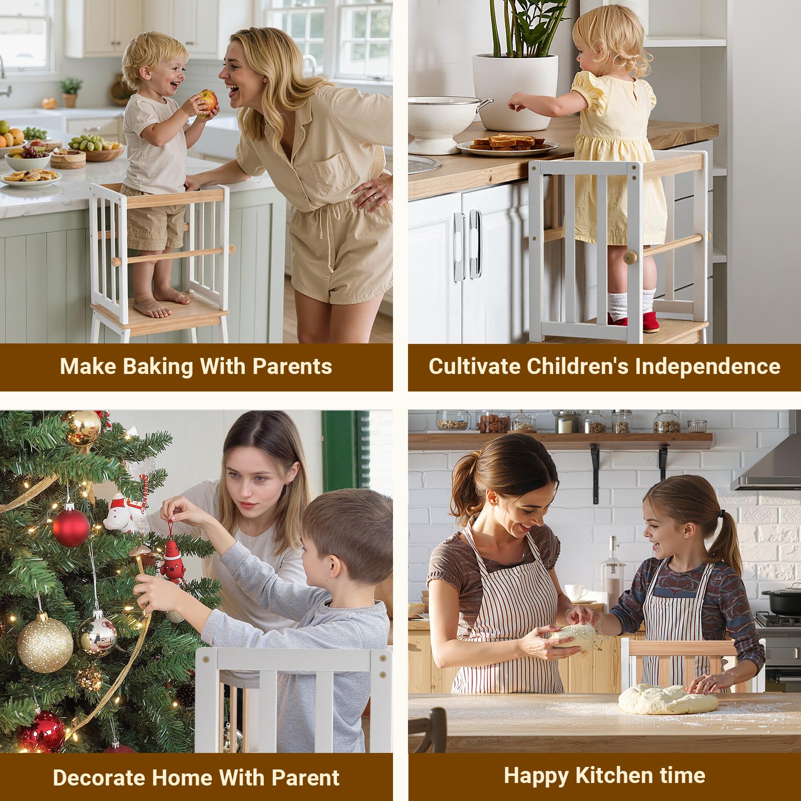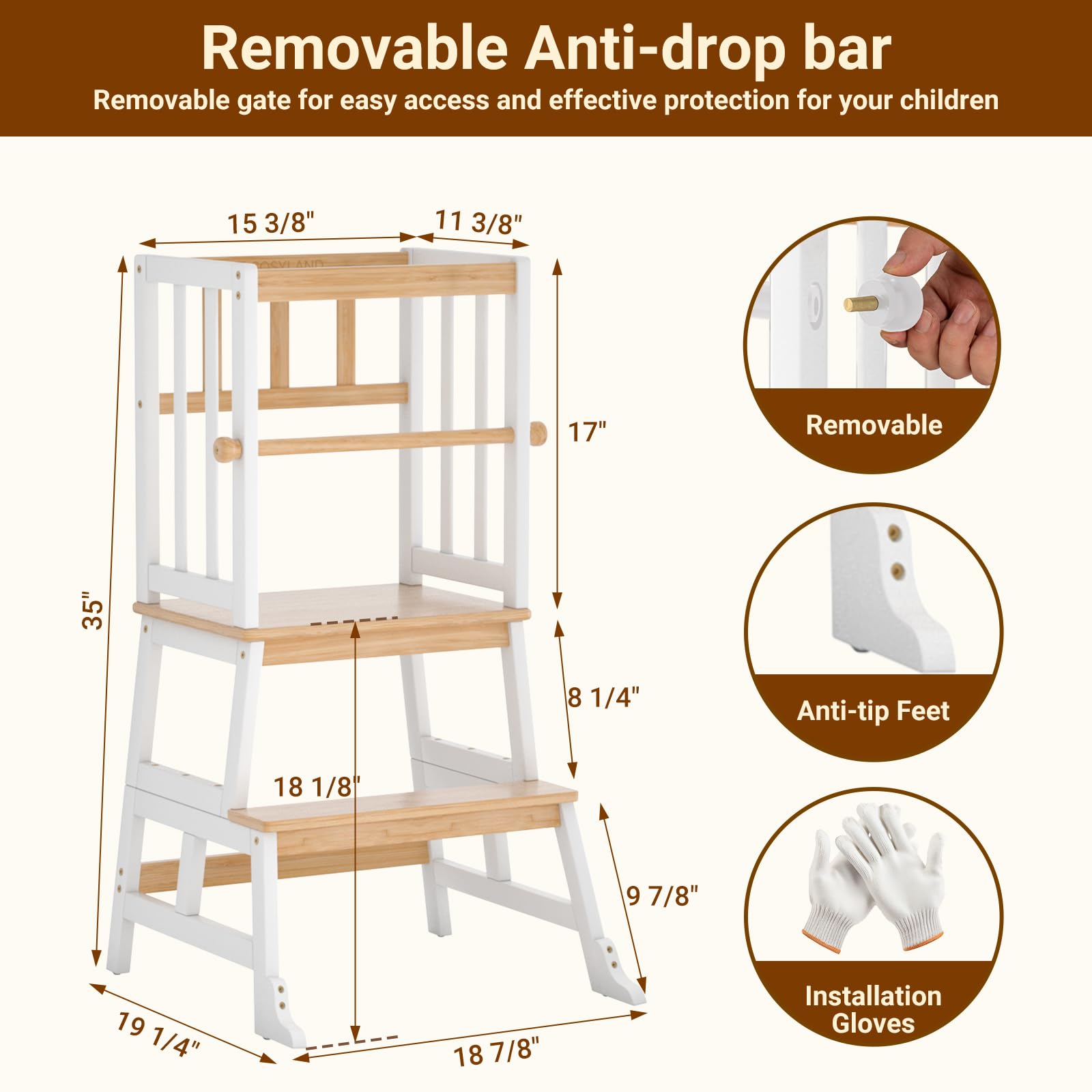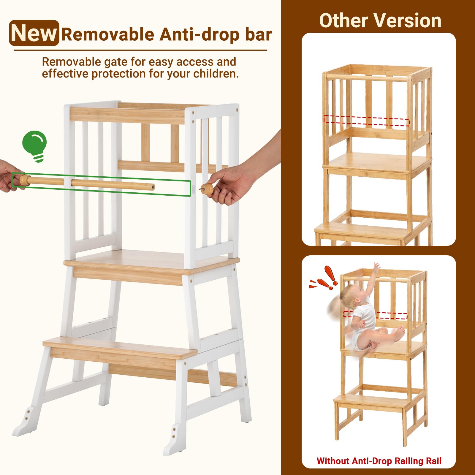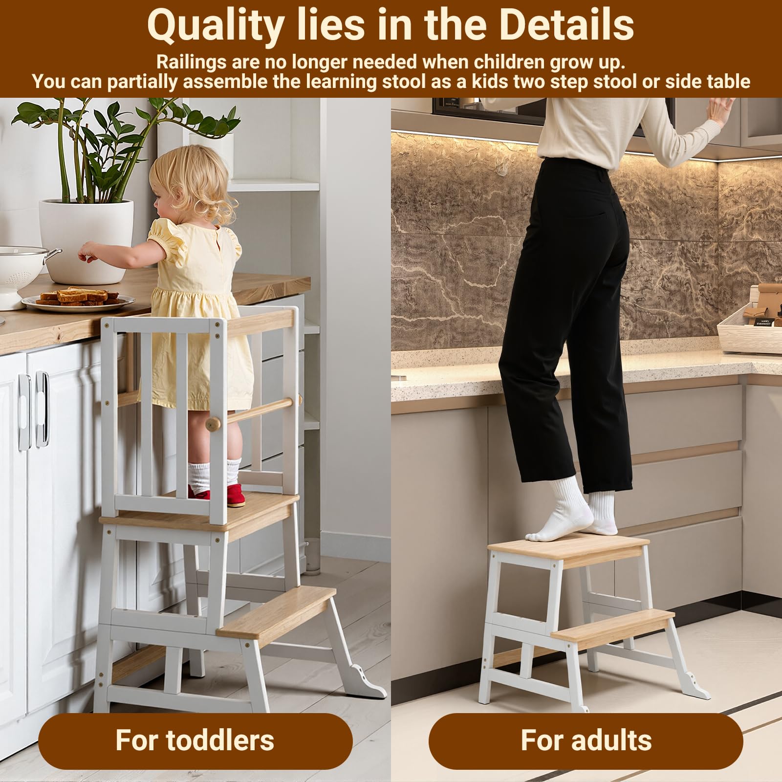 MADE TO LAST: This Sturdy tower stool for learning is made from solid natural bamboo with a child-safe, meticulous finish that prevents scratches and scuff marks. Safely supports 150 lbs for toddlers 18 months to 3 years old.