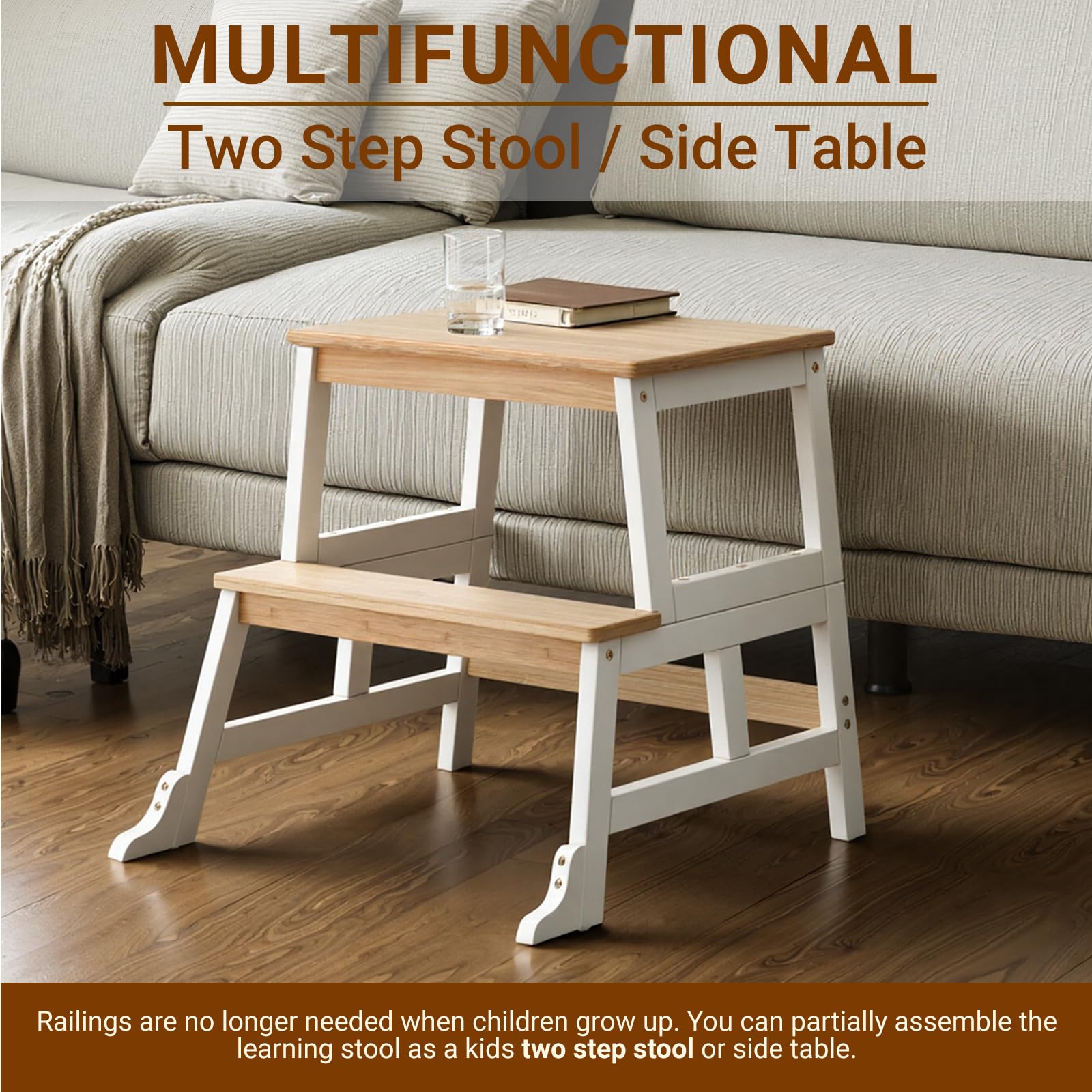 STRONG AND VERSATILE: Hand-selected sustainable bamboo is sturdy and lighter than other woods, and has rich colors. It also functions as a little table/desk, and as steps that can take the weight of adults when needed.