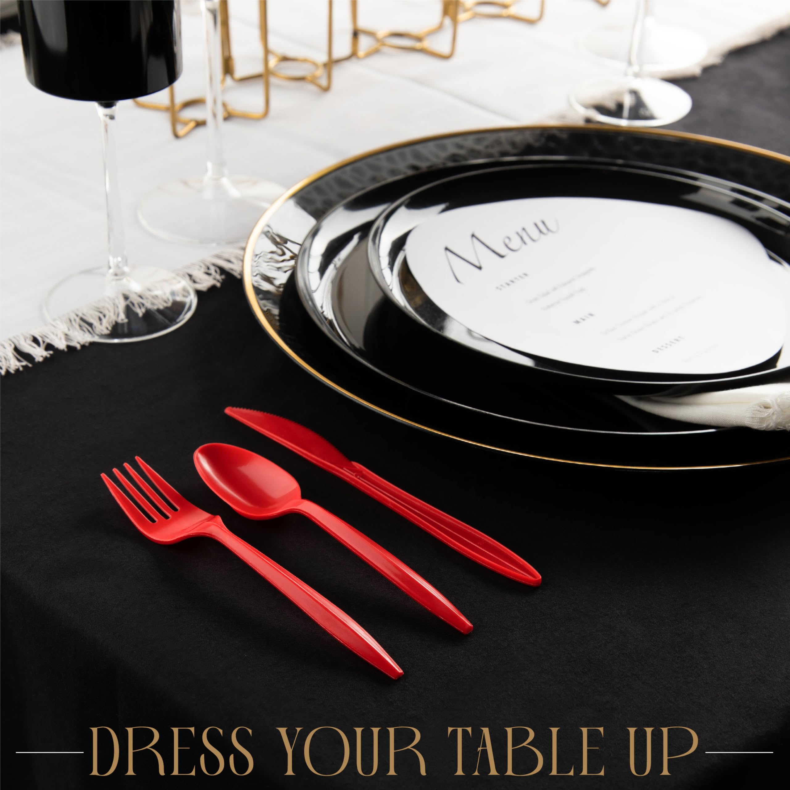 Colored cutlery set for parties and events. A variety of colors available to suit any taste or party theme. Perfect cutlery set for birthday parties, dinner, bbq, holiday dinners and more.