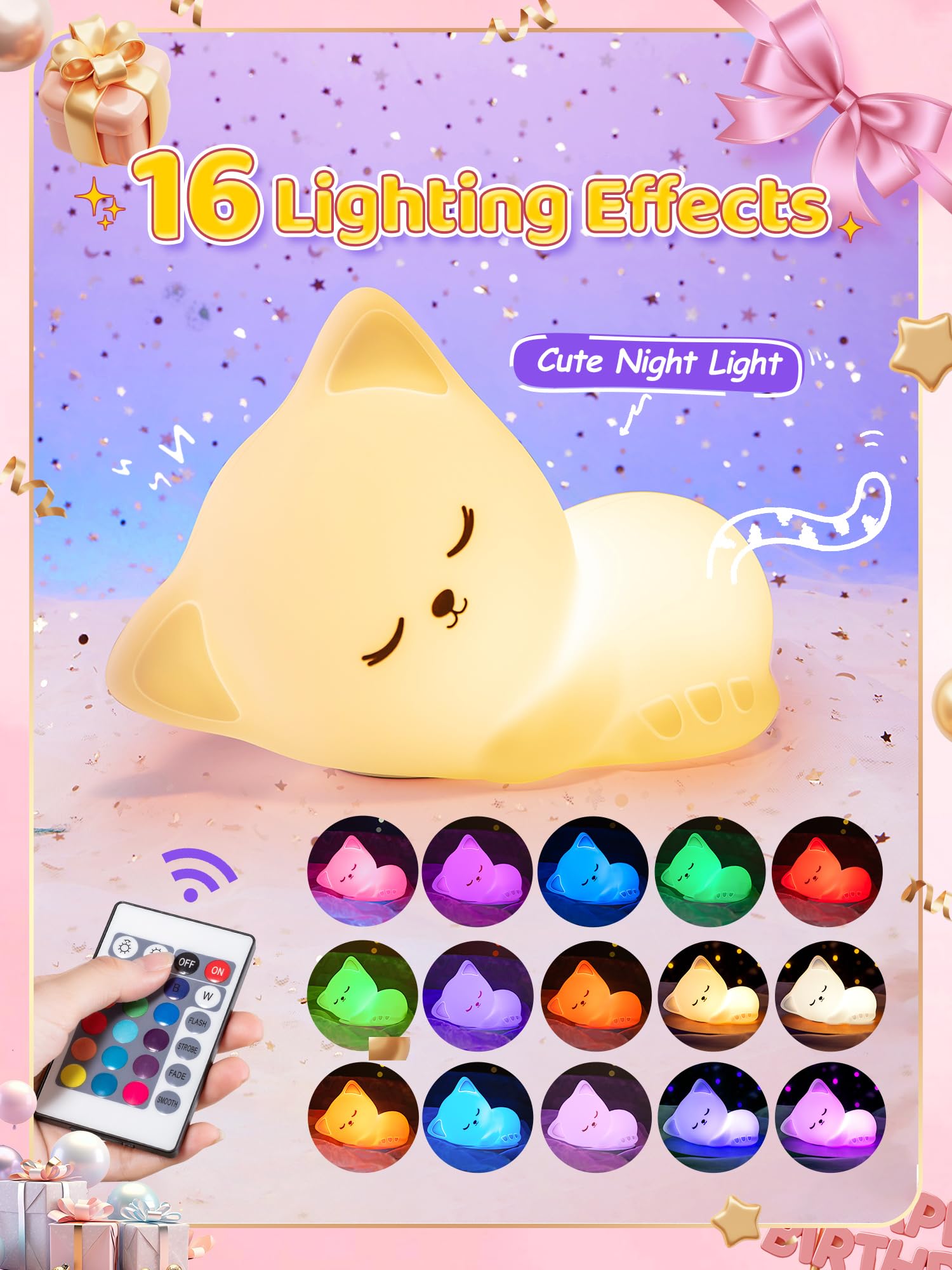 16 COLOR CHANGING & EASY CONTROL CAT GIFTS FOR GIRLS: Cute gifts is in 16 single color & color breathe modes,with 2 kinds of led brightness.After activating the bottom button, just tap/squeeze to turn the cat night light & cute stuff for teen girls ON/OFF,girl can choose color among 16 color-changing breathing cute night light for kids.TAP! TAP! FUN! FUN! FUN!The cat night light for kids & cute stuff for teen girls is also a baby night light and room decor for teen girls,which is suitable for mom to change diapers/breastfeed baby at night.Cat night light & cute stuff for teen girls & baby night light soothe baby emotions,keep nightmares away & guard your family every night.