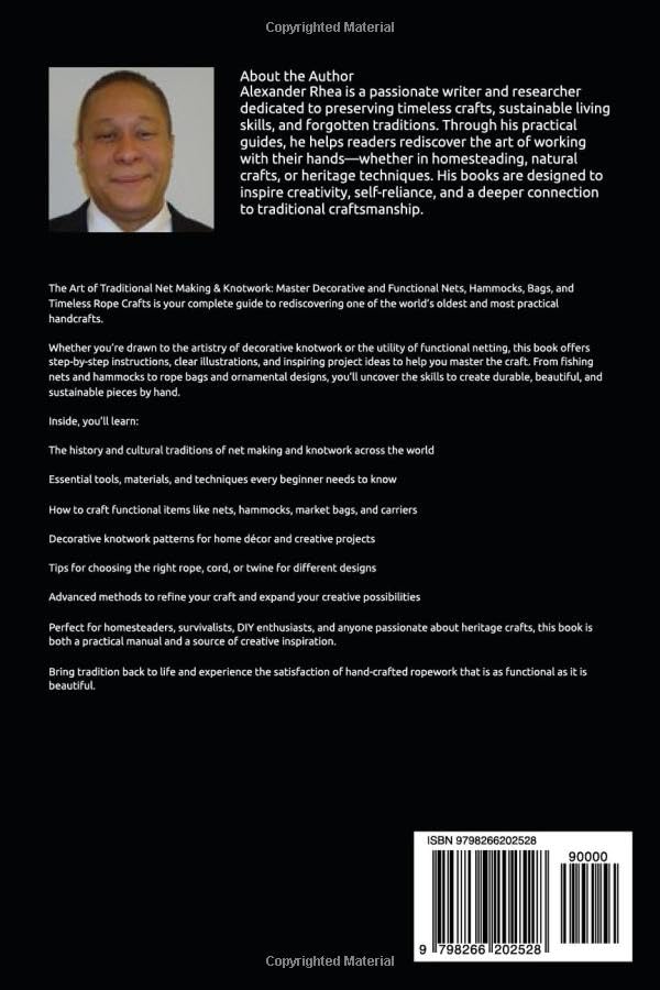 The Art of Traditional Net Making & Knotwork: Master Decorative and Functional Nets, Hammocks, Bags, and Timeless Rope Crafts is your complete guide to rediscovering one of the world’s oldest and most practical handcrafts. Whether you’re drawn to the artistry of decorative knotwork or the utility of functional netting, this book offers step-by-step instructions, clear illustrations, and inspiring project ideas to help you master the craft. From fishing nets and hammocks to rope bags and ornamental designs, you’ll uncover the skills to create durable, beautiful, and sustainable pieces by hand. Inside, you’ll learn: The history and cultural traditions of net making and knotwork across the world Essential tools, materials, and techniques every beginner needs to know How to craft functional items like nets, hammocks, market bags, and carriers Decorative knotwork patterns for home décor and creative projects Tips for choosing the right rope, cord, or twine for different designs Advanced methods to refine your craft and expand your creative possibilities Perfect for homesteaders, survivalists, DIY enthusiasts, and anyone passionate about heritage crafts, this book is both a practical manual and a source of creative inspiration. Bring tradition back to life and experience the satisfaction of hand-crafted ropework that is as functional as it is beautiful.