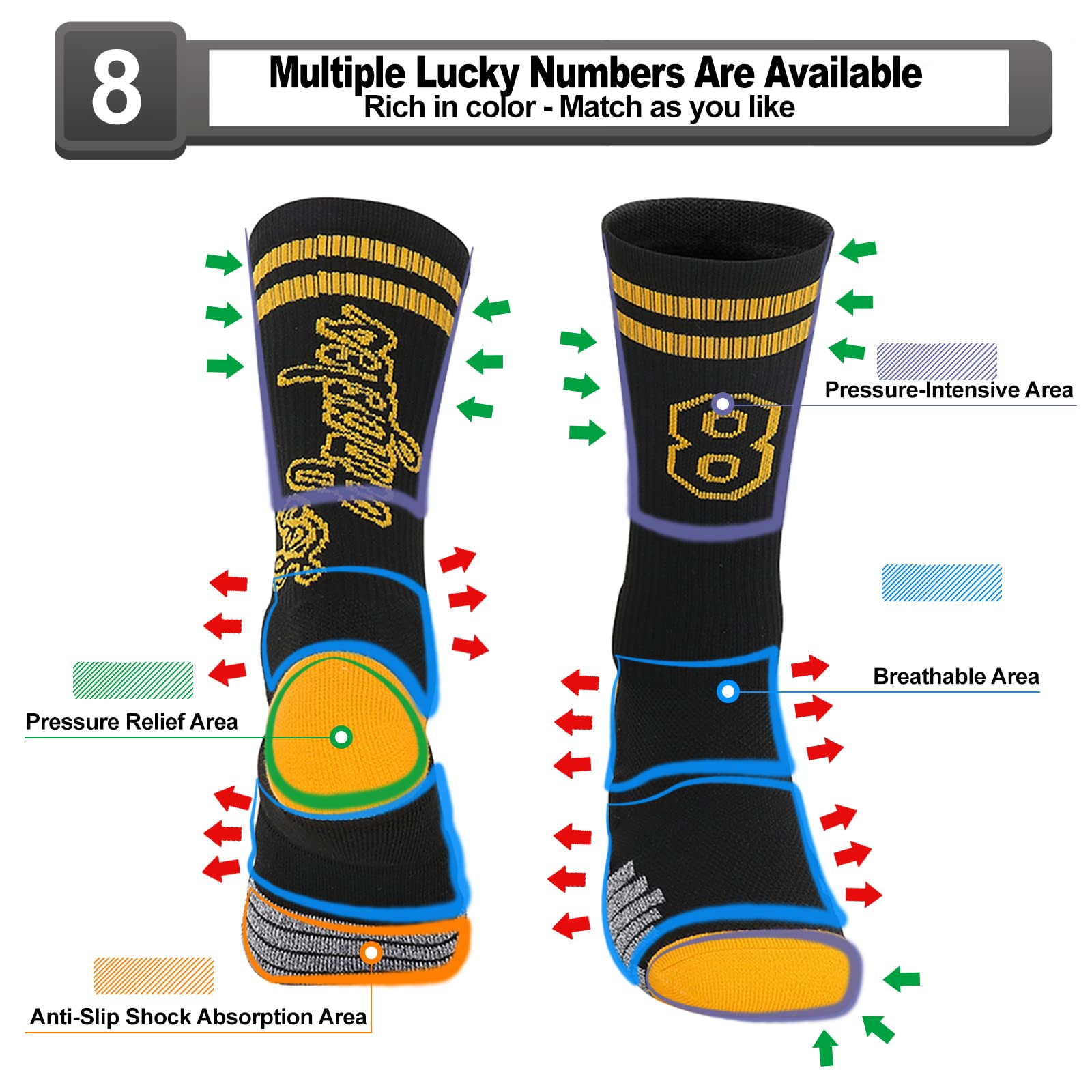 🧦 Profession Creates Comfort - For a demanding sport like basketball, our professional designers have carefully and reasonably designed to increase the pressure-intensive areas, pressure relief areas, ventilation areas, and non-slip shock absorption areas to ensure more comfortable wearing. We also have to ensure that your entire foot is fully supported during high-impact moments of the game.
