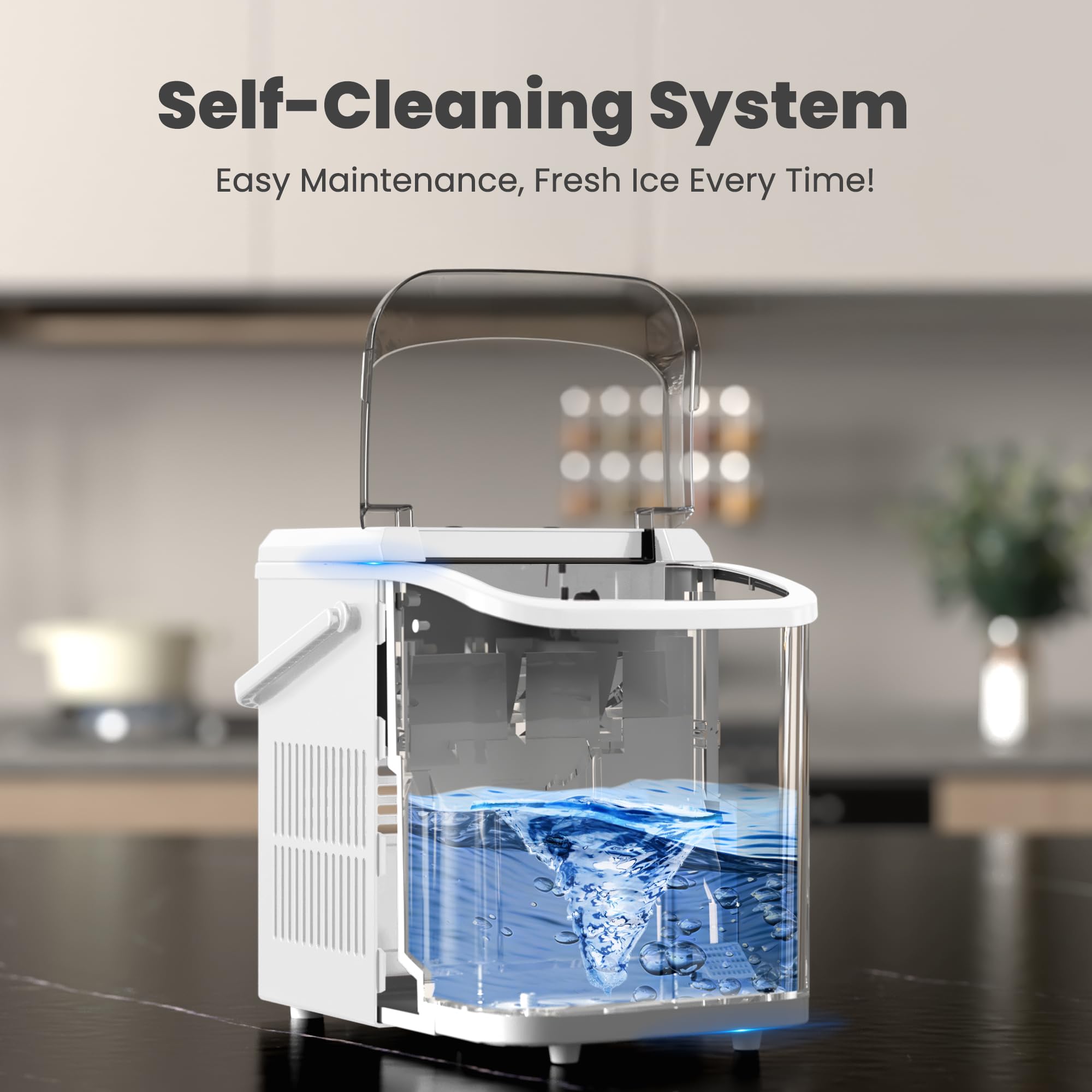SELF-CLEANING FUNCTION: The countertop ice machine has a self-cleaning function that can be activated by pressing the on/off button for 5 seconds. This will ensure that you can enjoy clean and healthy ice in addition to allowing you to clean it quickly and easily. This ice cube maker comes with an ice scoop and a removable ice basket in the package.