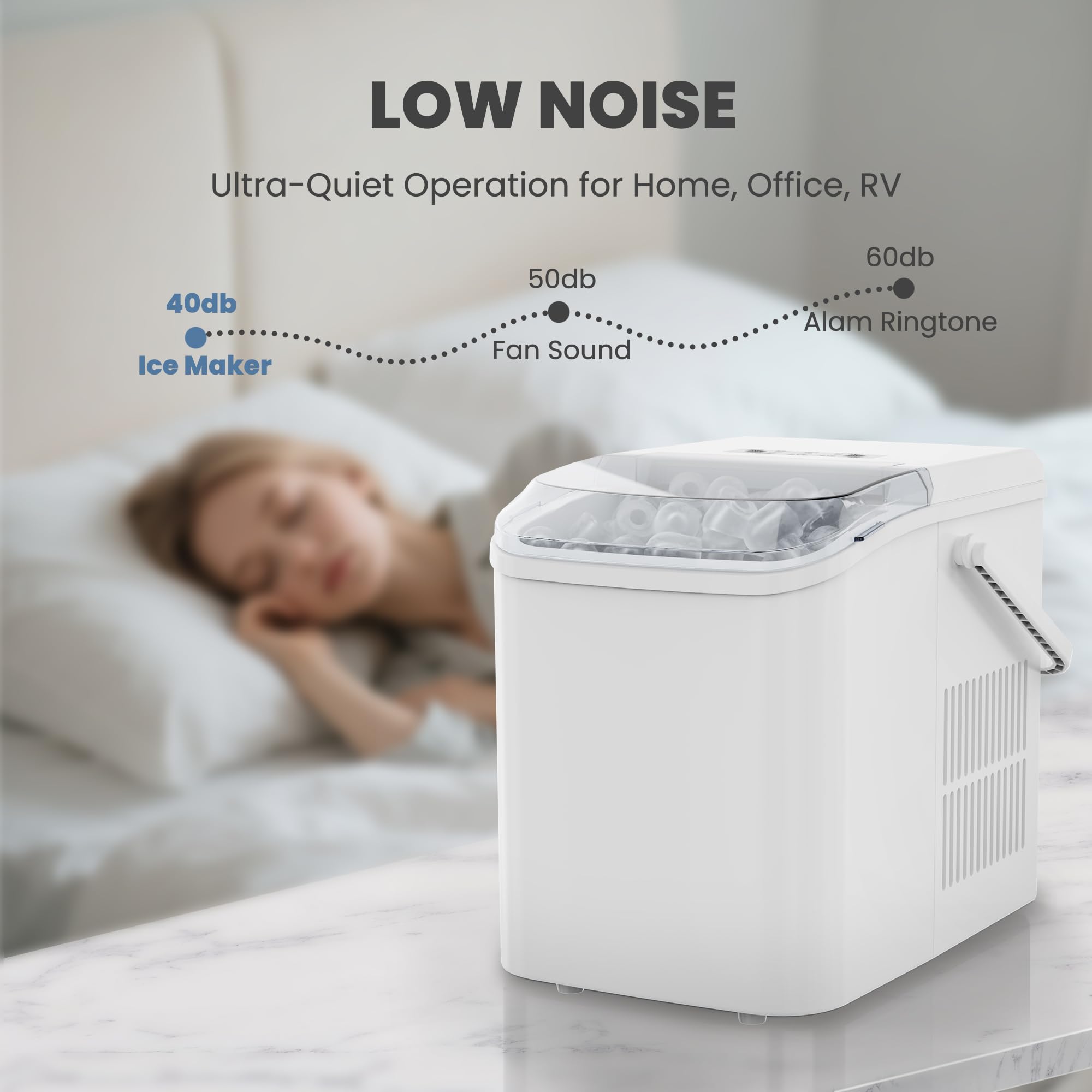 SMART & SIMPLE OPERATION: The control panel is very easy to operate. Enjoy fresh ice with 3 easy steps! When the water is insufficient or the ice basket is full, the indicator light will turn on. When making ice cubes, the noise is lower than 40dB, similar to a working refrigerator.