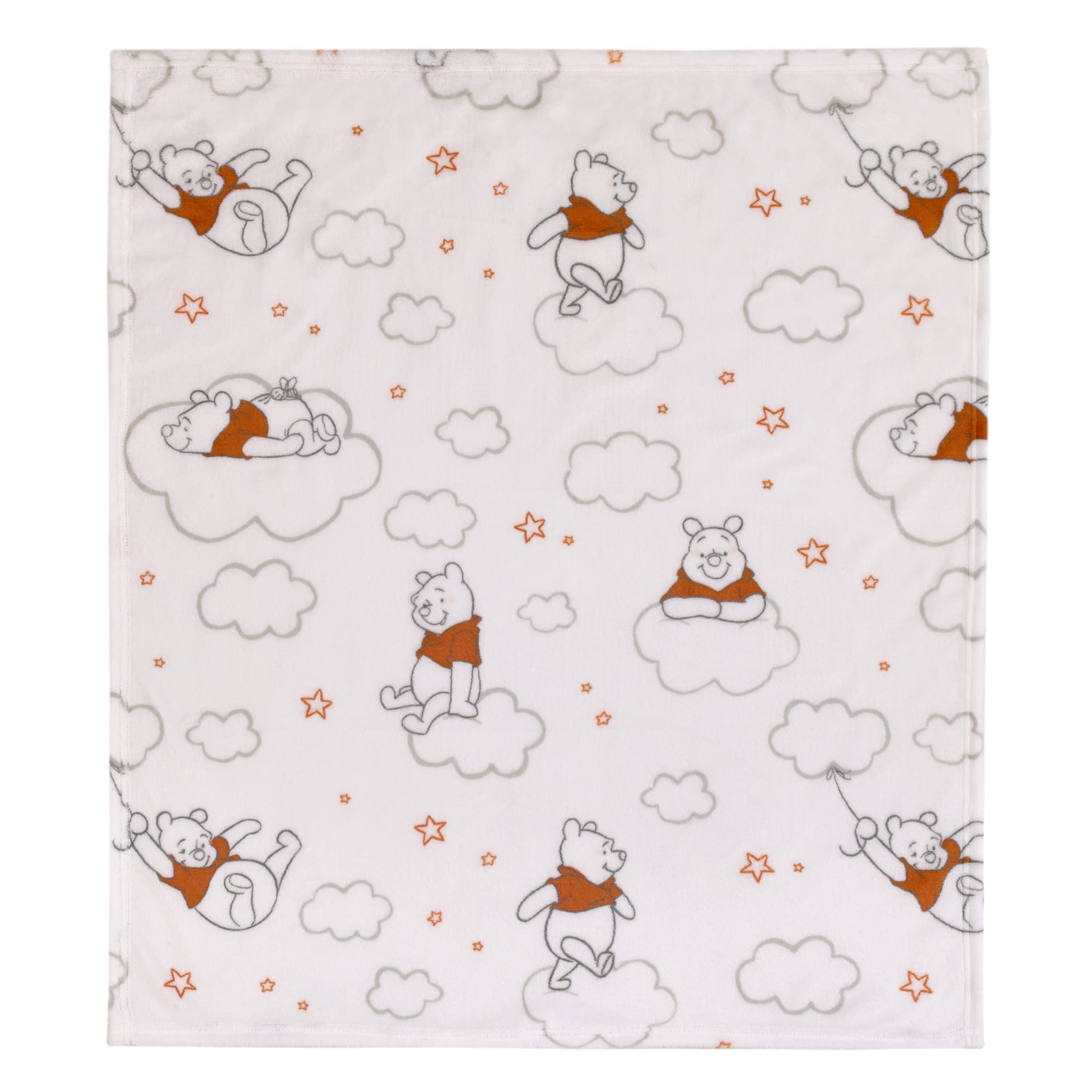 Winnie the Pooh has his head in the clouds with this adorable Disney Baby Blanket. Made of super soft plush fabrics. Features an allover pattern of our favorite friend Winnie the Pooh floating on puffy white clouds wearing his bright red shirt. Designed in shades of white and red with gray outline. This baby blanket measures 30" x 36"; perfect size for cuddling, use in the stroller, travel in the car, and great for baby's and moms on-the-go! Makes a wonderful gift!