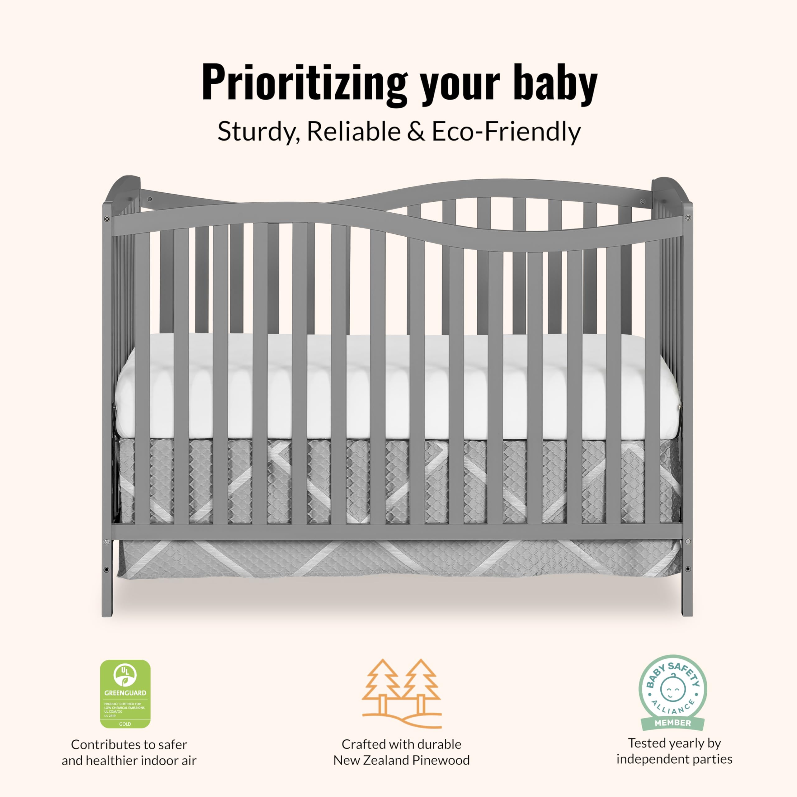 SAFETY FIRST: The crib has stationary sides for added security. All our cribs are JPMA Certified to meet/exceed CPSC/ASTM safety standards. Our products are tested by 3rd party labs for lead/other toxic elements to meet/exceed CPSC/ASTM safety standards