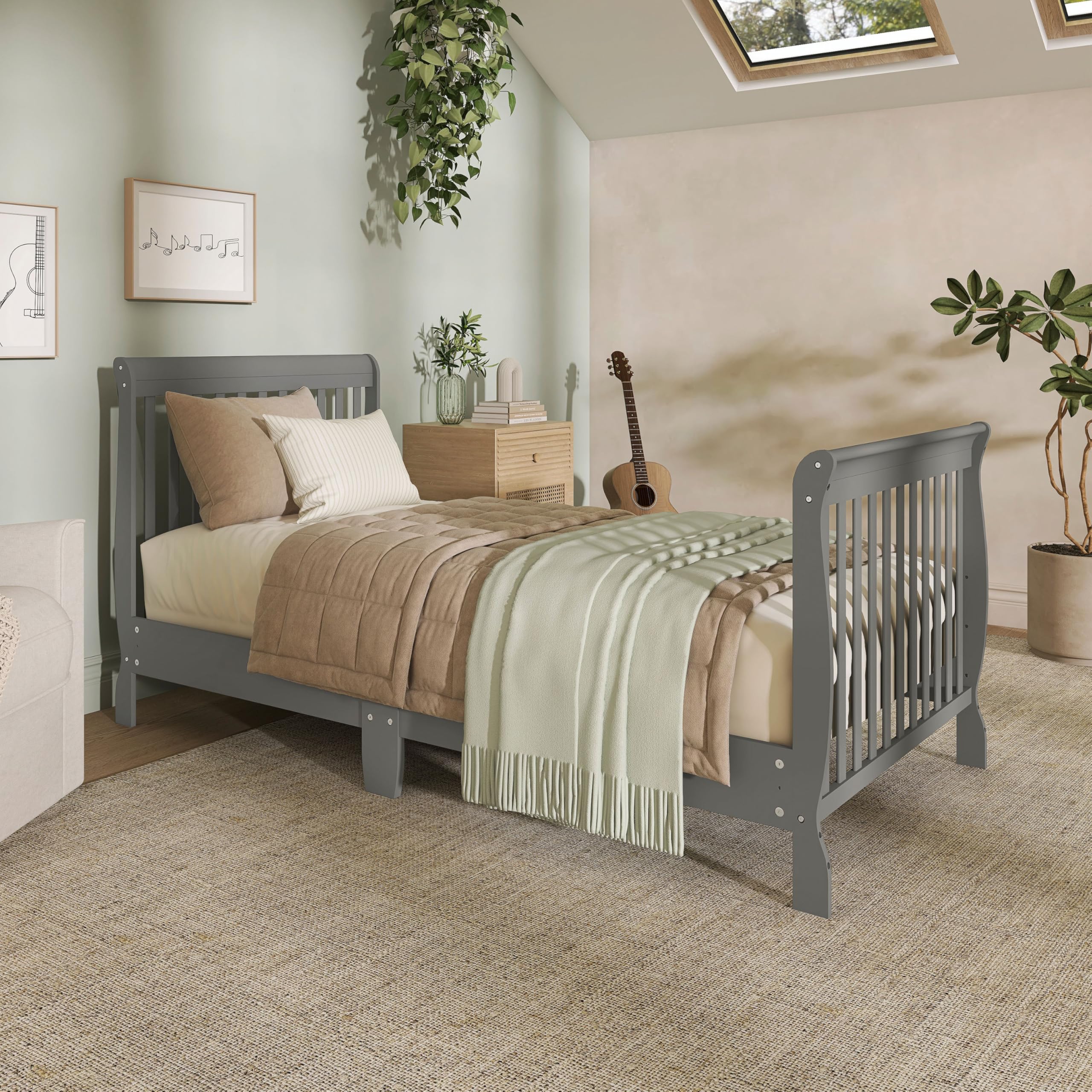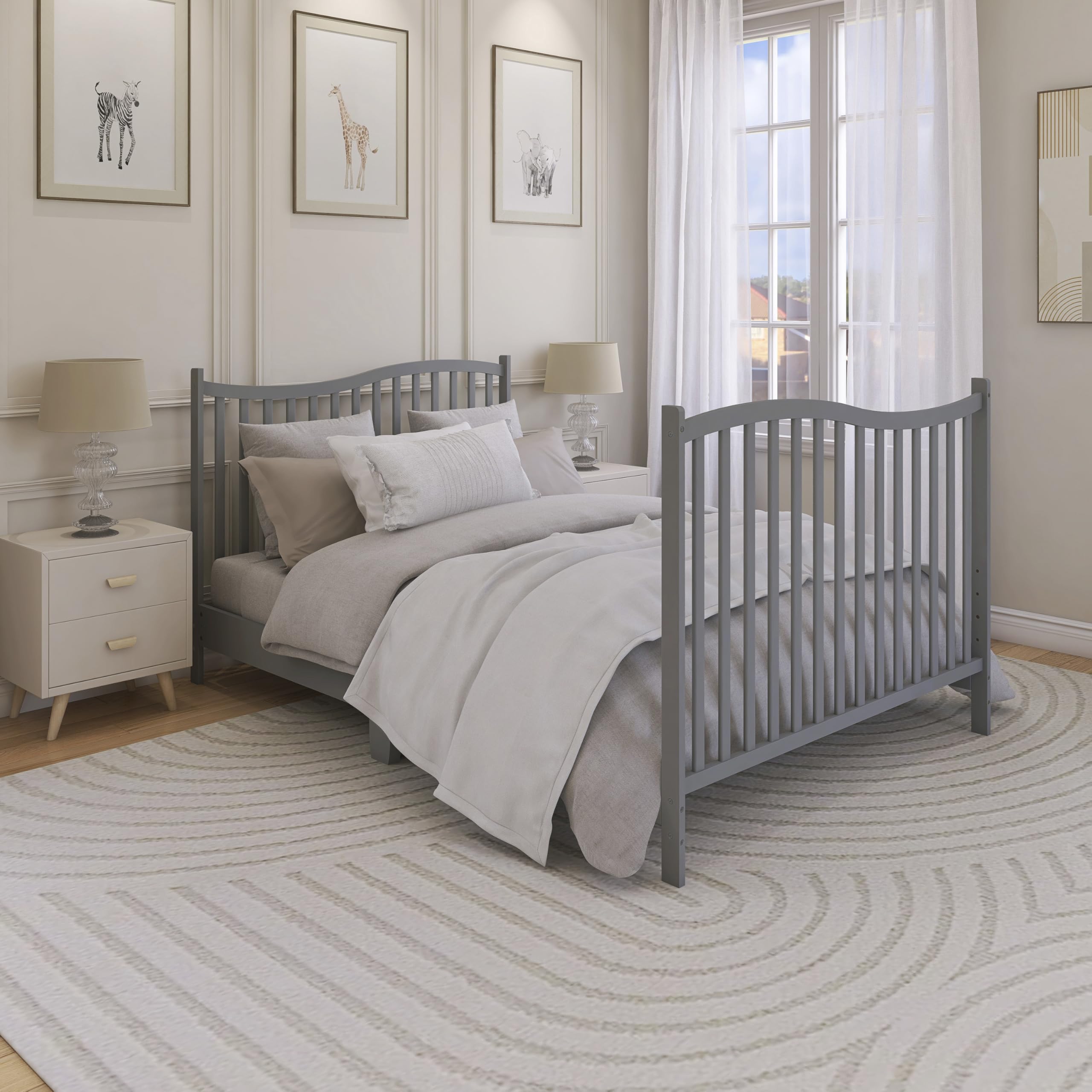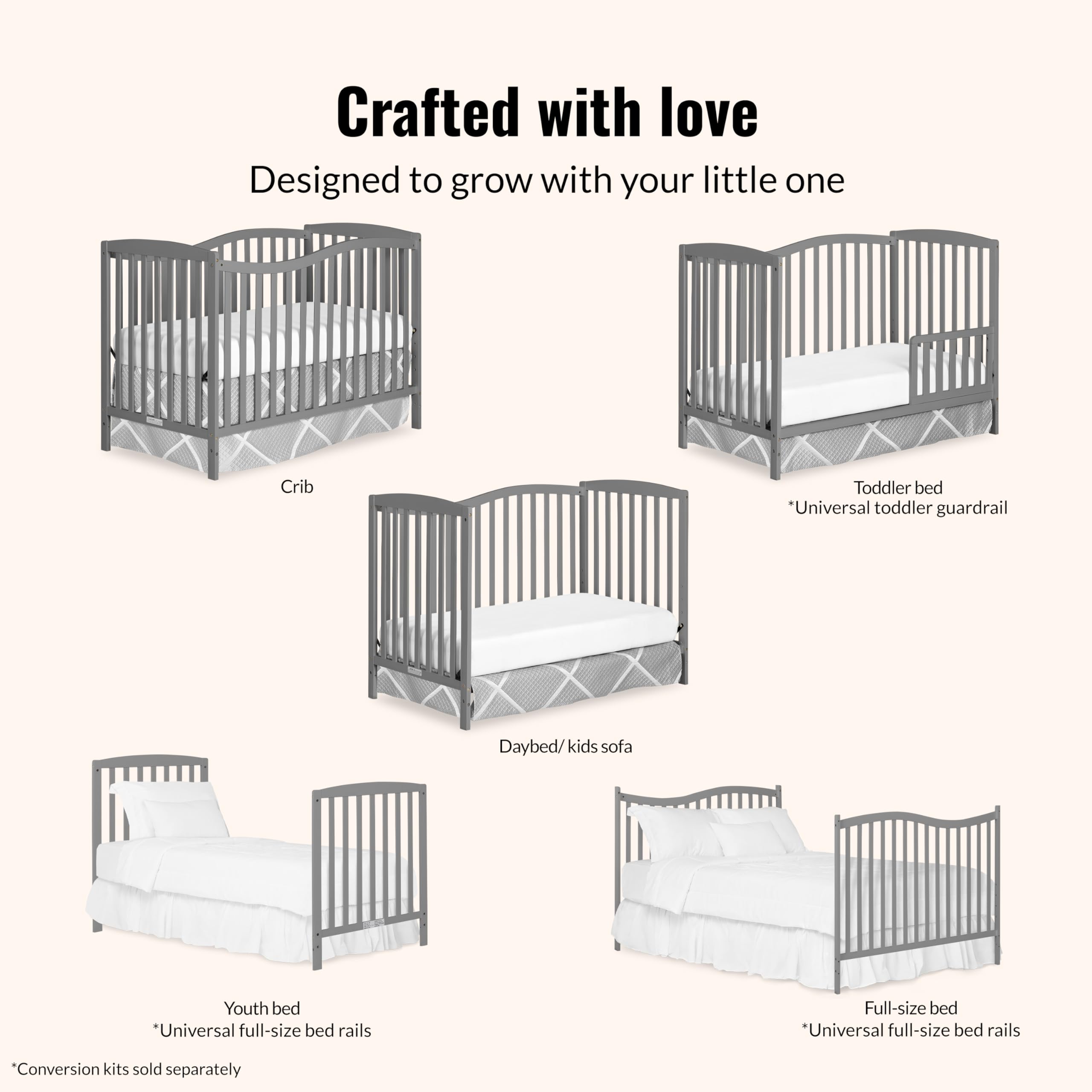 5-IN-1 CONVERTIBILITY: The graceful Chelsea keeps pace with your child, converting into a comfy toddler bed, daybed and full size bed as your child grows (toddler guardrail, stabilizer, full size rail and bed frame sold separately)
