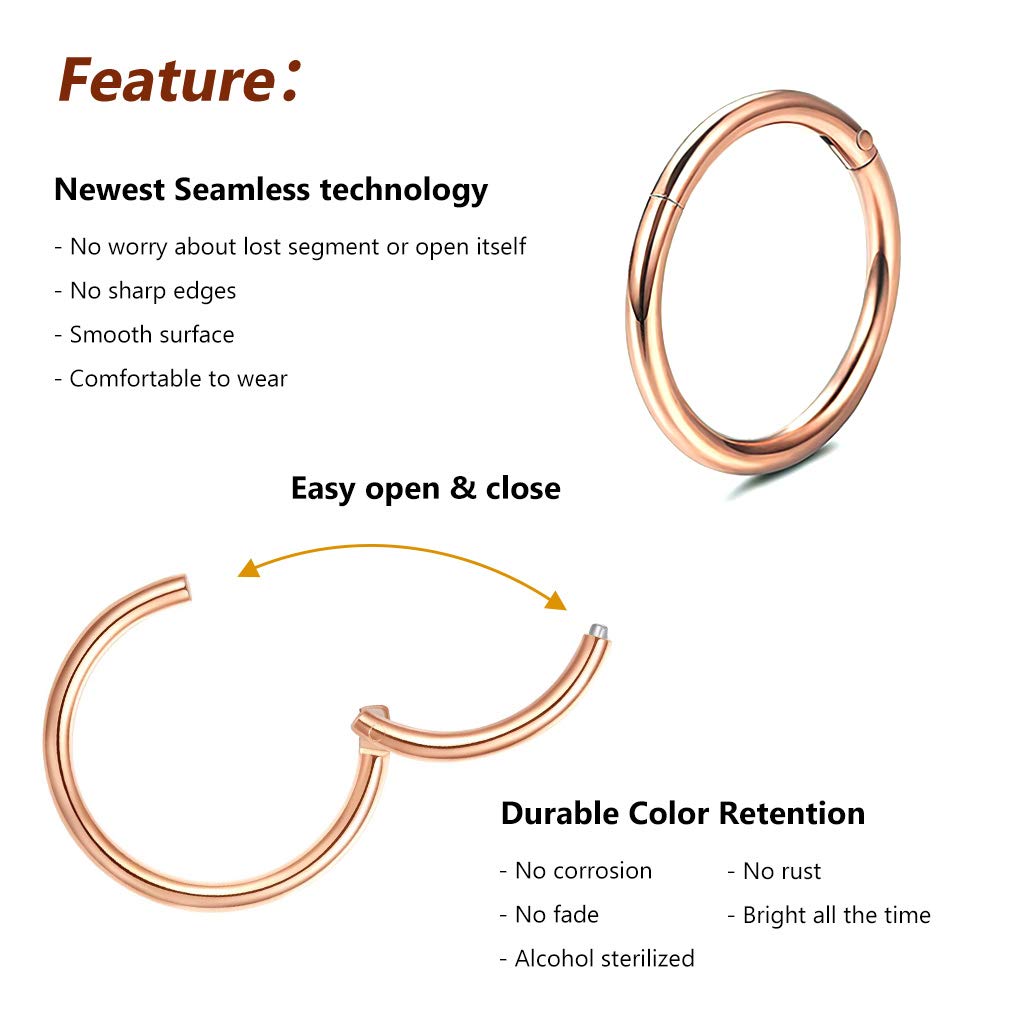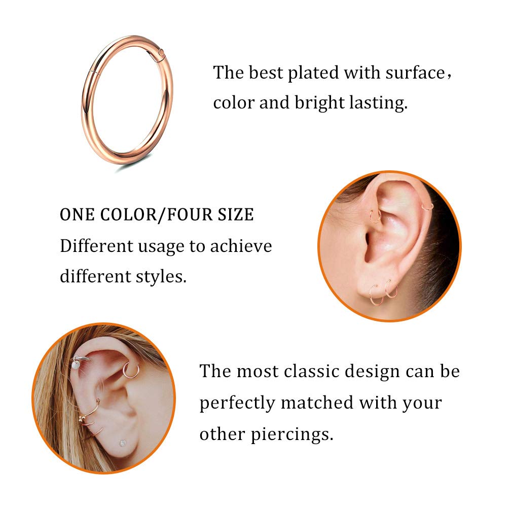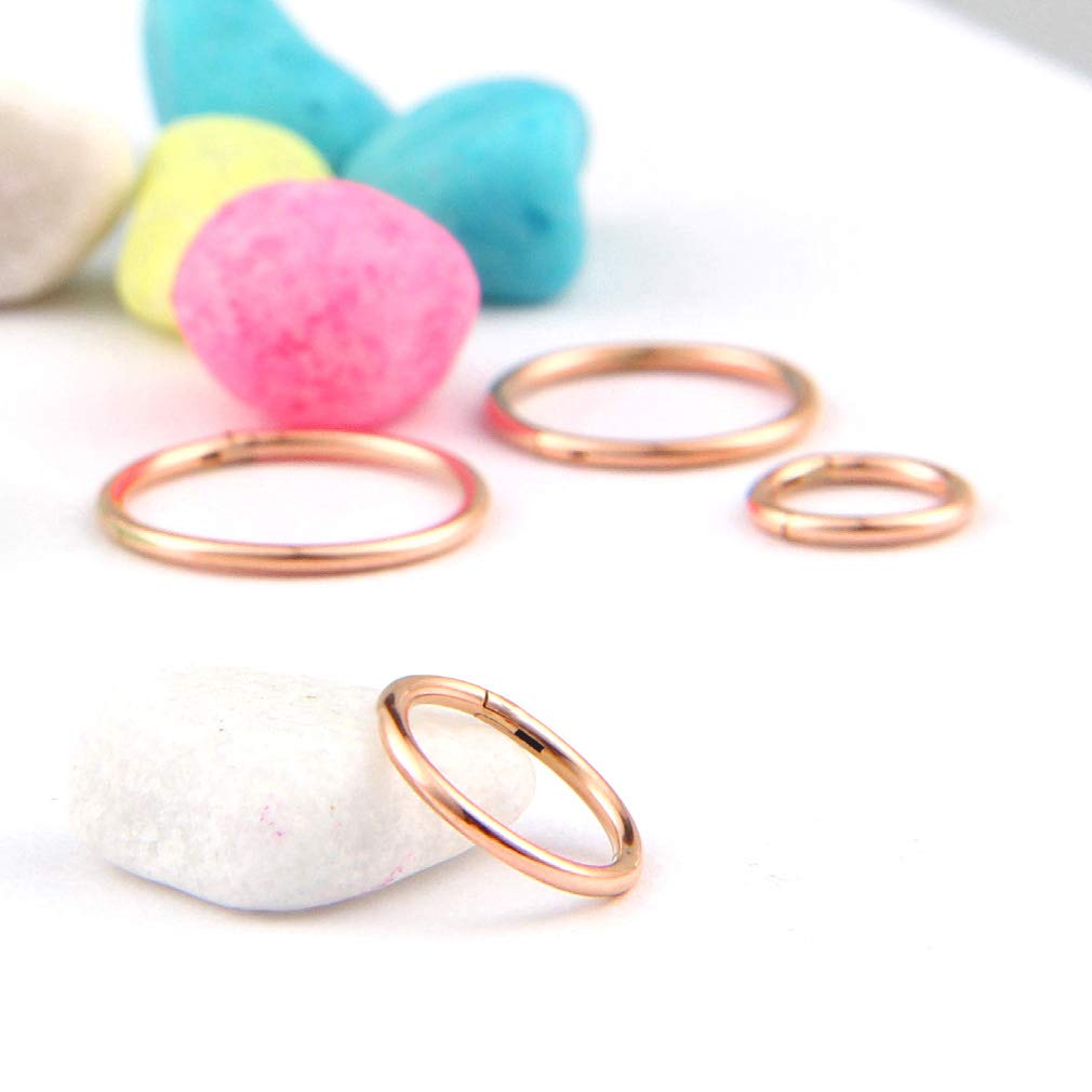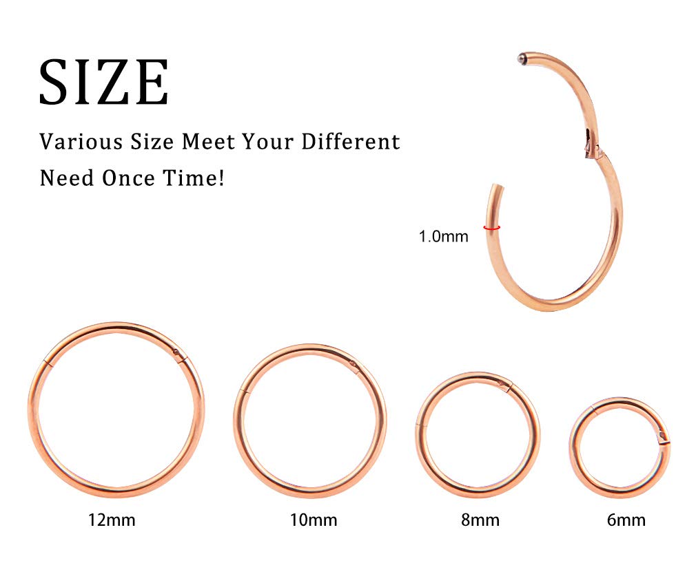 【Various Size with One Color】18G rose gold 6mm 8mm 10mm 12mm 4 Pcs segment hoop nose ring. One order come with 4 sizes one Color. Various size meet your different need once time. And in this four sizes, you will find the size that suits you best.