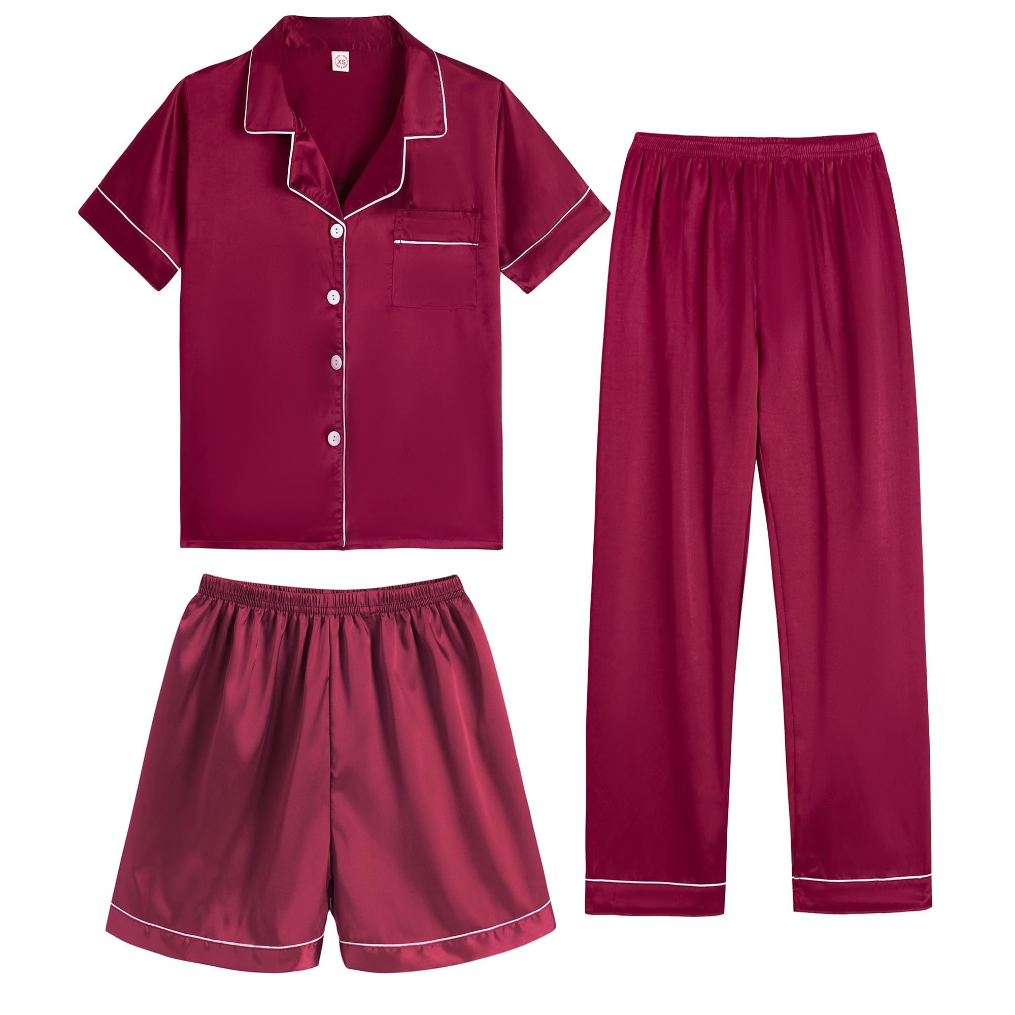 Classic and cute 3-piece satin pajamas set. Short sleeve notch collar button-down top match elastic waist shorts and pants. Simple design with chest pocket. Pure colors for many choices.