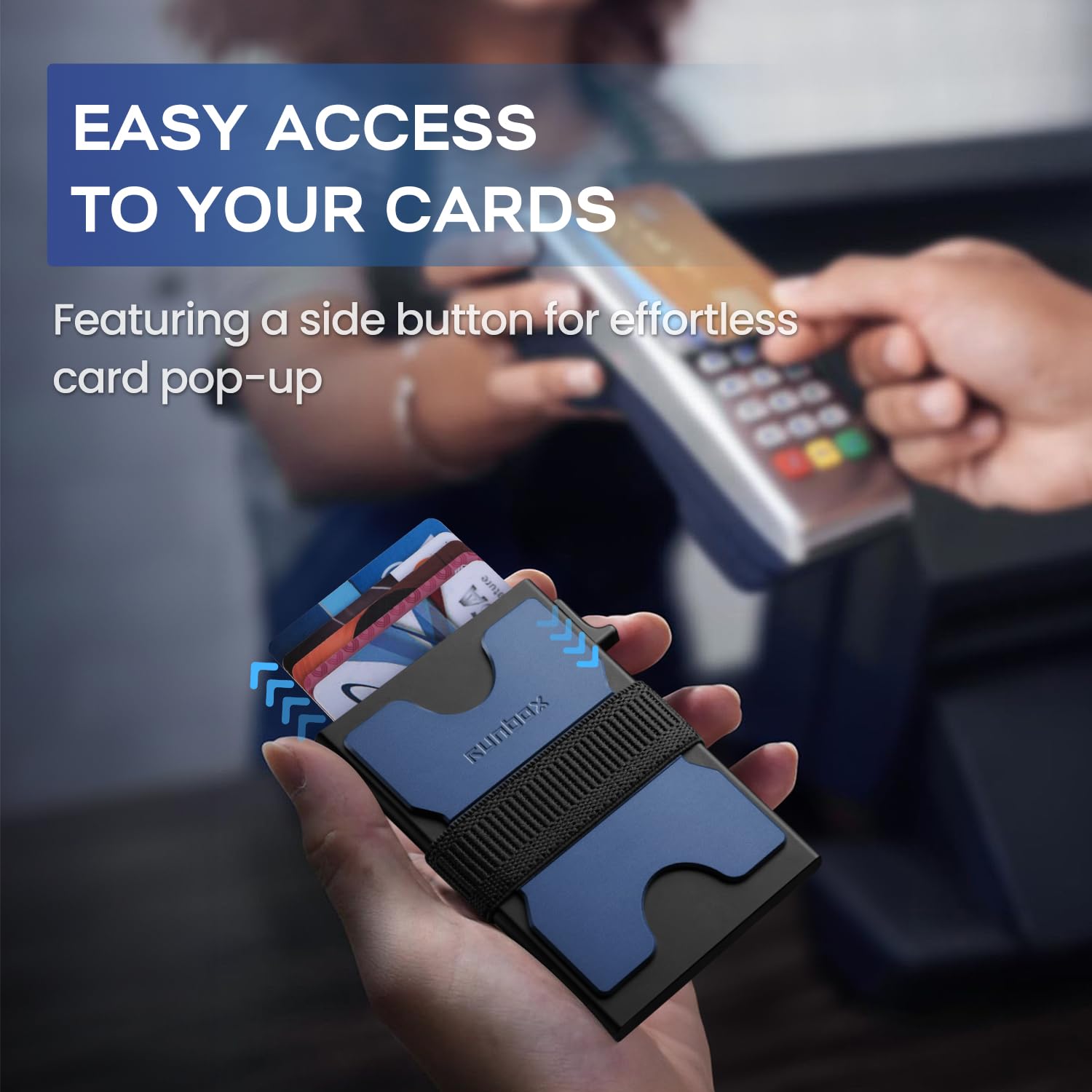 Quick Access & Expandable Capacity (Holds 1-12 Cards): Experience effortless card access with our patented pop-up button mechanism – press to instantly eject cards. The main aluminum card holder compartment holds 4-6 cards(depending on embossed designs), while the expandable metal backplate adds 6-8 extra slots. *Total capacity varies with card thickness